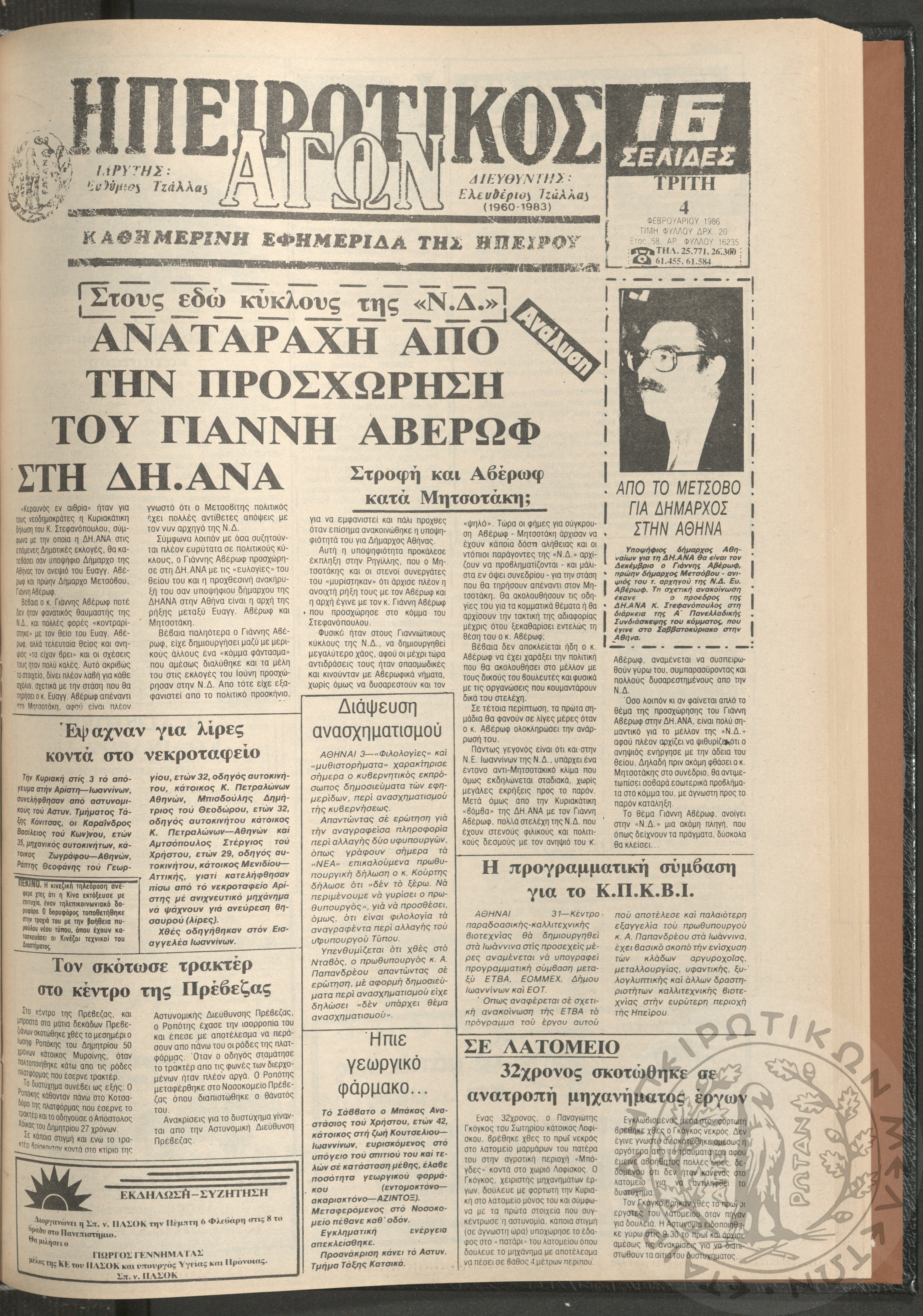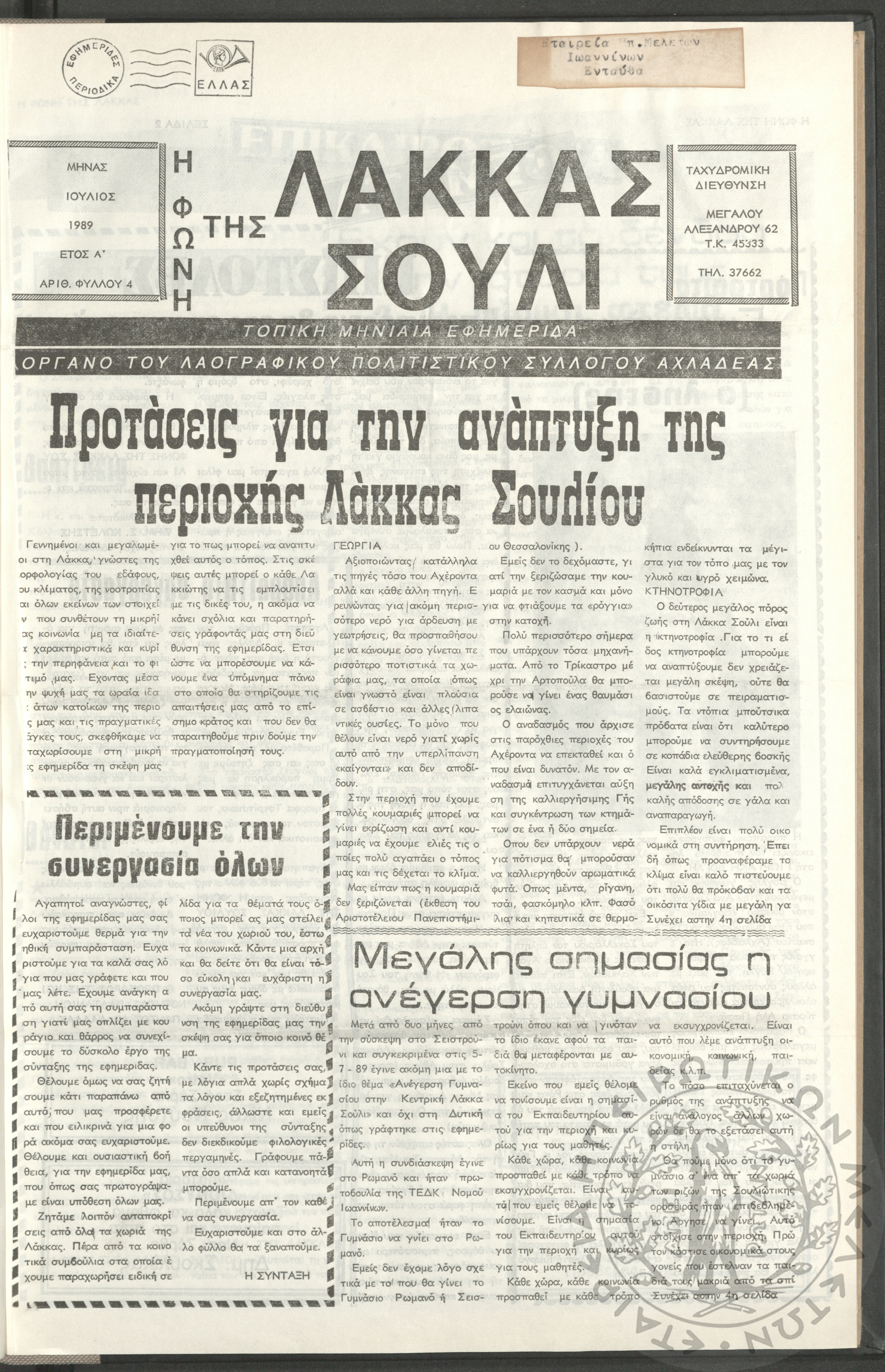 Η φωνή της Λάκκας Σούλι: τοπική μηνιαία εφημερίδα-Όργανο του Λαογραφικού Πολιτιστικού Συλλόγου Αχλαδέας, 1989, φ. 4Έτος Α΄, αρ. φ. 4...