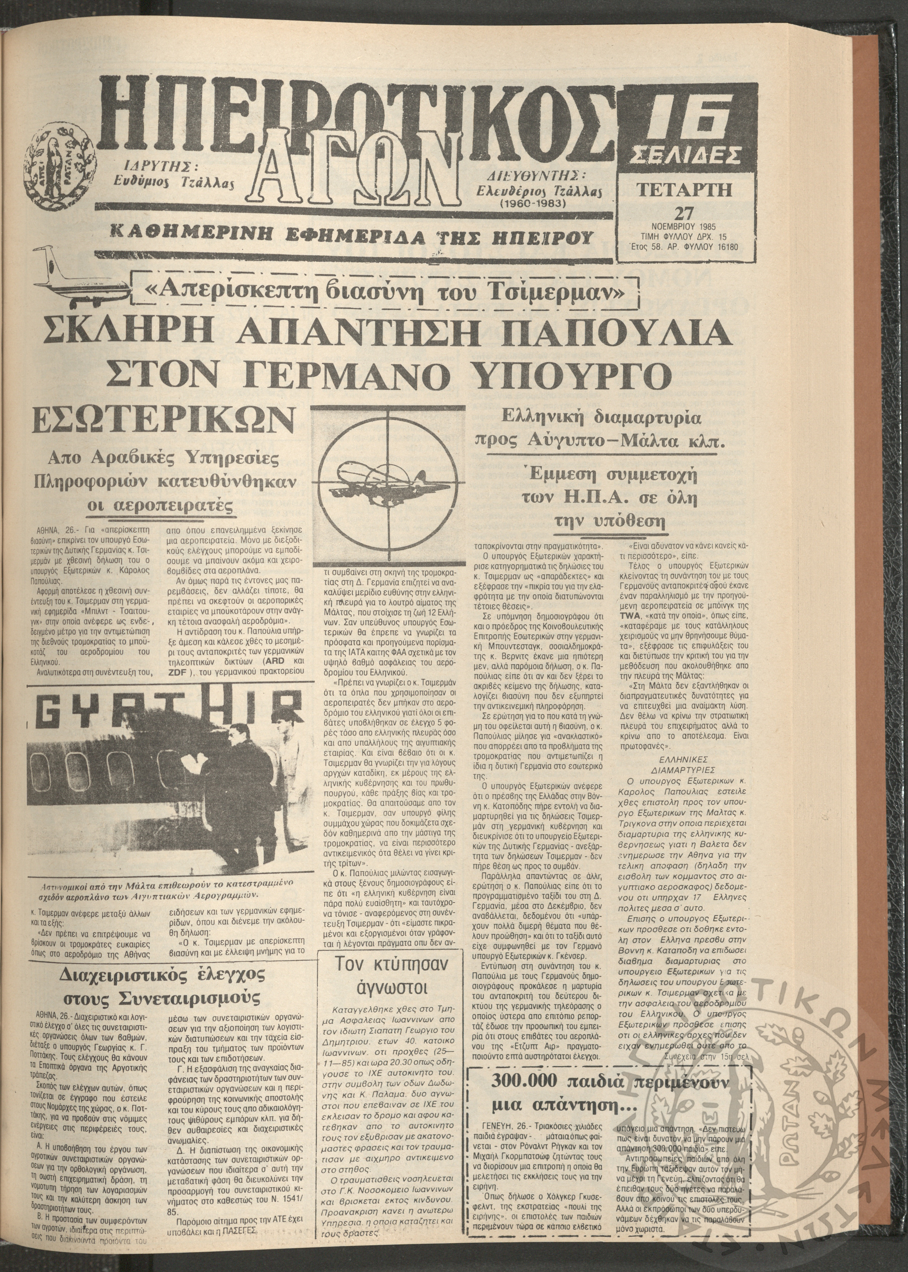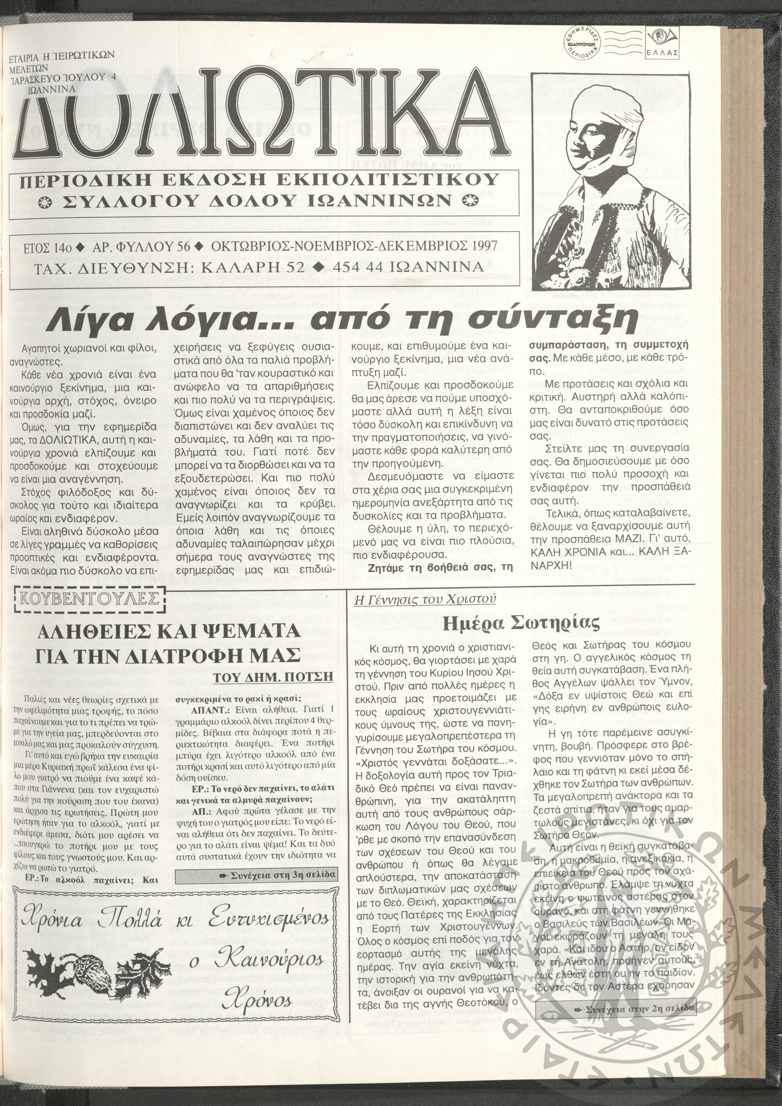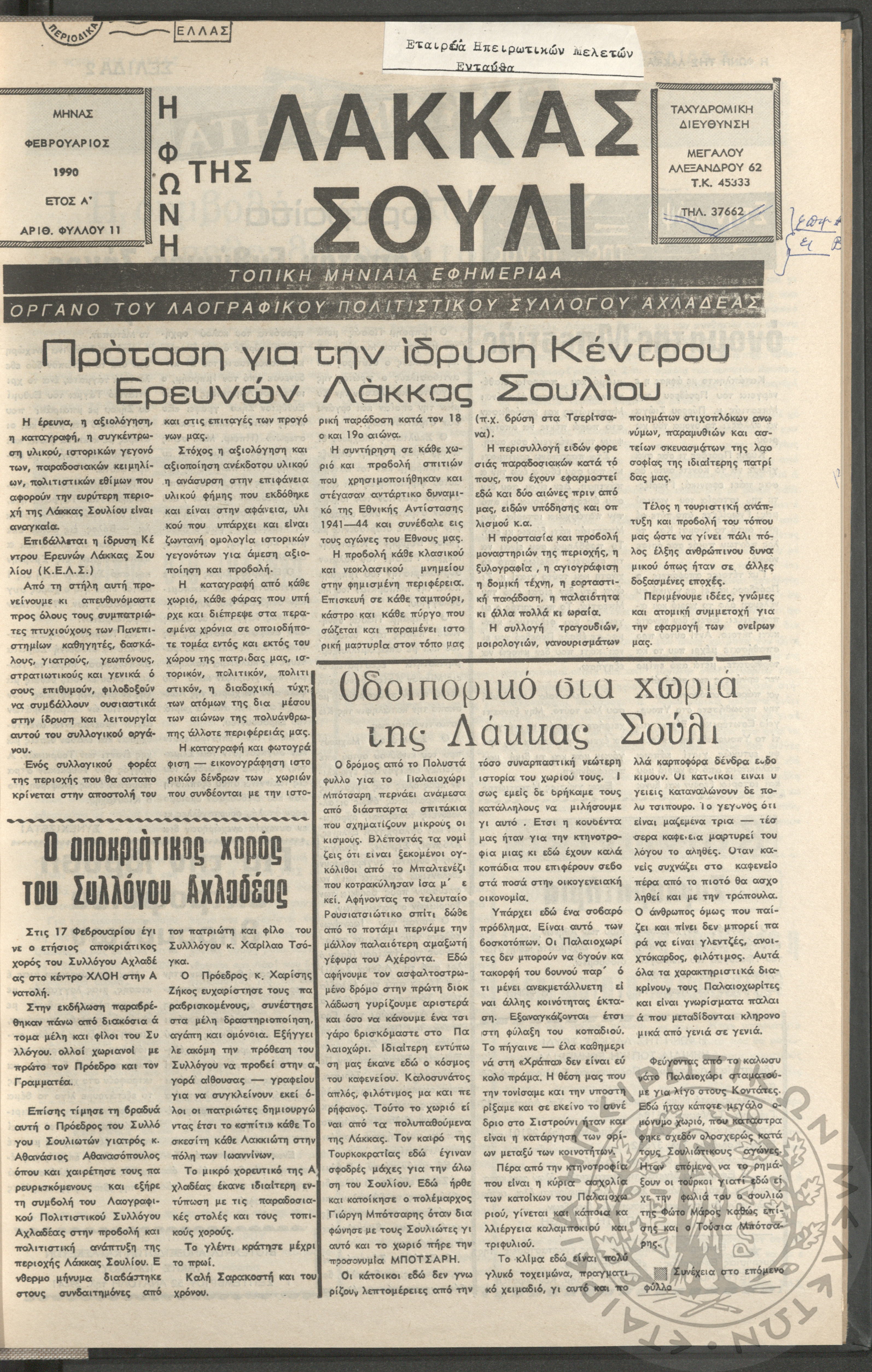 Η φωνή της Λάκκας Σούλι: τοπική μηνιαία εφημερίδα-Όργανο του Λαογραφικού Πολιτιστικού Συλλόγου Αχλαδέας, 1990, φ. 11Έτος Α΄, αρ. φ. 11...