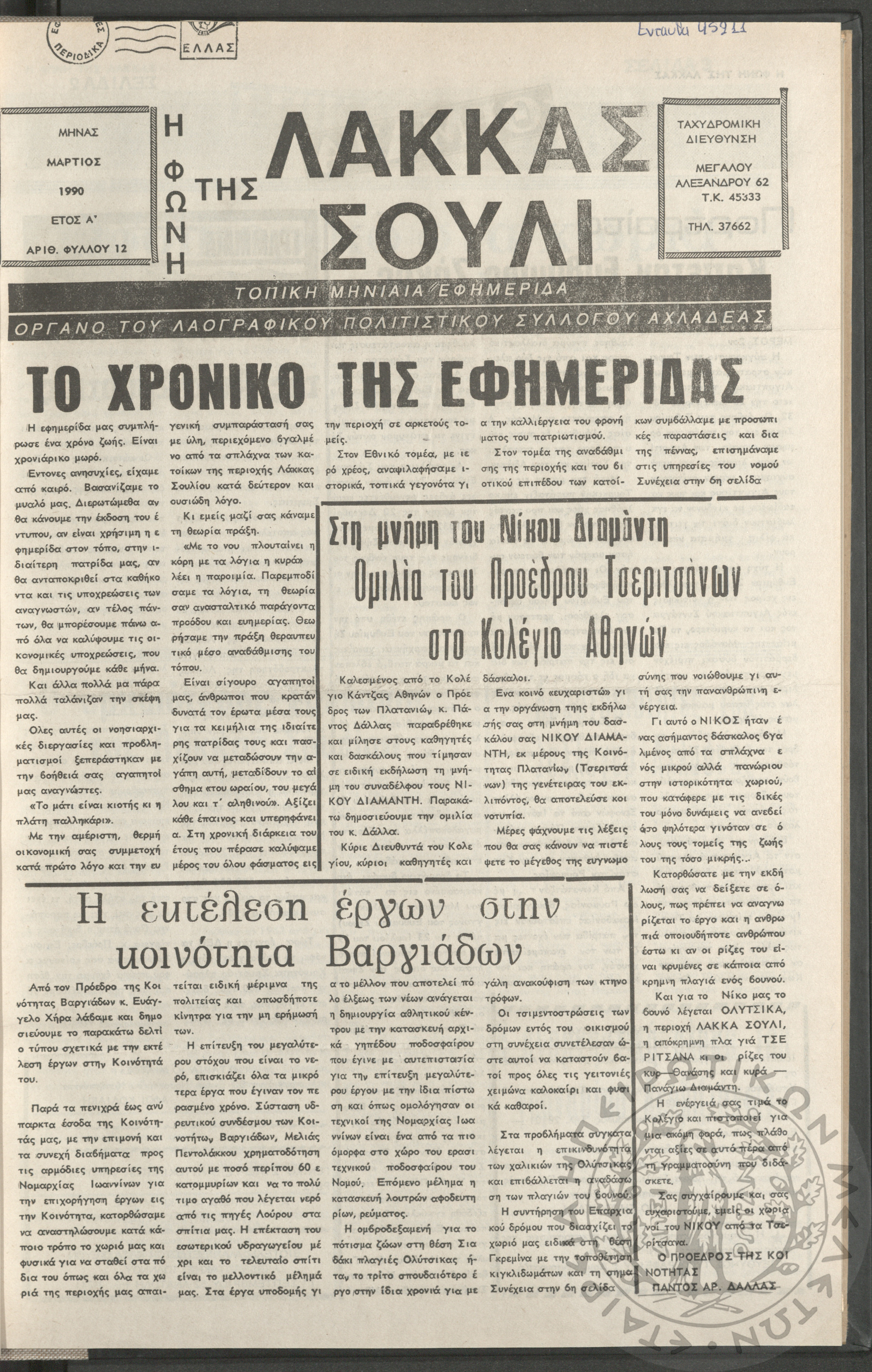 Η φωνή της Λάκκας Σούλι: τοπική μηνιαία εφημερίδα-Όργανο του Λαογραφικού Πολιτιστικού Συλλόγου Αχλαδέας, 1990, φ. 12Έτος Α΄, αρ. φ. 12...