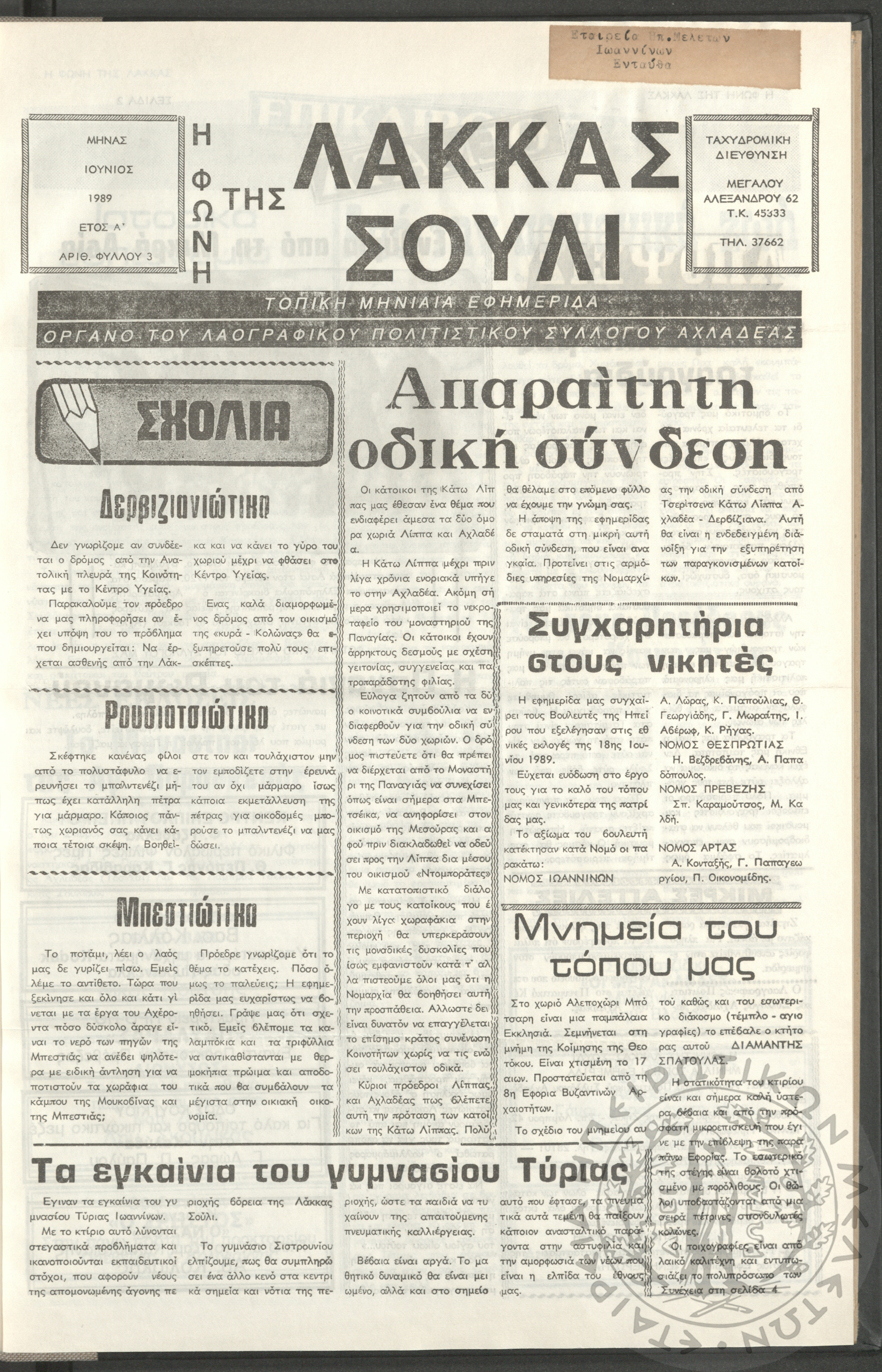 Η φωνή της Λάκκας Σούλι: τοπική μηνιαία εφημερίδα-Όργανο του Λαογραφικού Πολιτιστικού Συλλόγου Αχλαδέας, 1989, φ. 3Έτος Α΄, αρ. φ. 3...