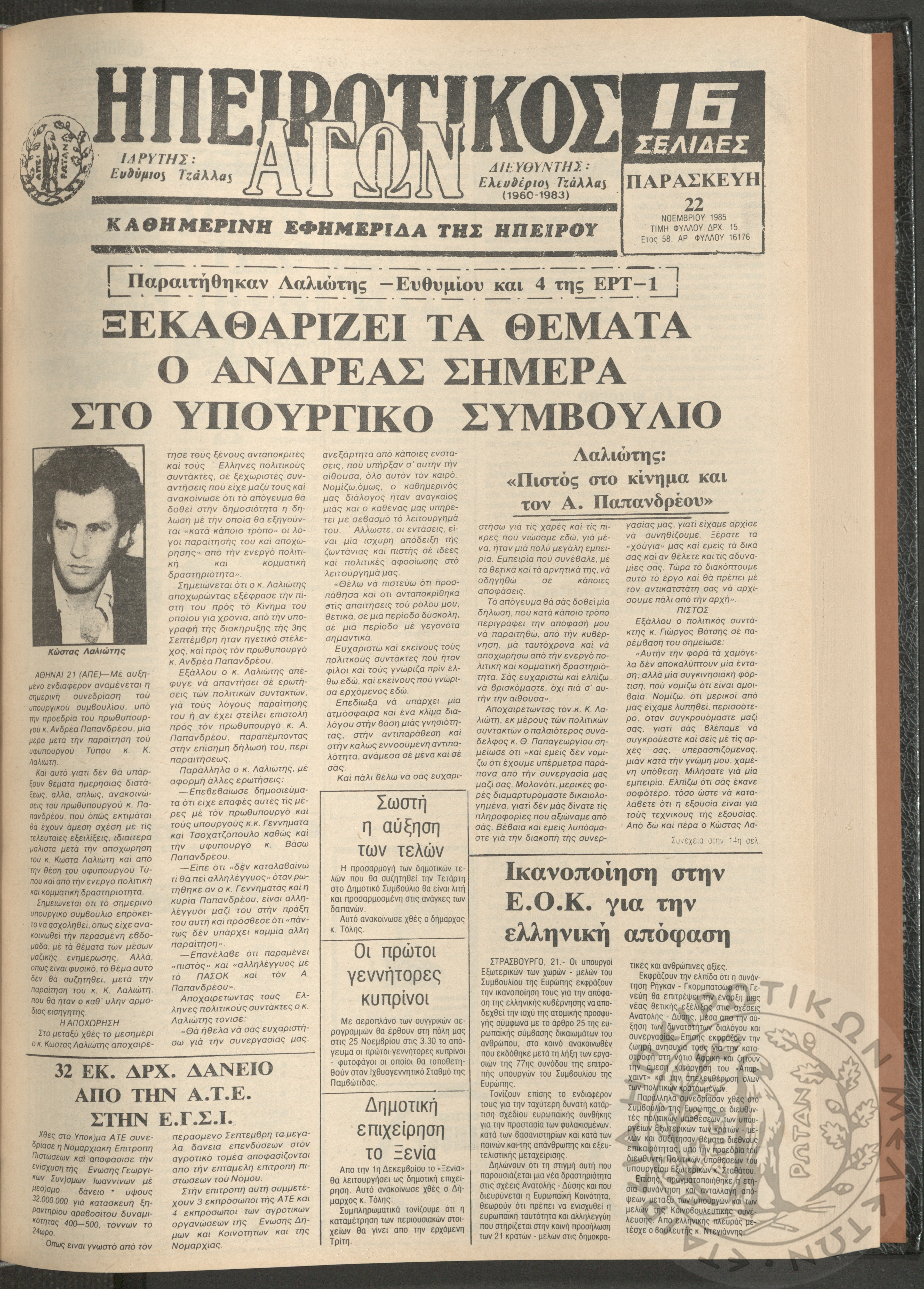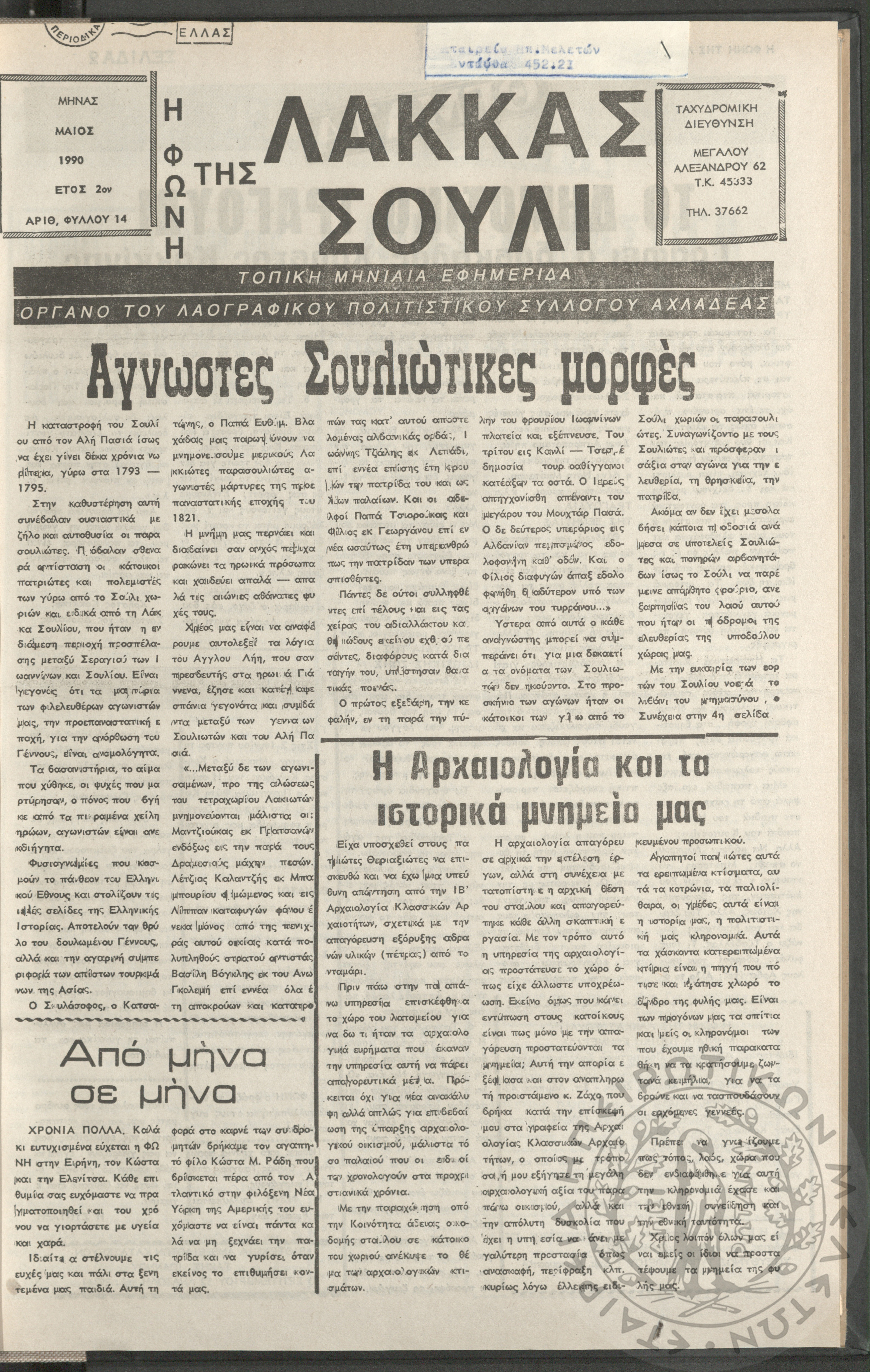 Η φωνή της Λάκκας Σούλι: τοπική μηνιαία εφημερίδα-Όργανο του Λαογραφικού Πολιτιστικού Συλλόγου Αχλαδέας, 1990, φ. 14Έτος 2ο, αρ. φ. 14...