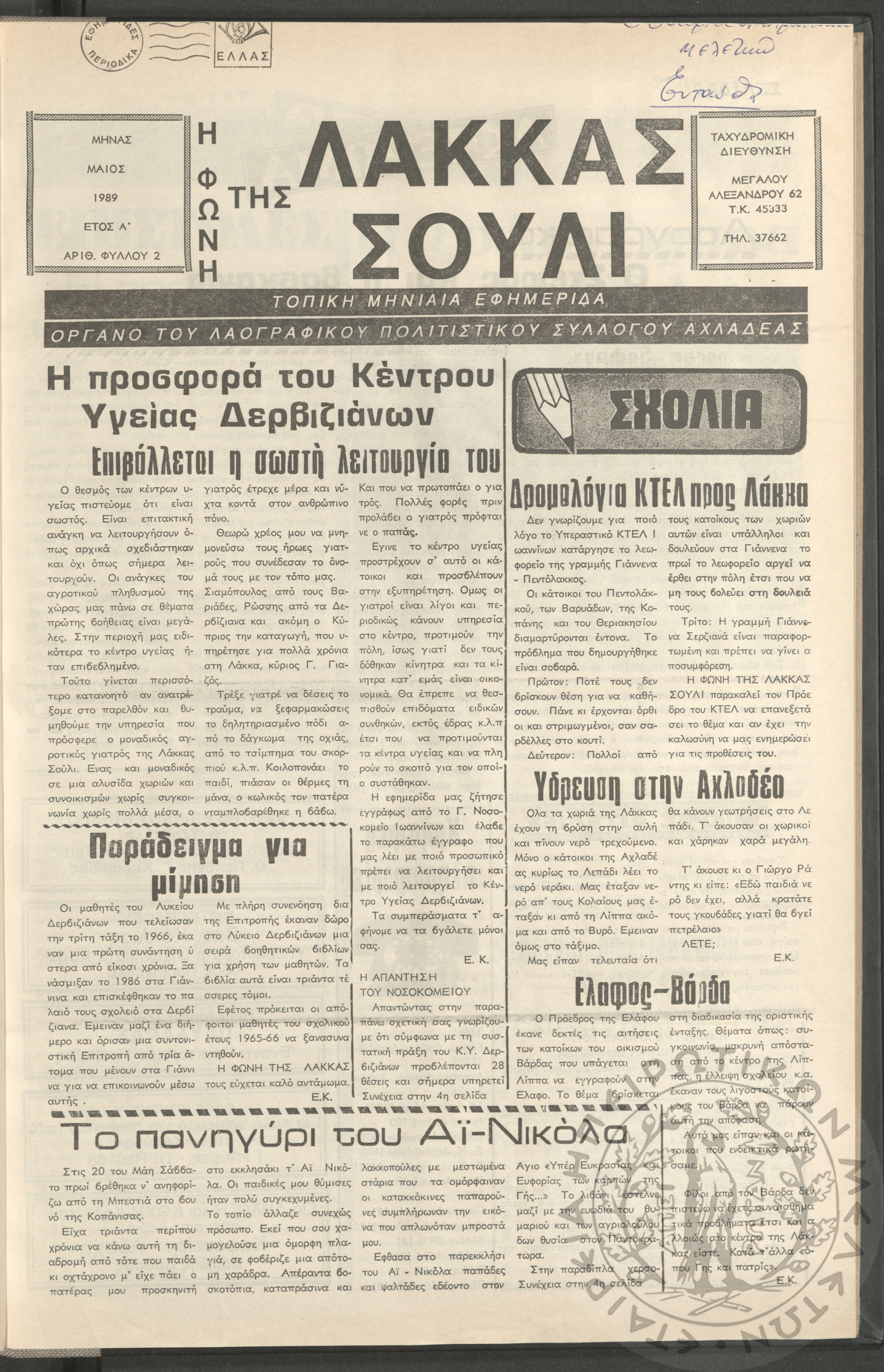 Η φωνή της Λάκκας Σούλι: τοπική μηνιαία εφημερίδα-Όργανο του Λαογραφικού Πολιτιστικού Συλλόγου Αχλαδέας, 1989, φ. 2Έτος Α΄, αρ. φ. 2...