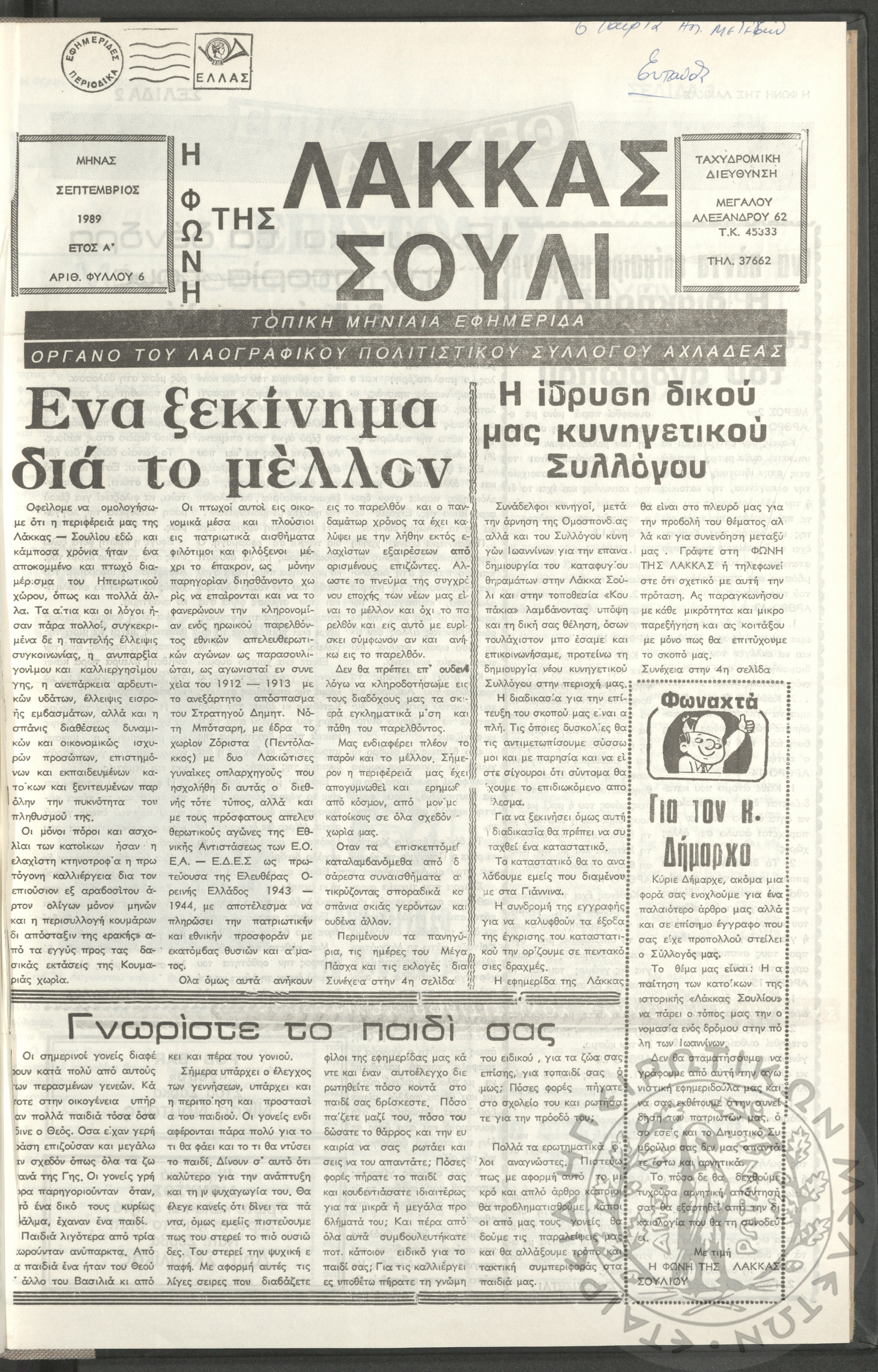 Η φωνή της Λάκκας Σούλι: τοπική μηνιαία εφημερίδα-Όργανο του Λαογραφικού Πολιτιστικού Συλλόγου Αχλαδέας, 1989, φ. 6Έτος Α΄, αρ. φ. 6...