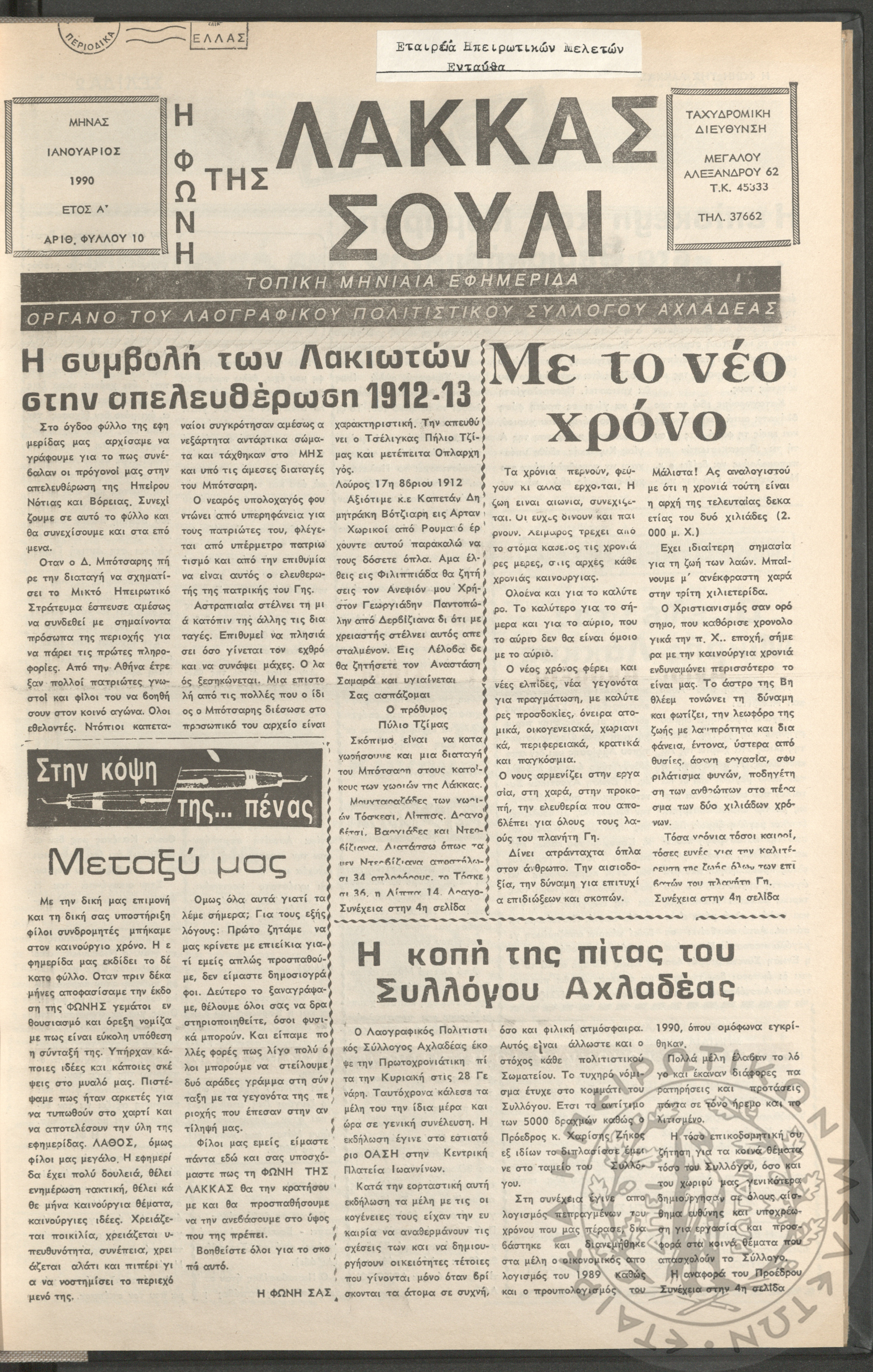 Η φωνή της Λάκκας Σούλι: τοπική μηνιαία εφημερίδα-Όργανο του Λαογραφικού Πολιτιστικού Συλλόγου Αχλαδέας, 1990, φ. 10Έτος Α΄, αρ. φ. 10...