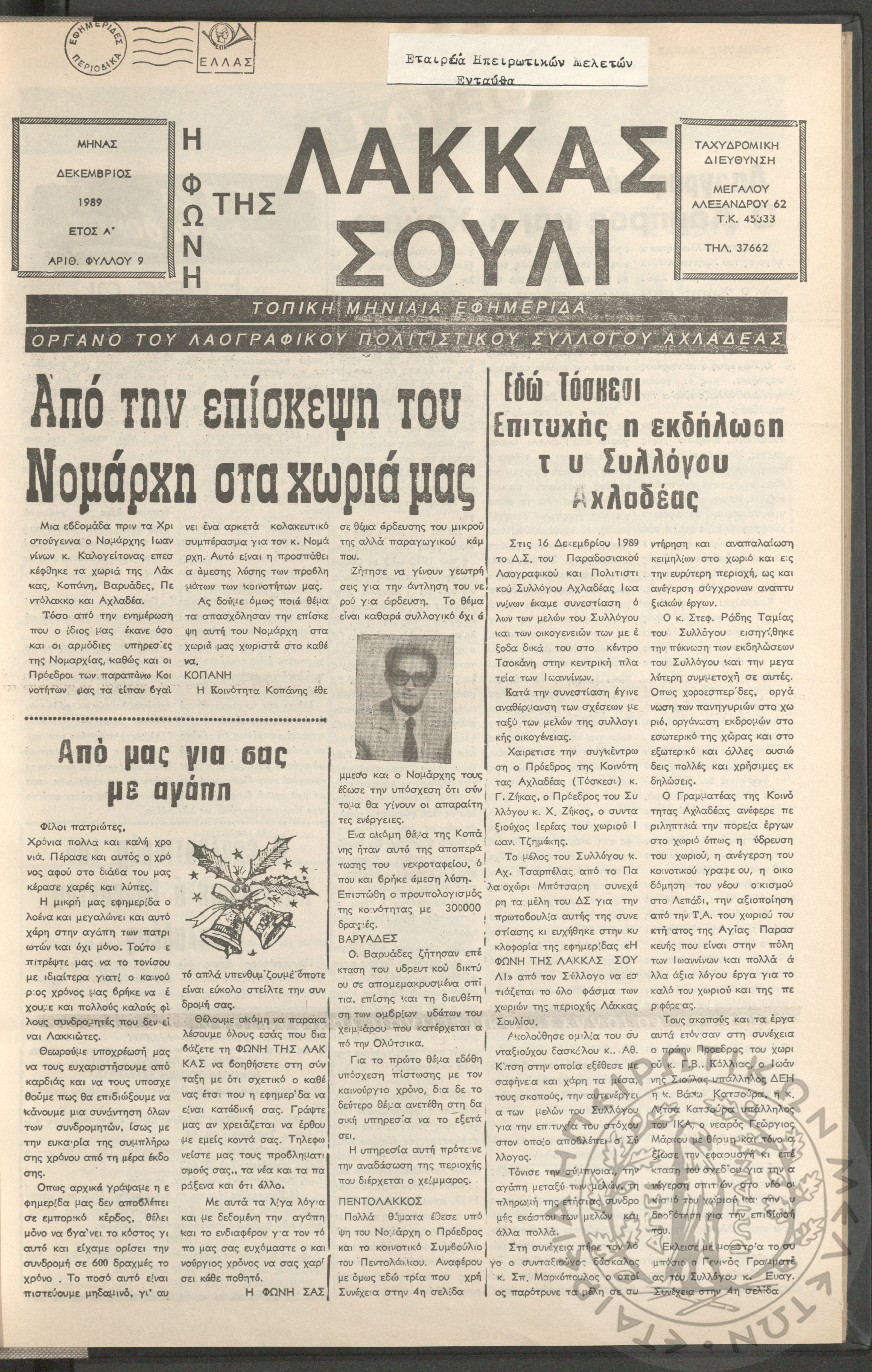 Η φωνή της Λάκκας Σούλι: τοπική μηνιαία εφημερίδα-Όργανο του Λαογραφικού Πολιτιστικού Συλλόγου Αχλαδέας, 1989, φ. 9Έτος Α΄, αρ. φ. 9...