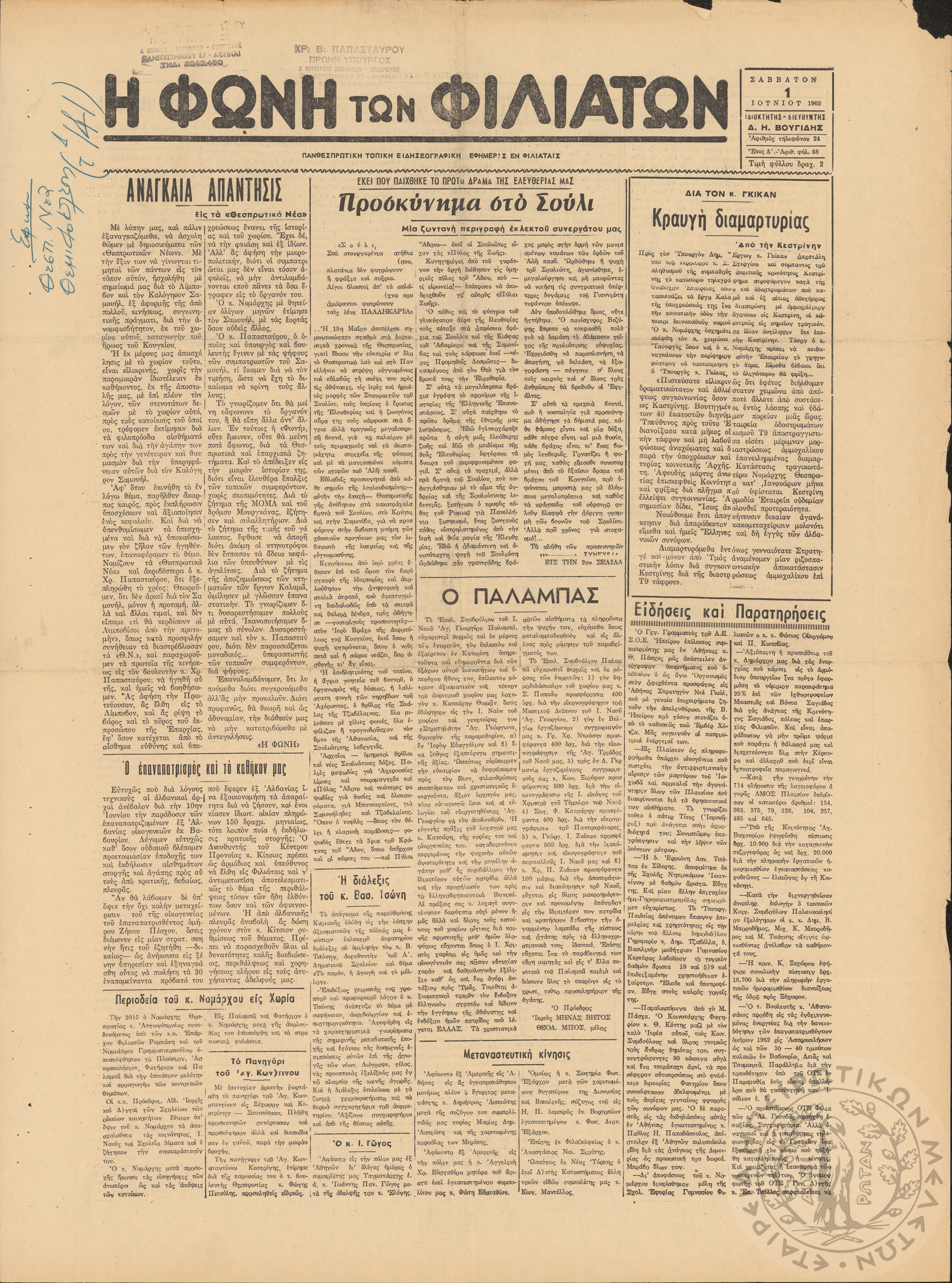Η φωνή των Φιλιατών: πανθεσπρωτική τοπική ειδησεογραφική εφημερίς εν Φιλιάταις, 1963, φ. 88Έτος Δ΄, αρ. φ. 88...