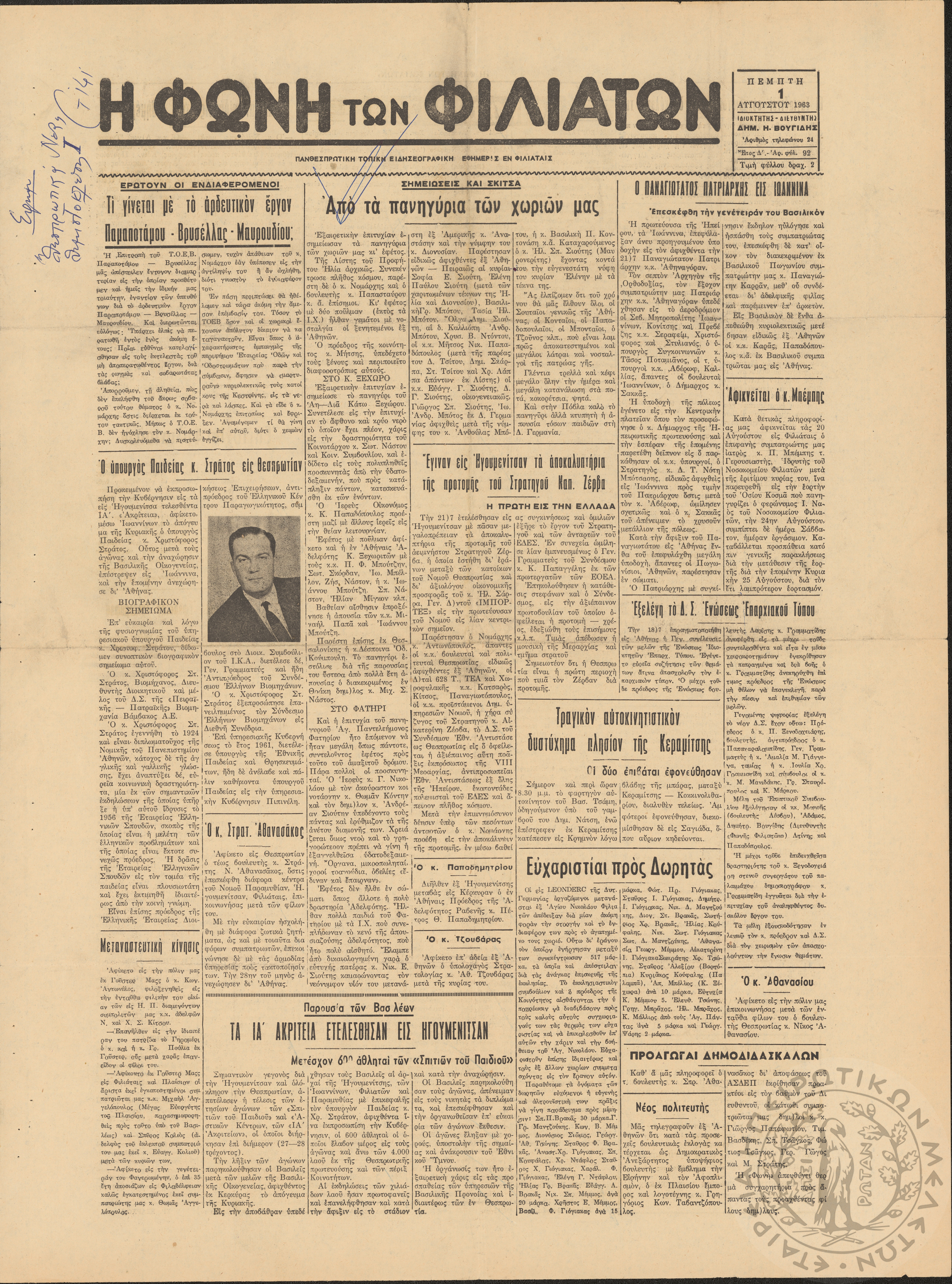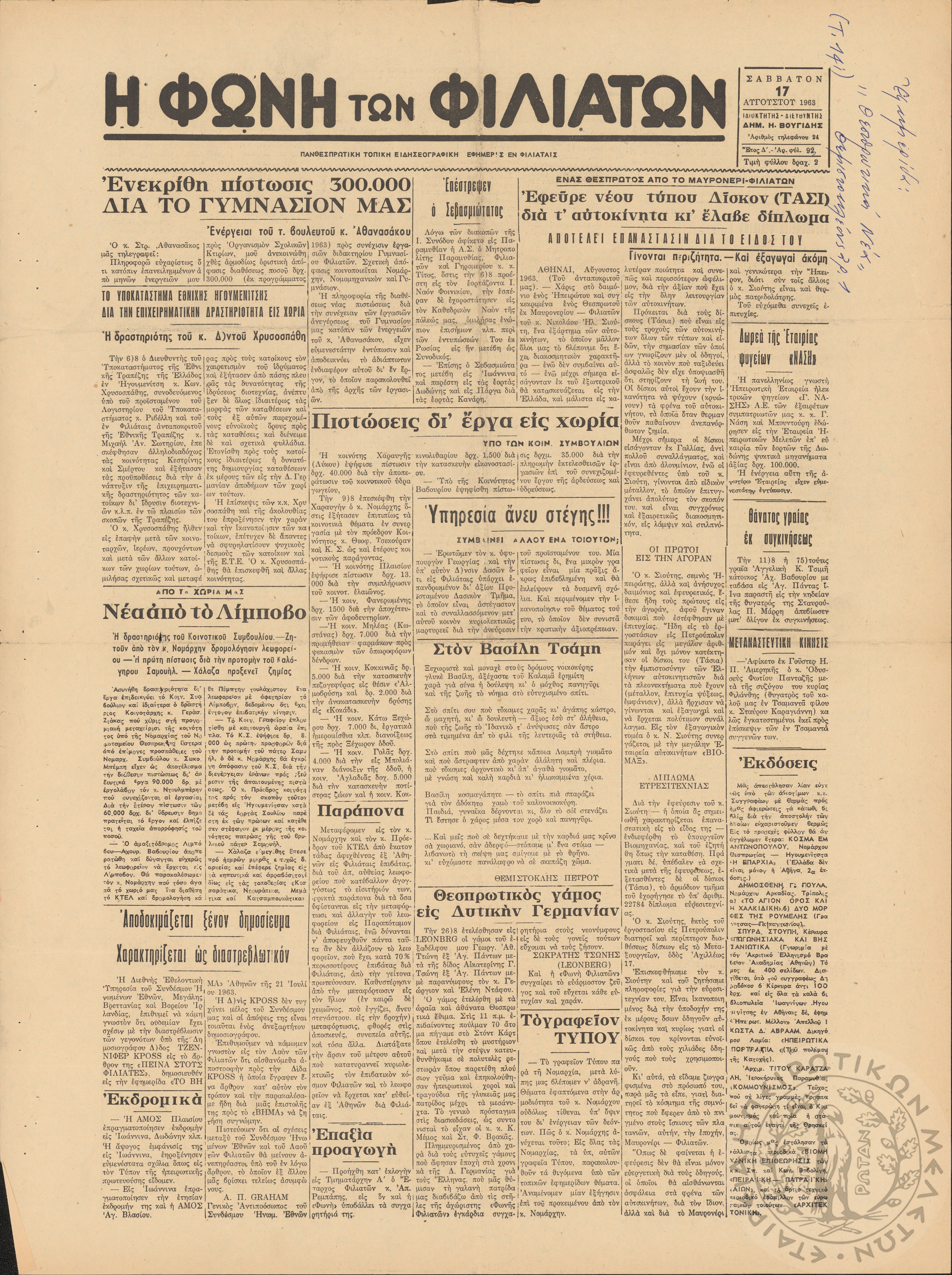 Η φωνή των Φιλιατών: πανθεσπρωτική τοπική ειδησεογραφική εφημερίς εν Φιλιάταις, 1963, φ. 92Έτος Δ΄, αρ. φ. 92...