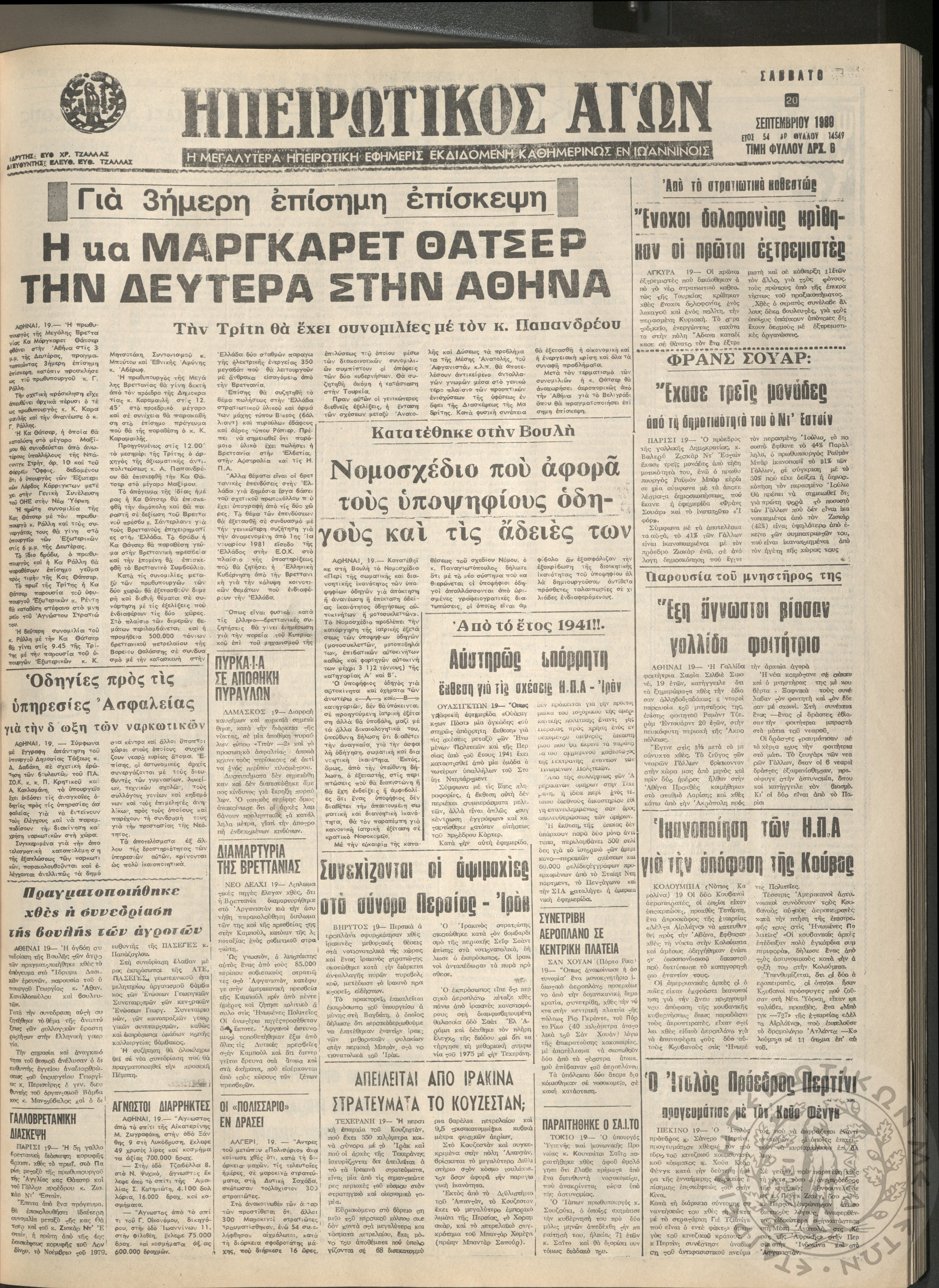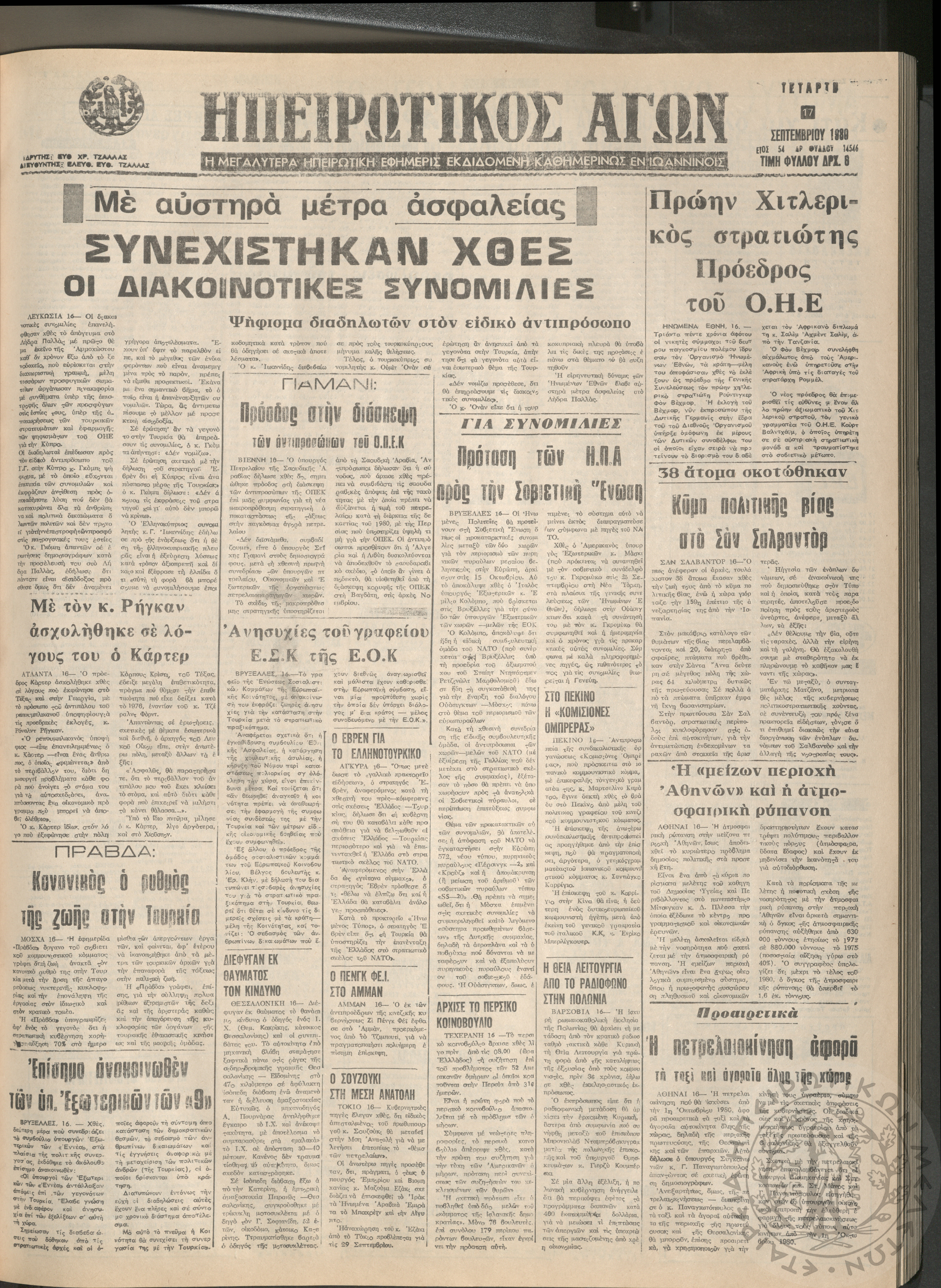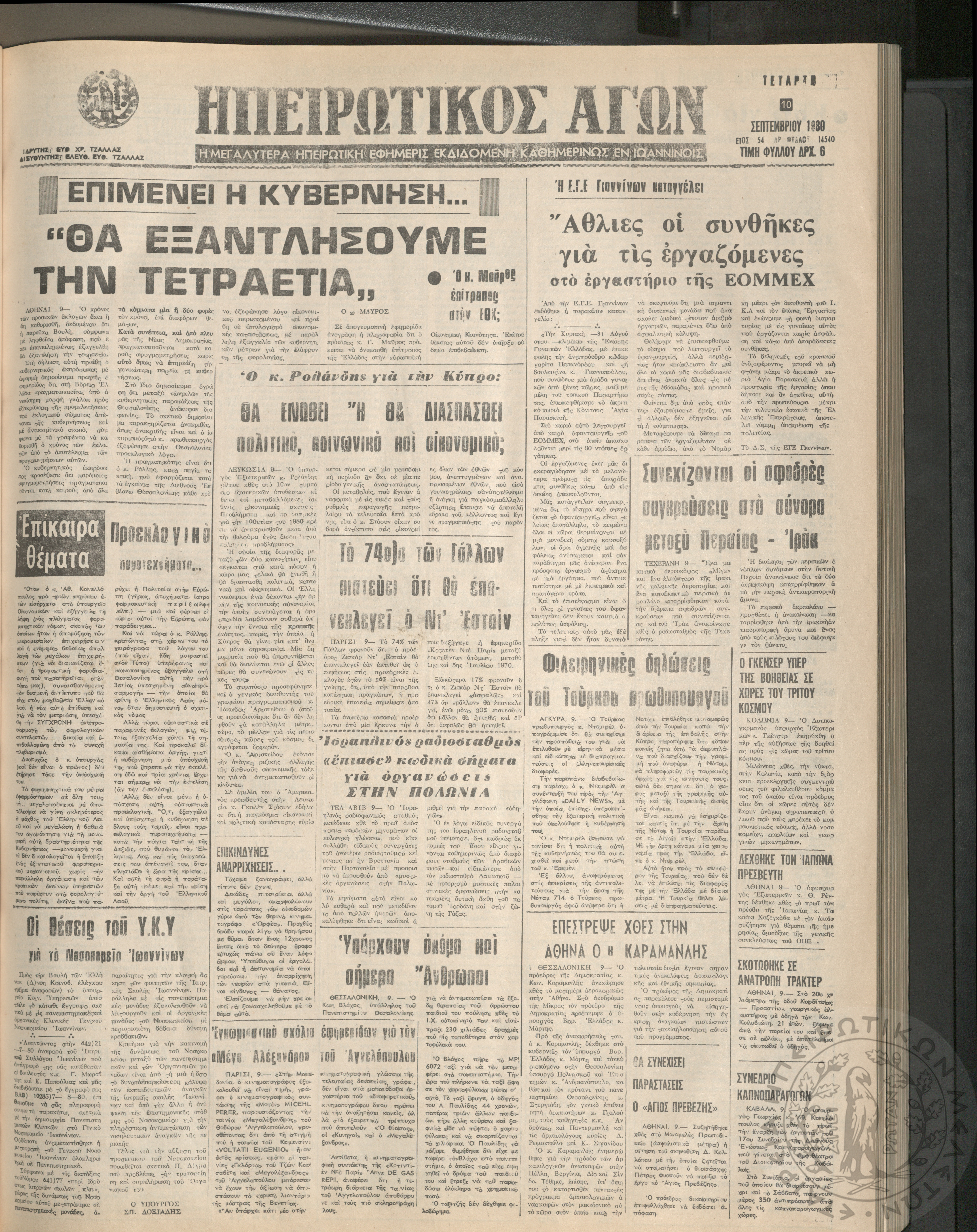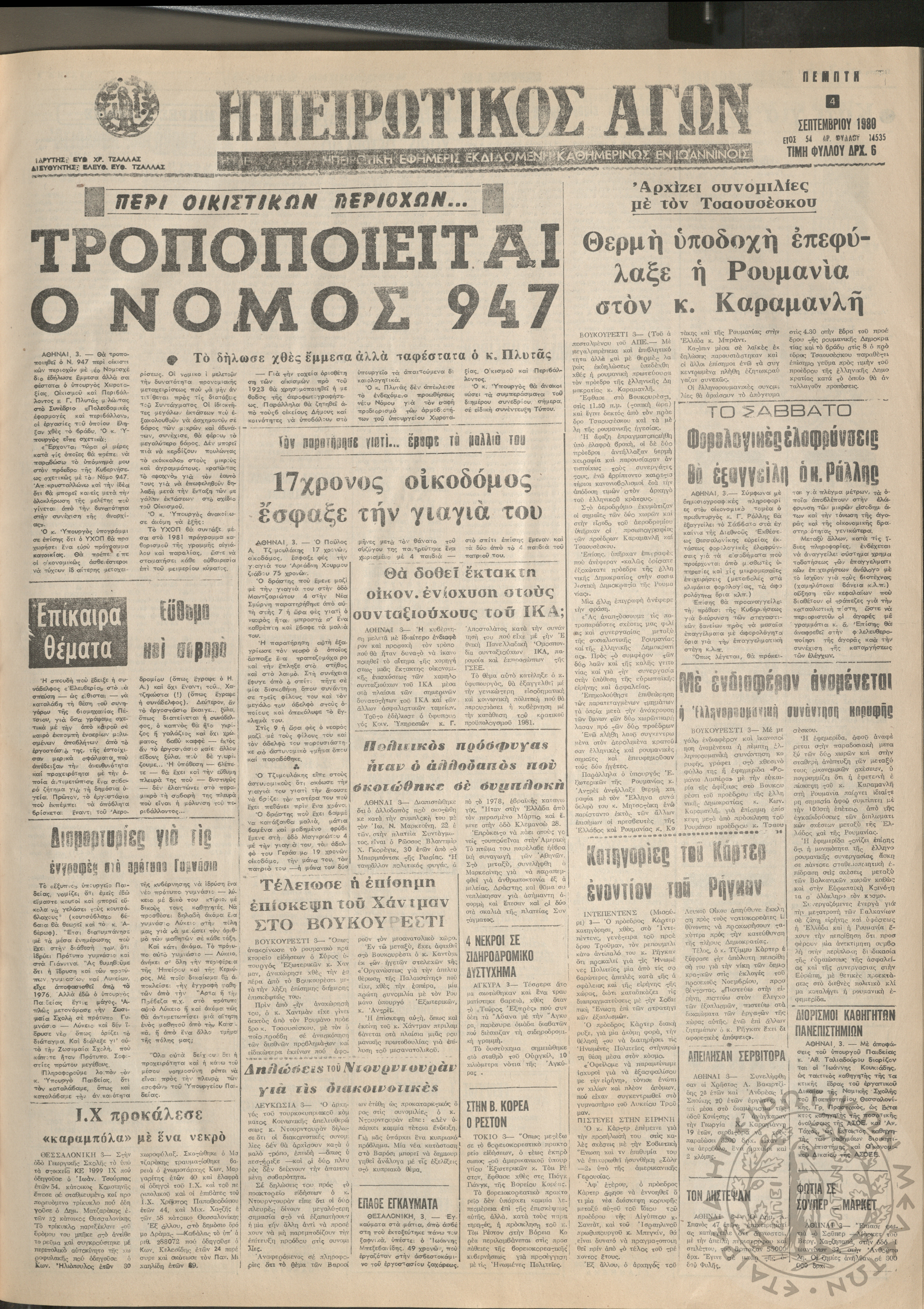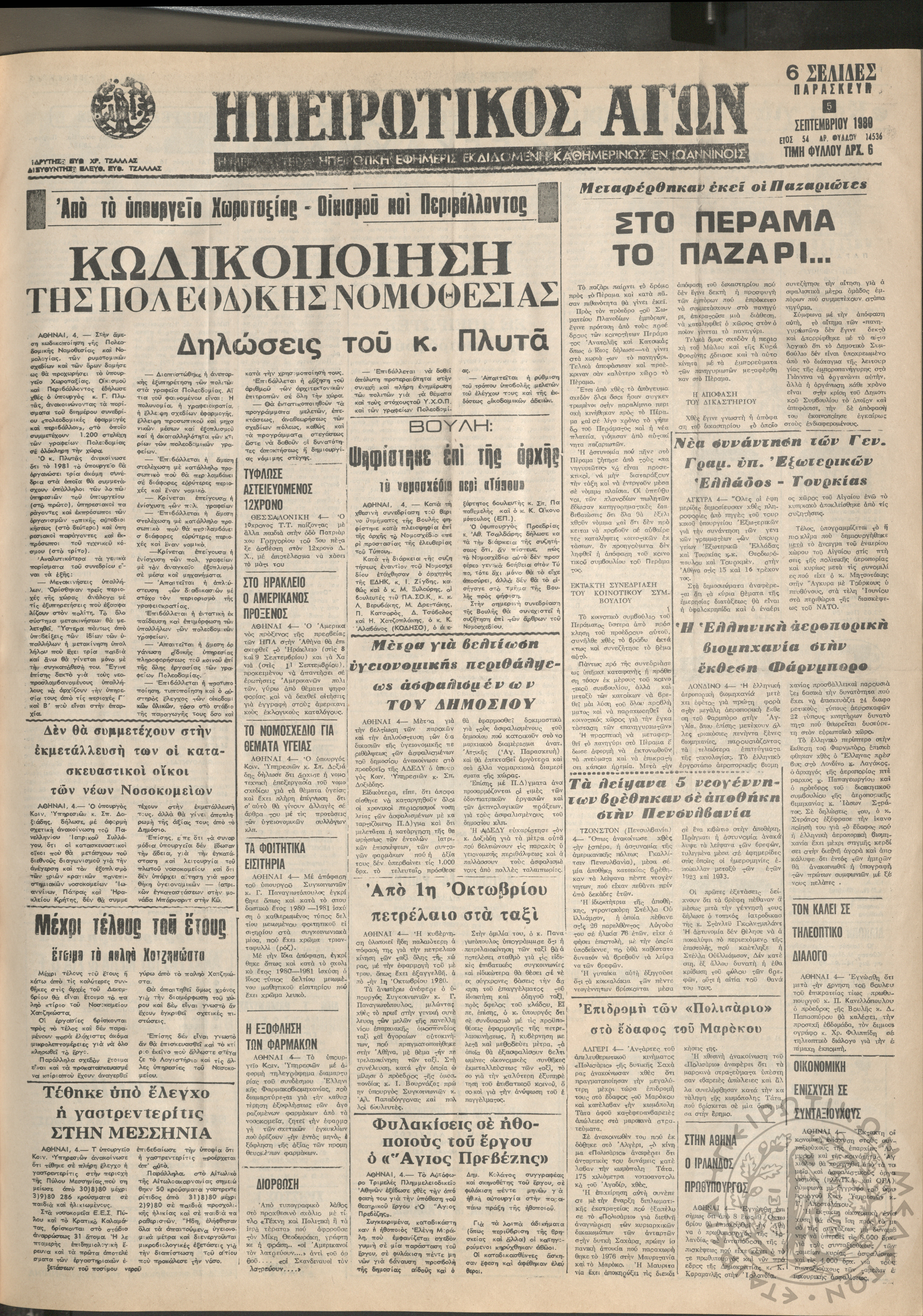 Ηπειρωτικός Αγών: η μεγαλυτέρα Ηπειρωτική εφημερίς εκδιδόμενη καθημερινώς εν Ιωαννίνοις, 1980, φ. 14547Έτος 54, φ. 14547...