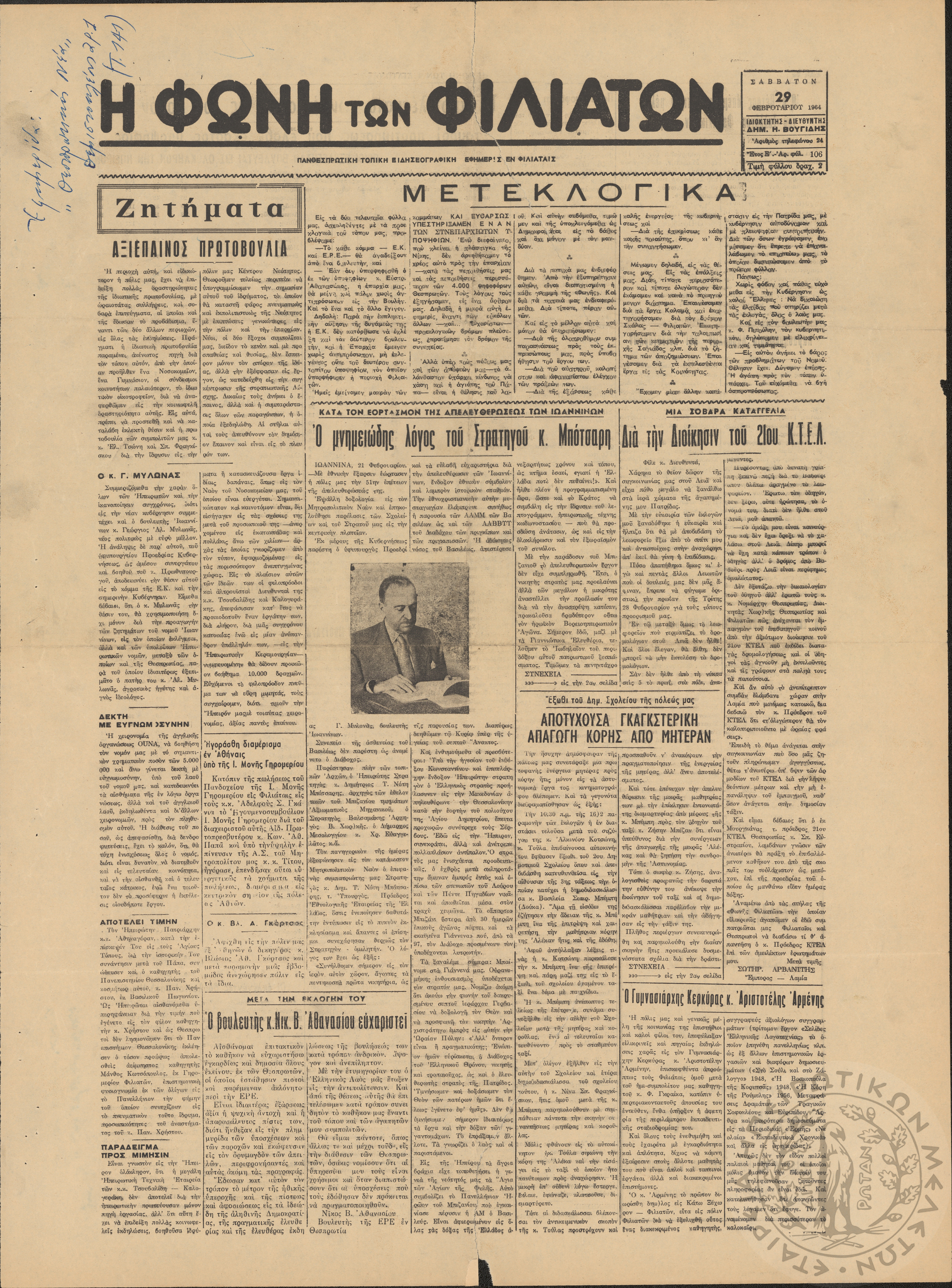 Η φωνή των Φιλιατών: πανθεσπρωτική τοπική ειδησεογραφική εφημερίς εν Φιλιάταις, 1964, φ. 106Έτος Ε΄, αρ. φ. 106...