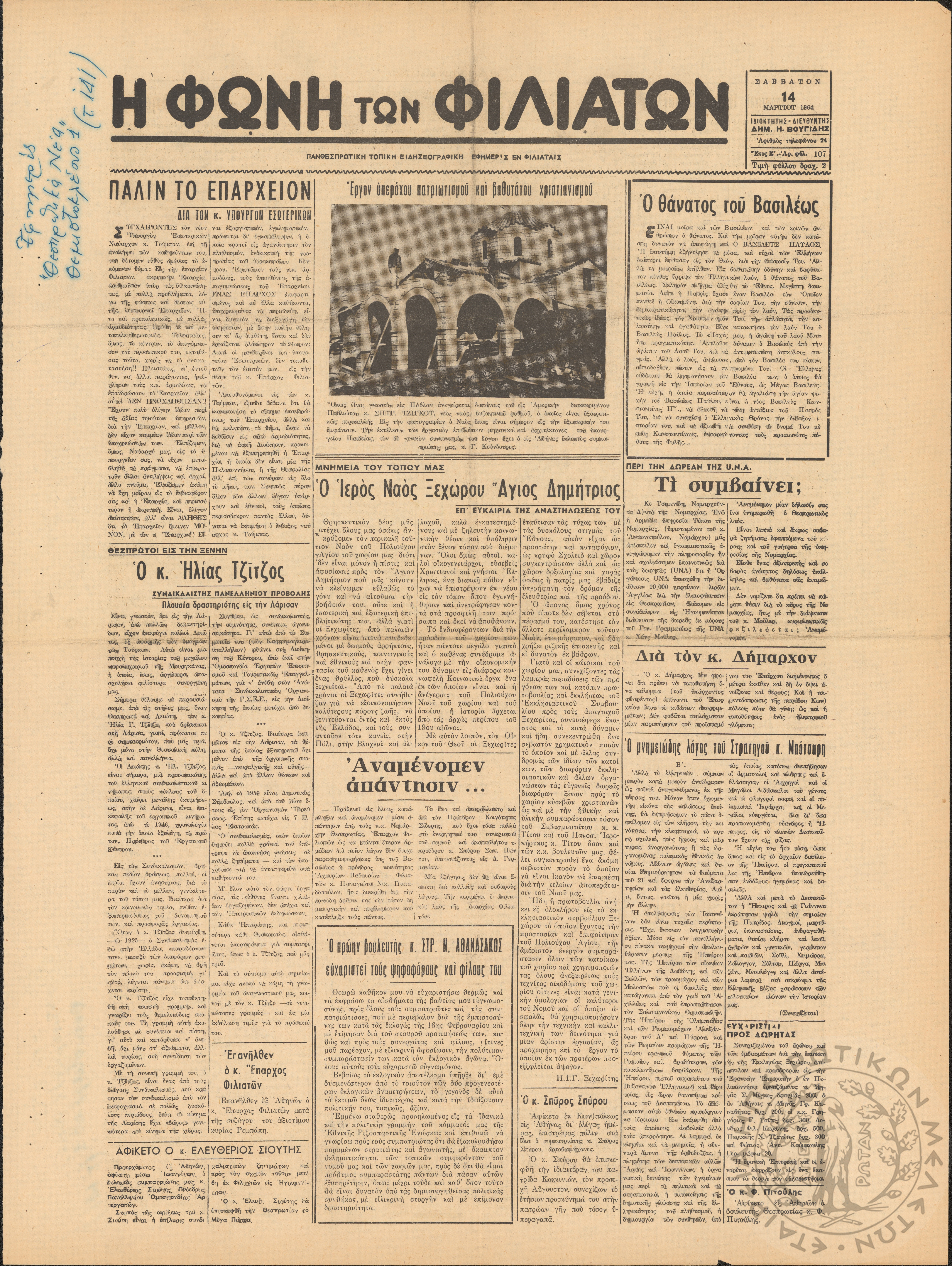 Η φωνή των Φιλιατών: πανθεσπρωτική τοπική ειδησεογραφική εφημερίς εν Φιλιάταις, 1964, φ. 107Έτος Ε΄, αρ. φ. 107...