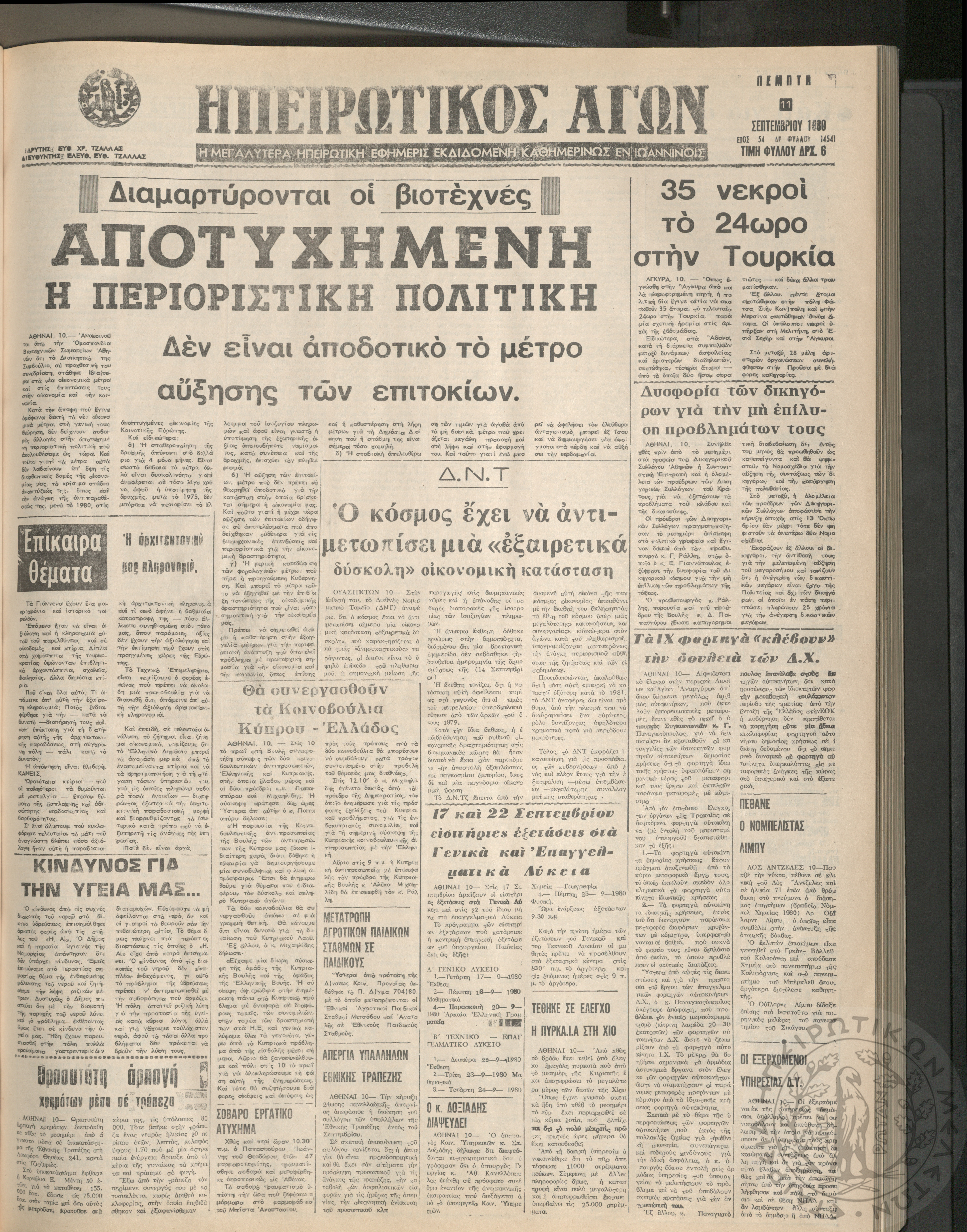 Ηπειρωτικός Αγών: η μεγαλυτέρα Ηπειρωτική εφημερίς εκδιδόμενη καθημερινώς εν Ιωαννίνοις, 1980, φ. 14535Έτος 54, φ. 14535...