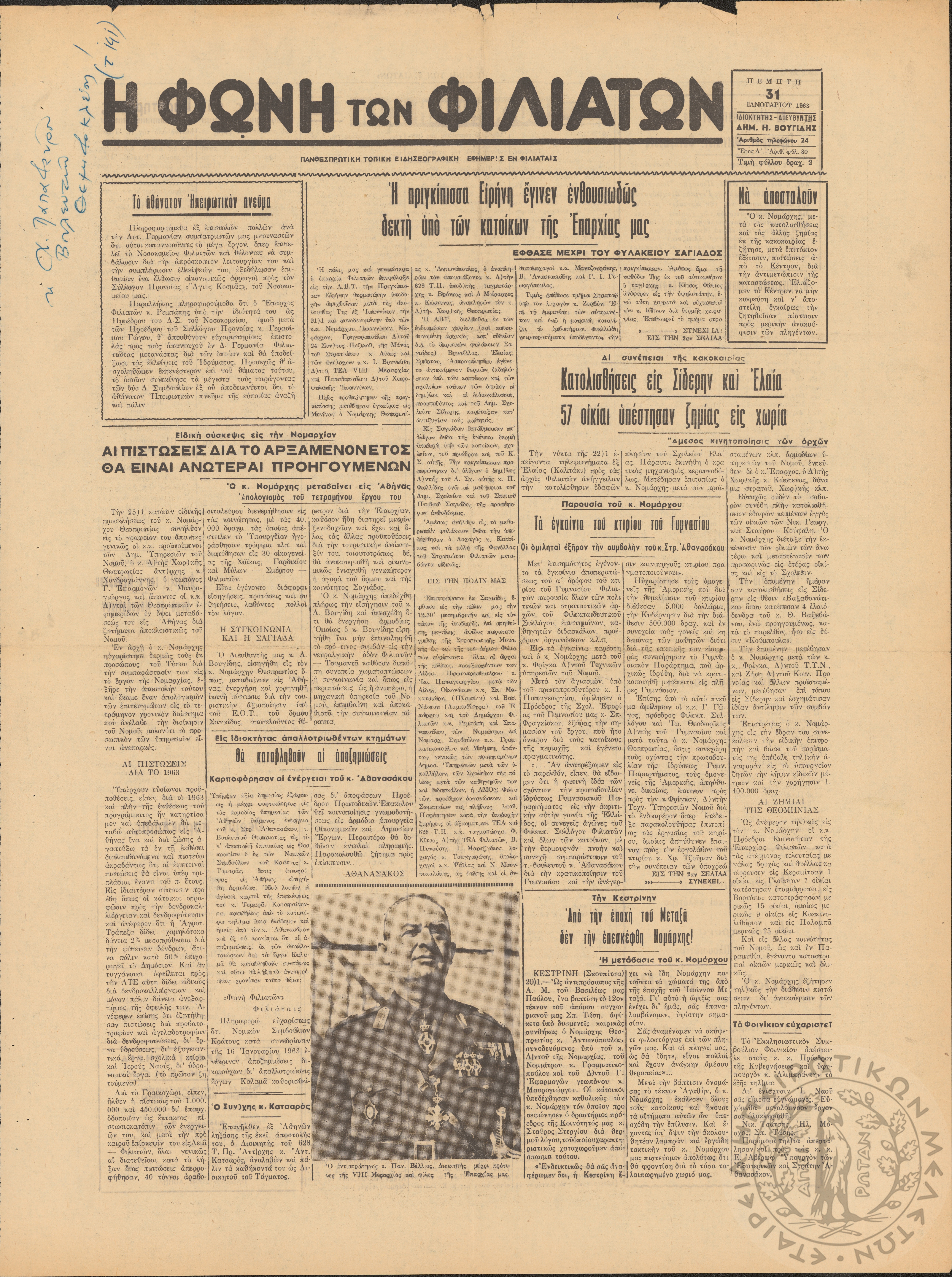 Η φωνή των Φιλιατών: πανθεσπρωτική τοπική ειδησεογραφική εφημερίς εν Φιλιάταις, 1963, φ. 80Έτος Δ΄, αρ. φ. 80...