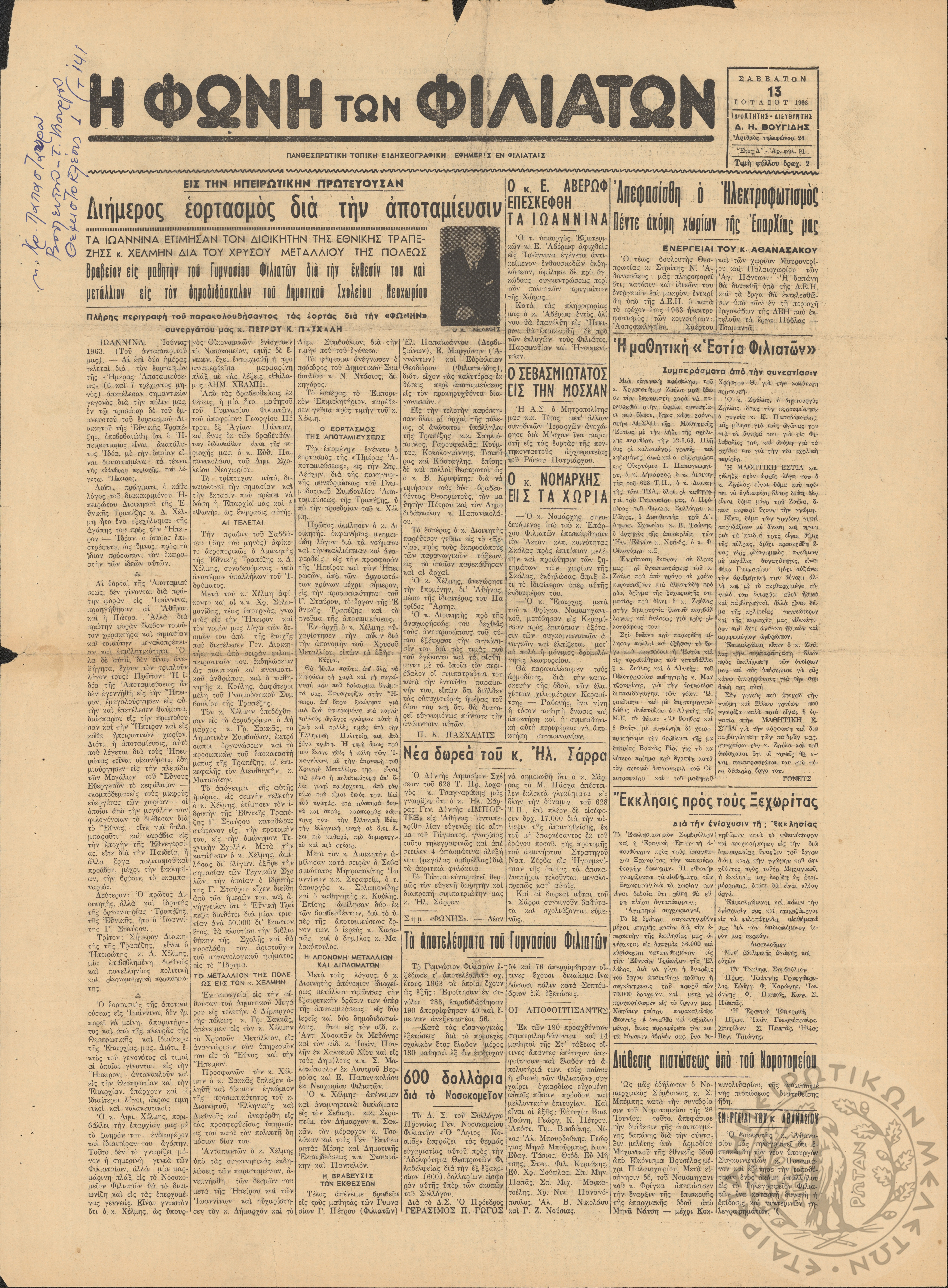 Η φωνή των Φιλιατών: πανθεσπρωτική τοπική ειδησεογραφική εφημερίς εν Φιλιάταις, 1963, φ. 91Έτος Δ΄, αρ. φ. 91...