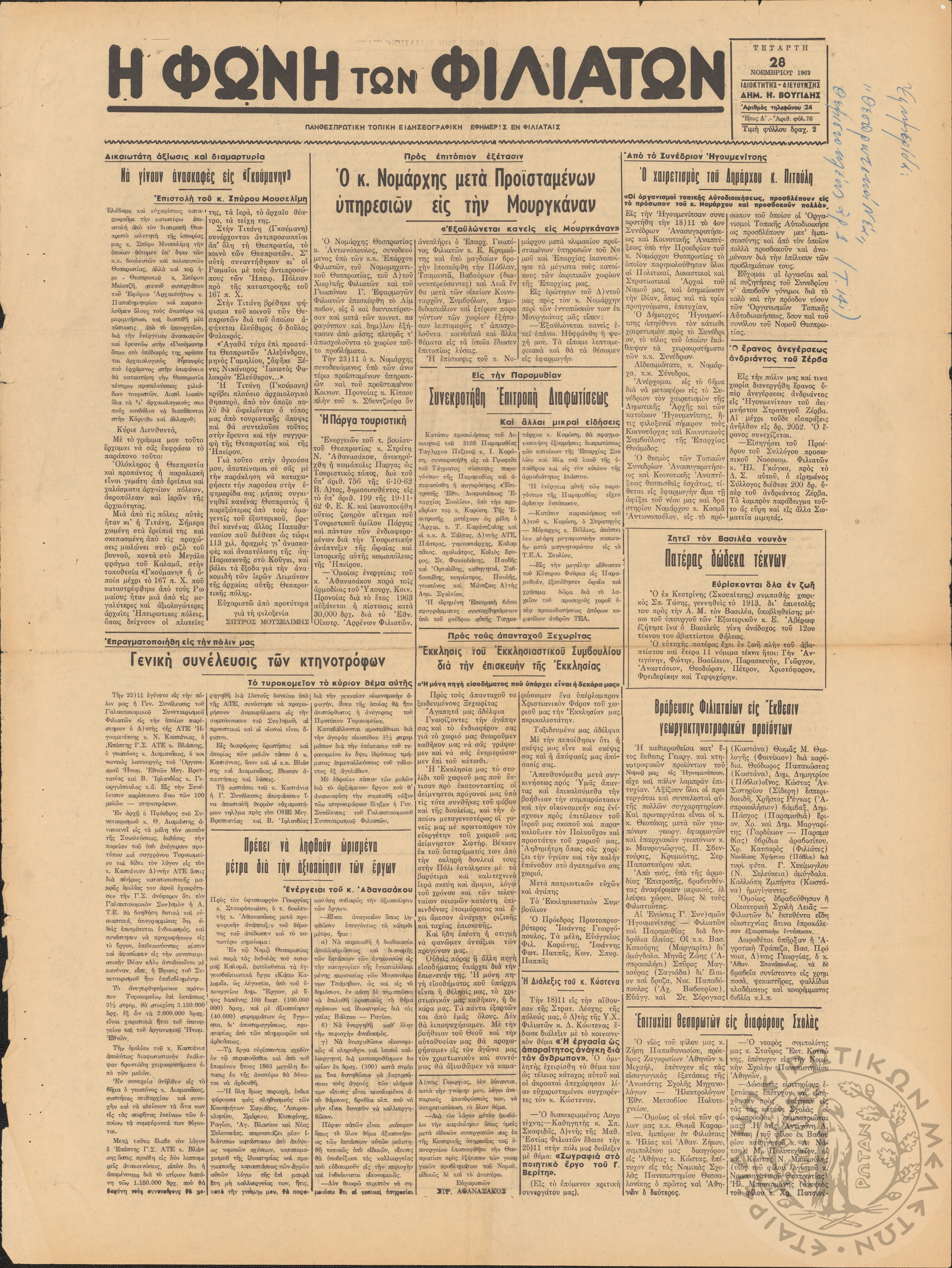 Η φωνή των Φιλιατών: πανθεσπρωτική τοπική ειδησεογραφική εφημερίς εν Φιλιάταις, 1962, φ. 76Έτος Δ΄, αρ. φ. 76...