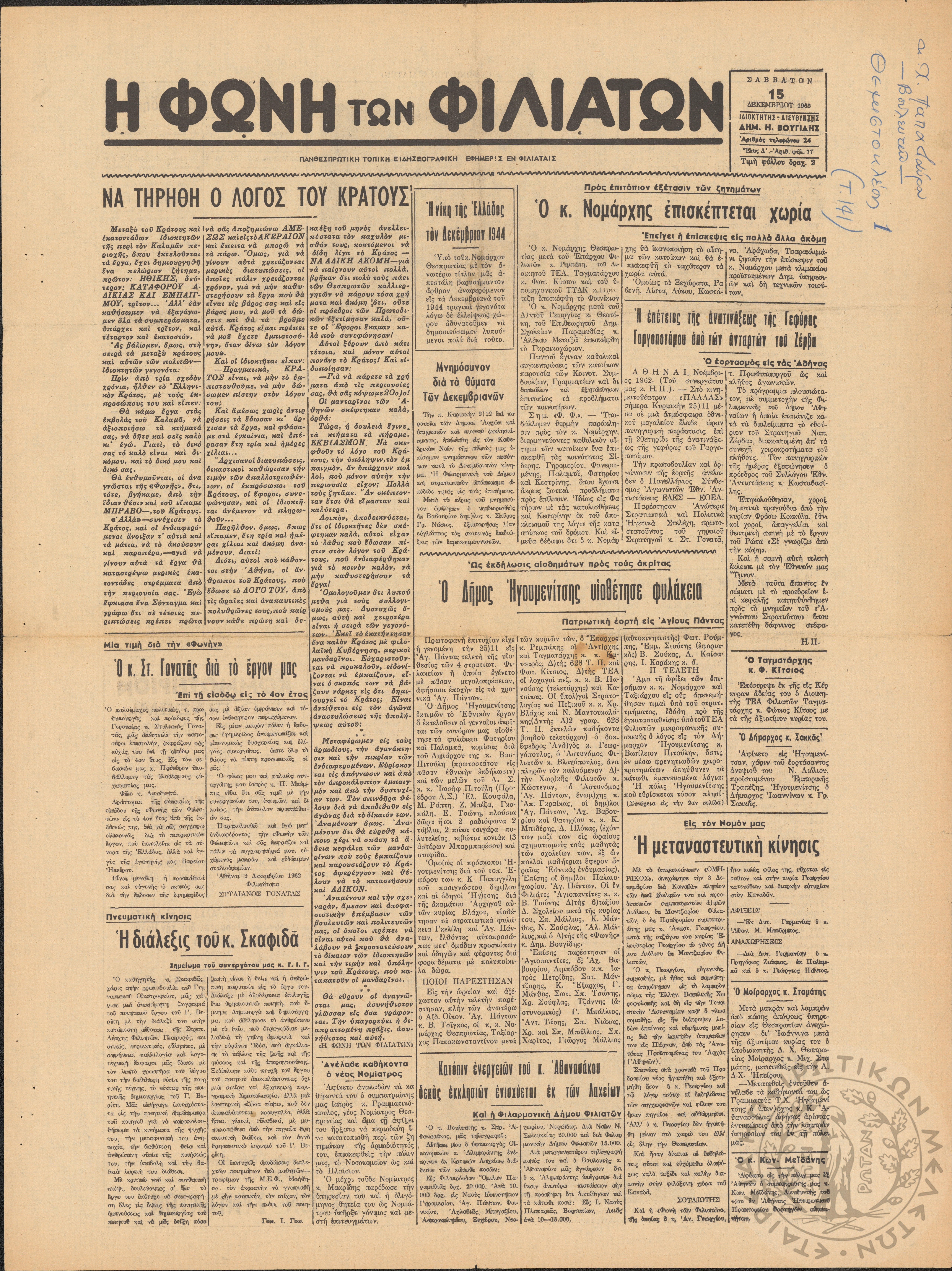 Η φωνή των Φιλιατών: πανθεσπρωτική τοπική ειδησεογραφική εφημερίς εν Φιλιάταις, 1962, φ. 77Έτος Δ΄, αρ. φ. 77...