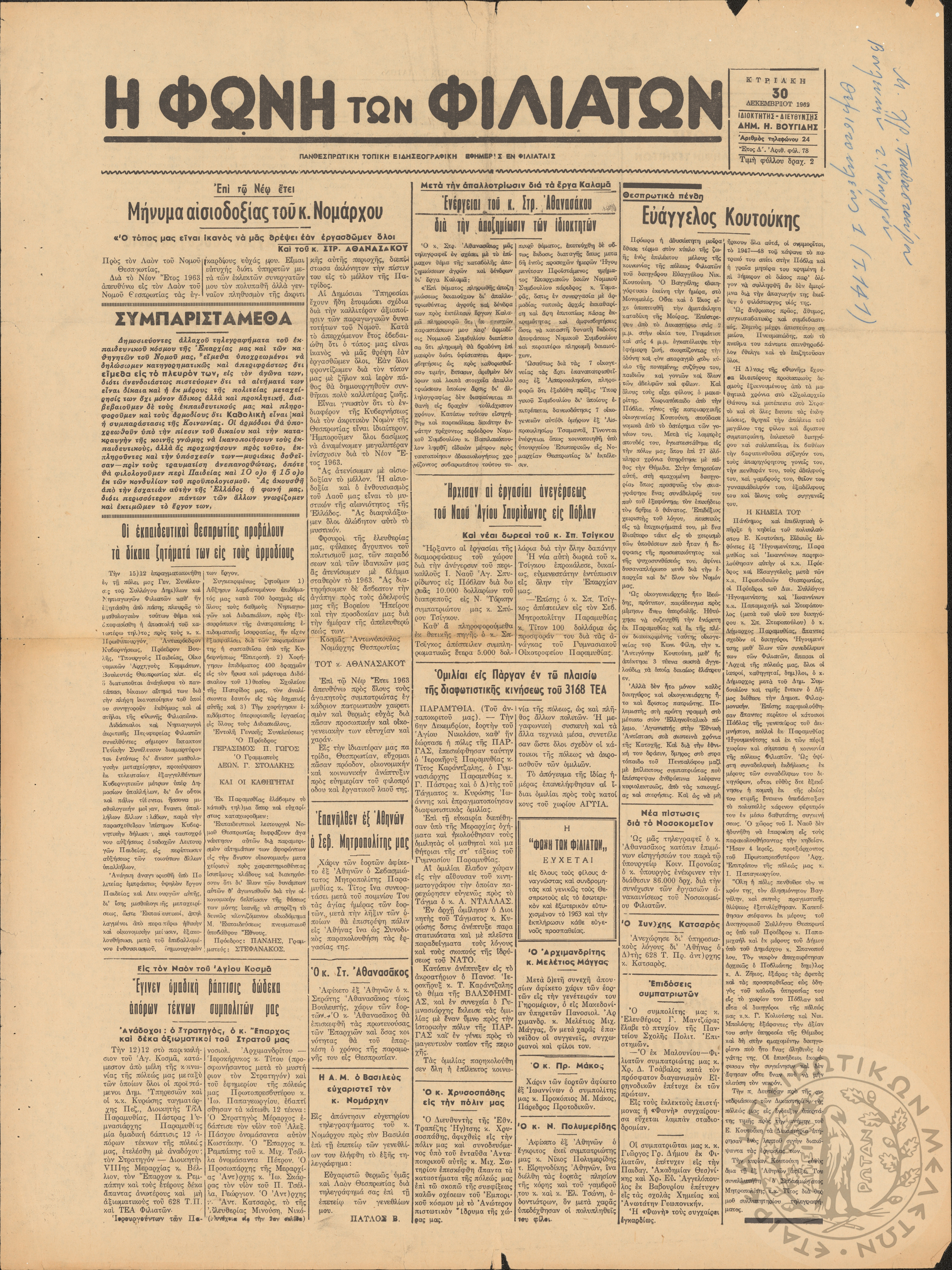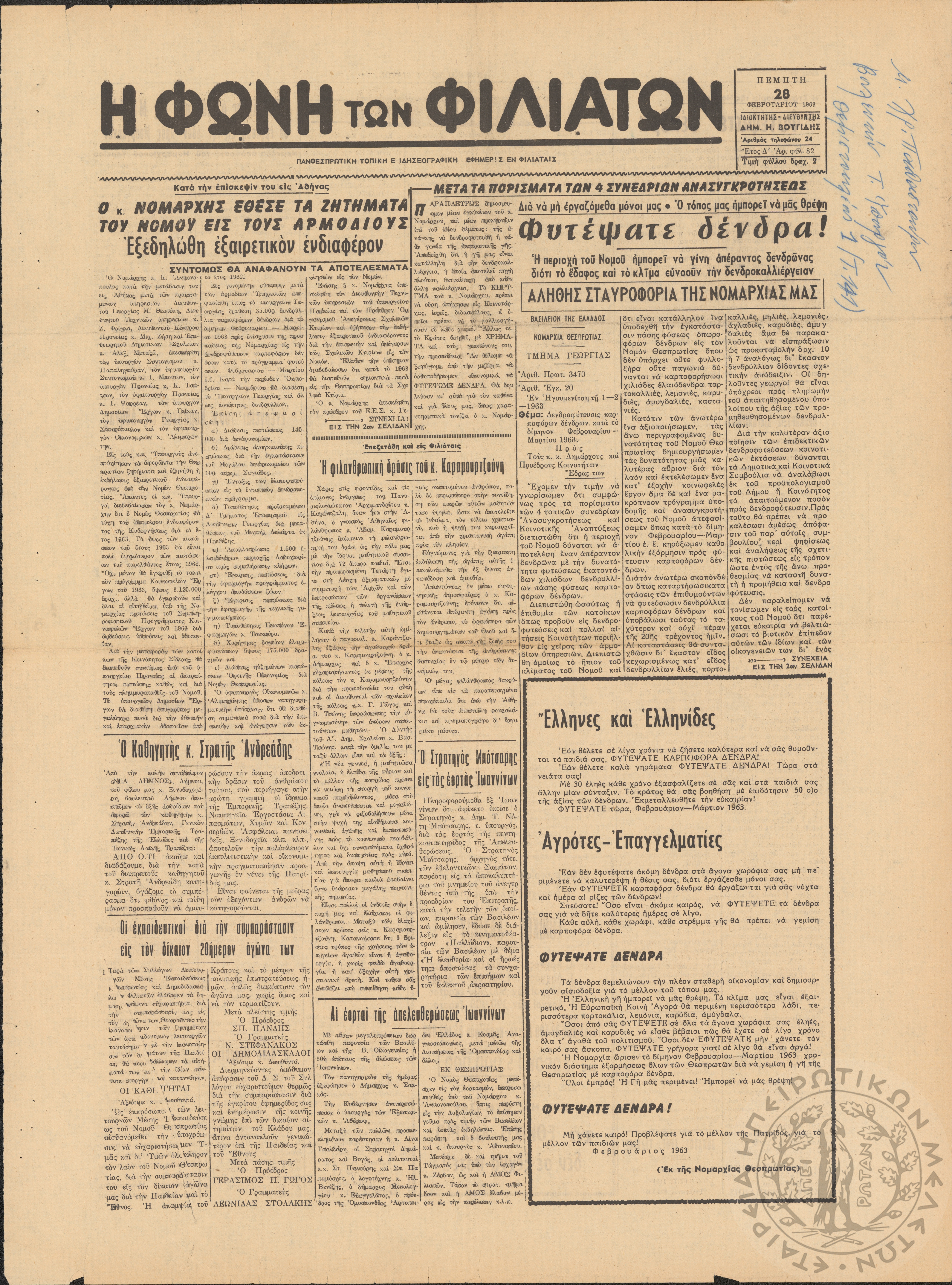 Η φωνή των Φιλιατών: πανθεσπρωτική τοπική ειδησεογραφική εφημερίς εν Φιλιάταις, 1963, φ. 82Έτος Δ΄, αρ. φ. 82...