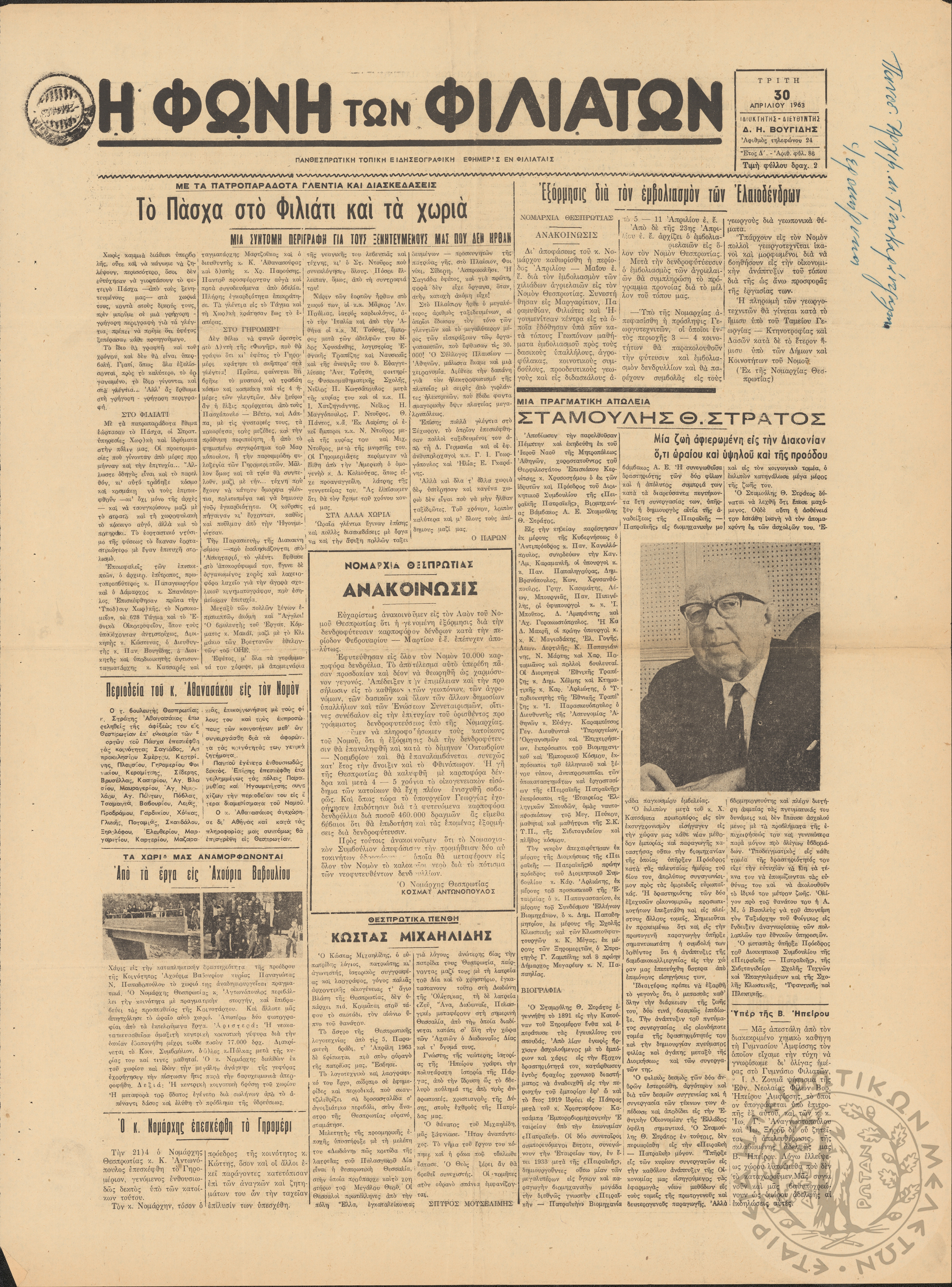 Η φωνή των Φιλιατών: πανθεσπρωτική τοπική ειδησεογραφική εφημερίς εν Φιλιάταις, 1963, φ. 86Έτος Δ΄, αρ. φ. 86...