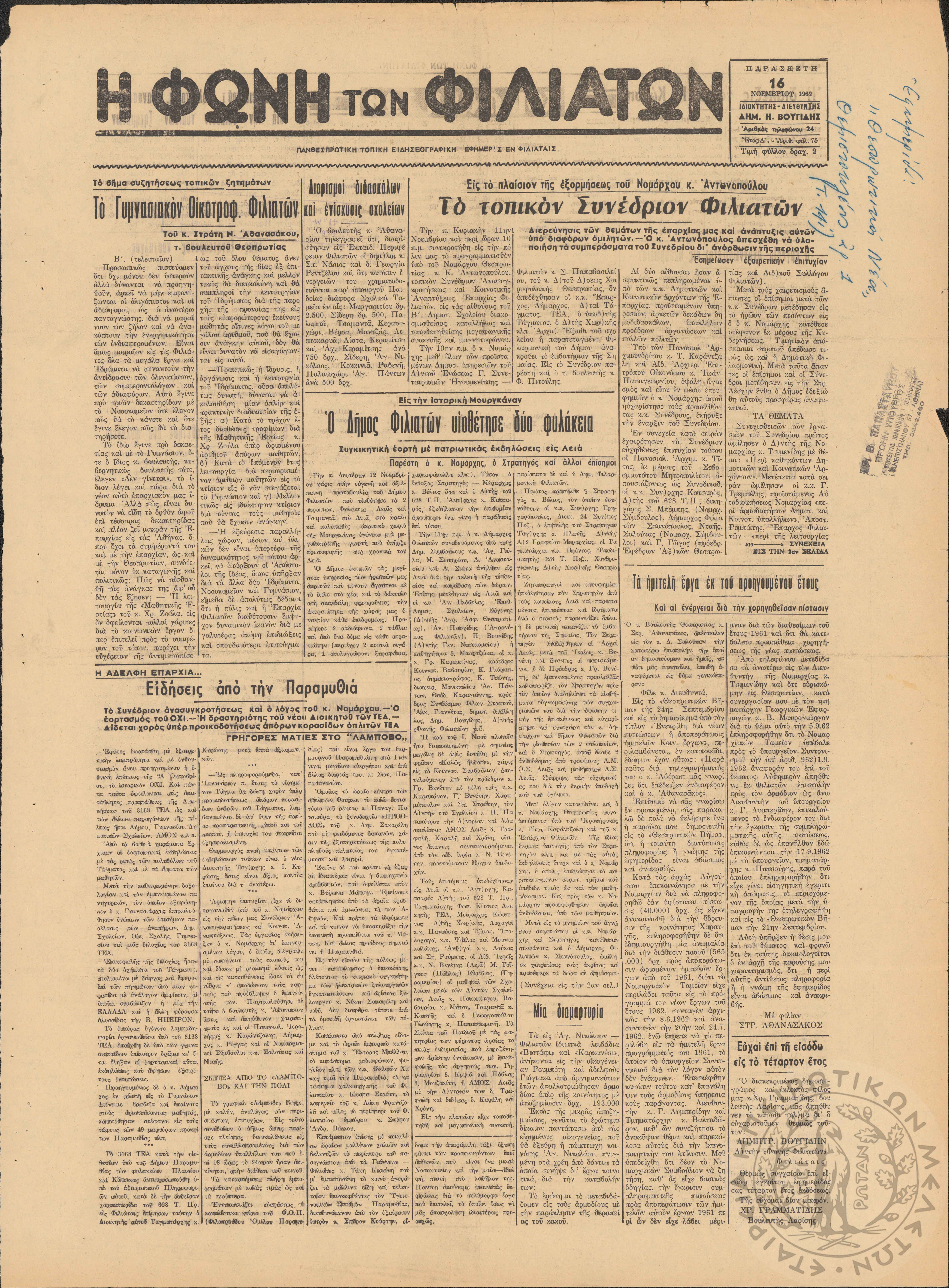 Η φωνή των Φιλιατών: πανθεσπρωτική τοπική ειδησεογραφική εφημερίς εν Φιλιάταις, 1962, φ. 75Έτος Δ΄, αρ. φ. 75...