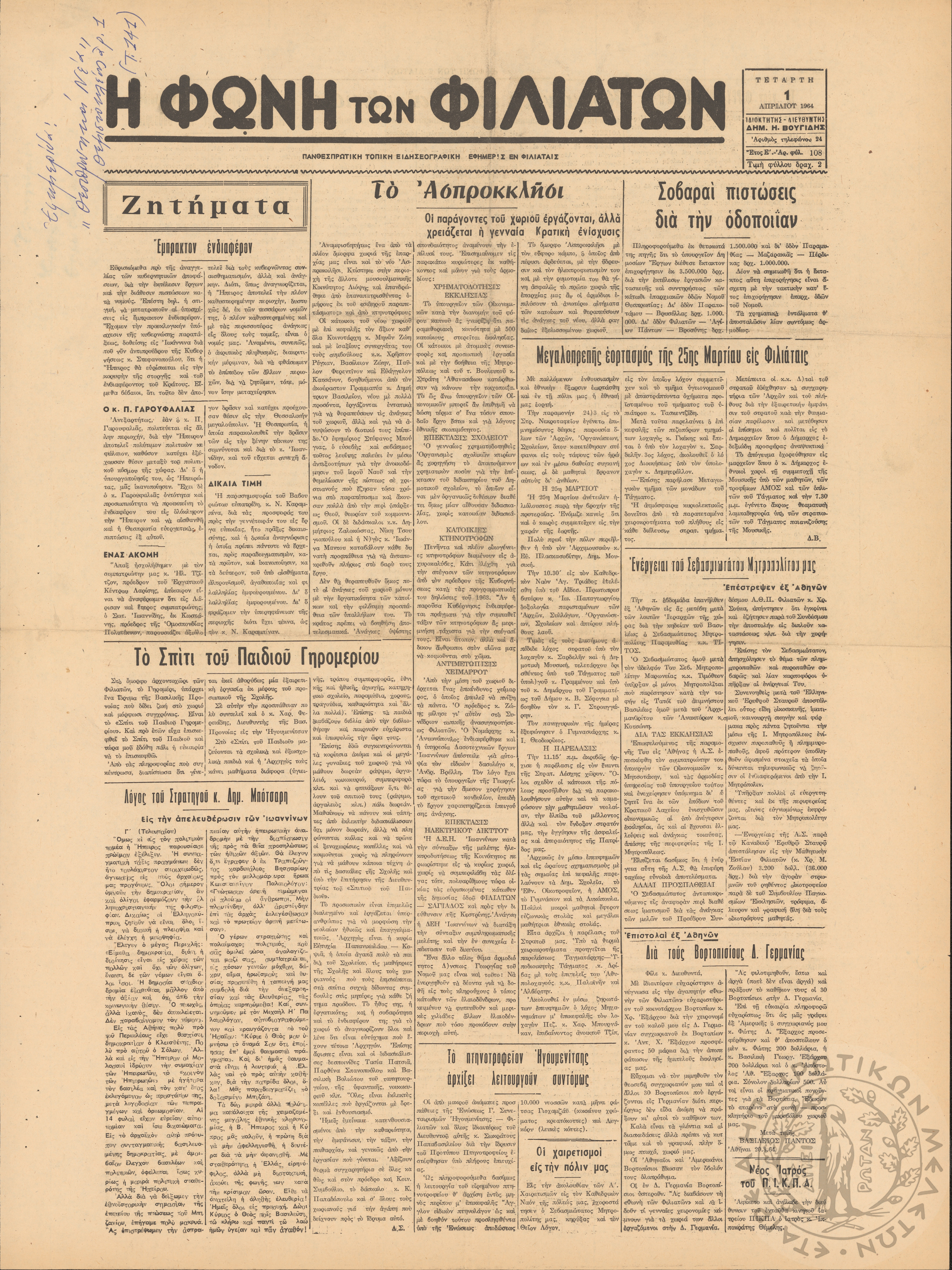 Η φωνή των Φιλιατών: πανθεσπρωτική τοπική ειδησεογραφική εφημερίς εν Φιλιάταις, 1964, φ. 108Έτος Ε΄, αρ. φ. 108...