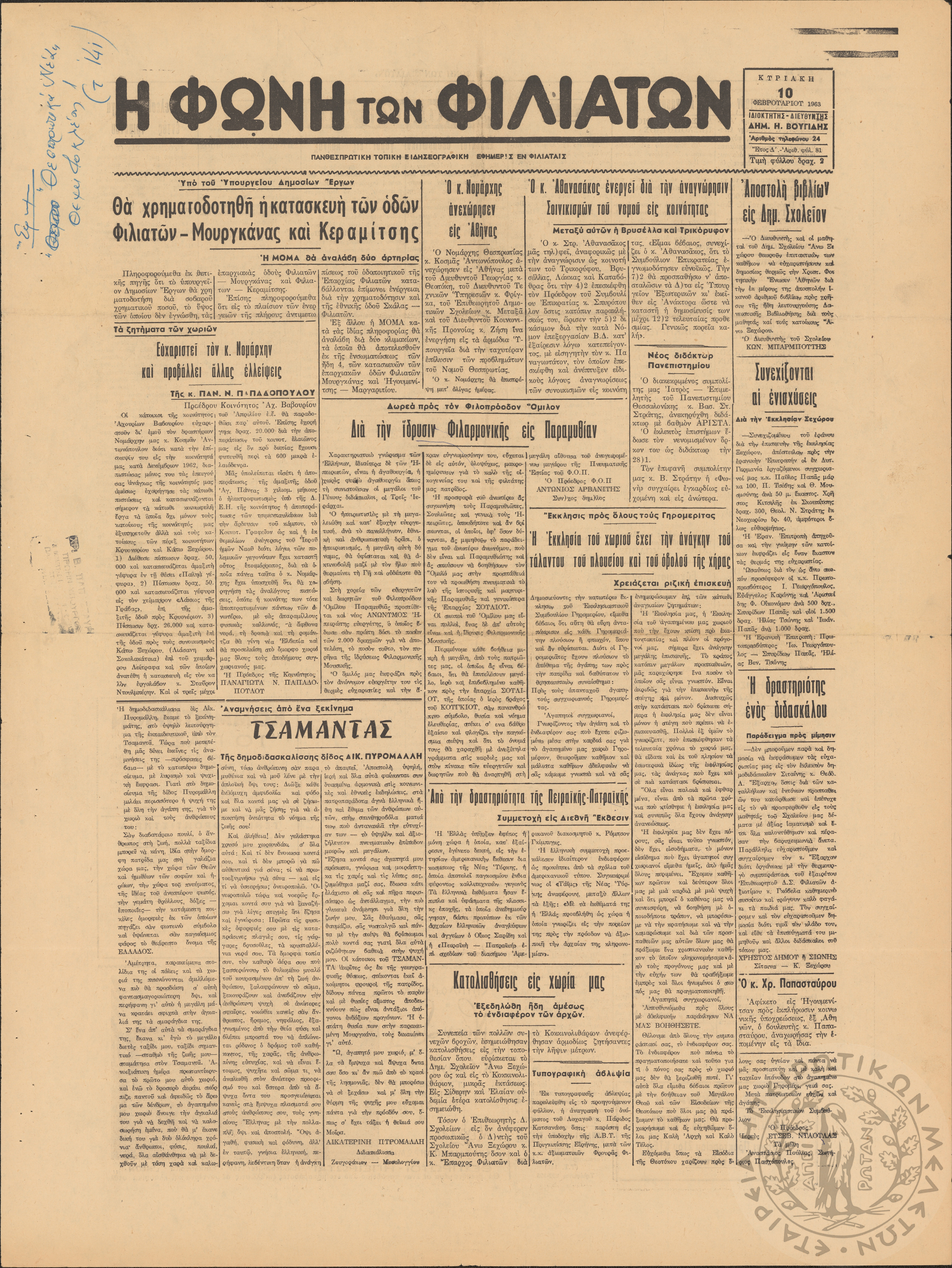 Η φωνή των Φιλιατών: πανθεσπρωτική τοπική ειδησεογραφική εφημερίς εν Φιλιάταις, 1963, φ. 81Έτος Δ΄, αρ. φ. 81...