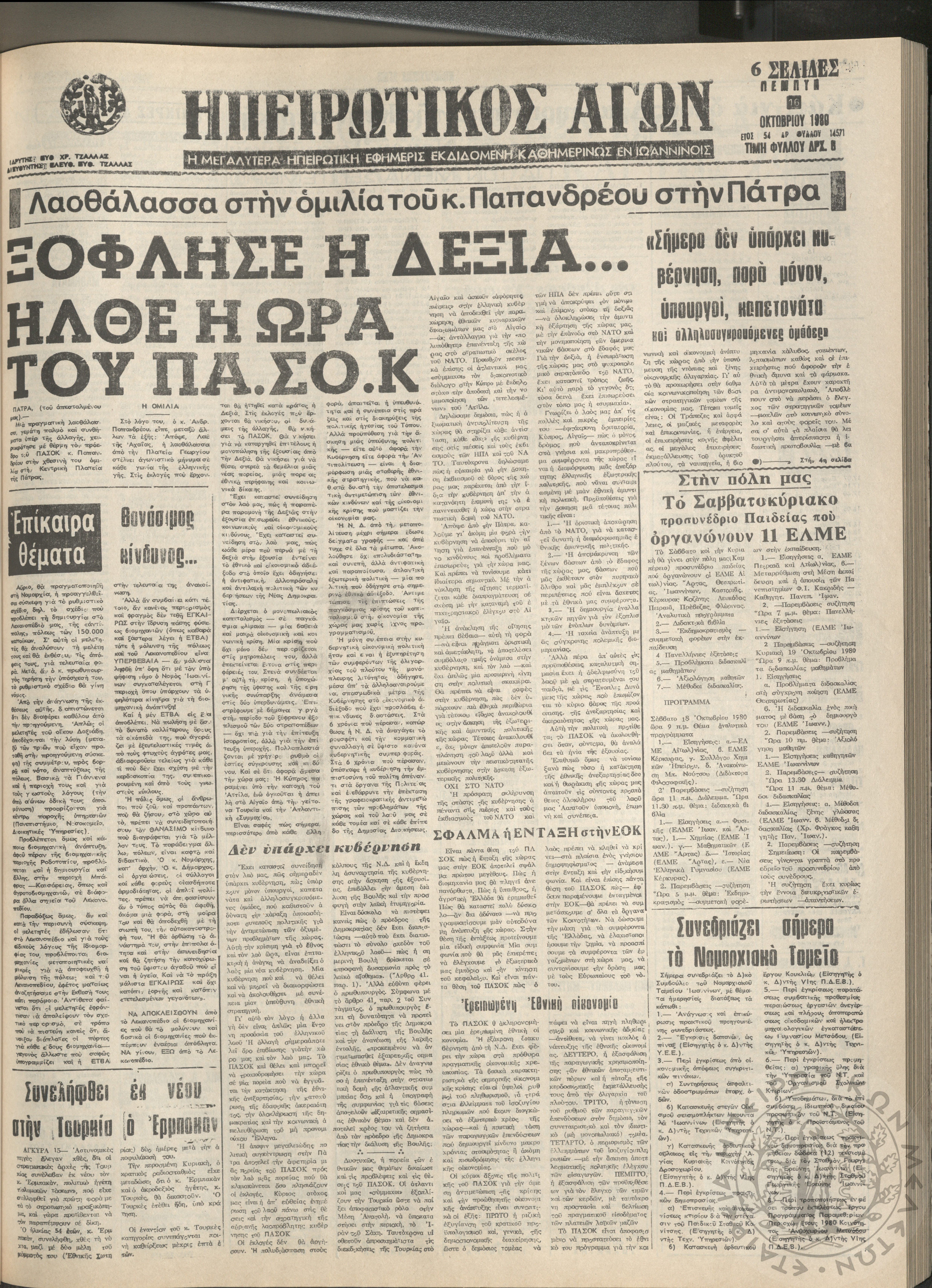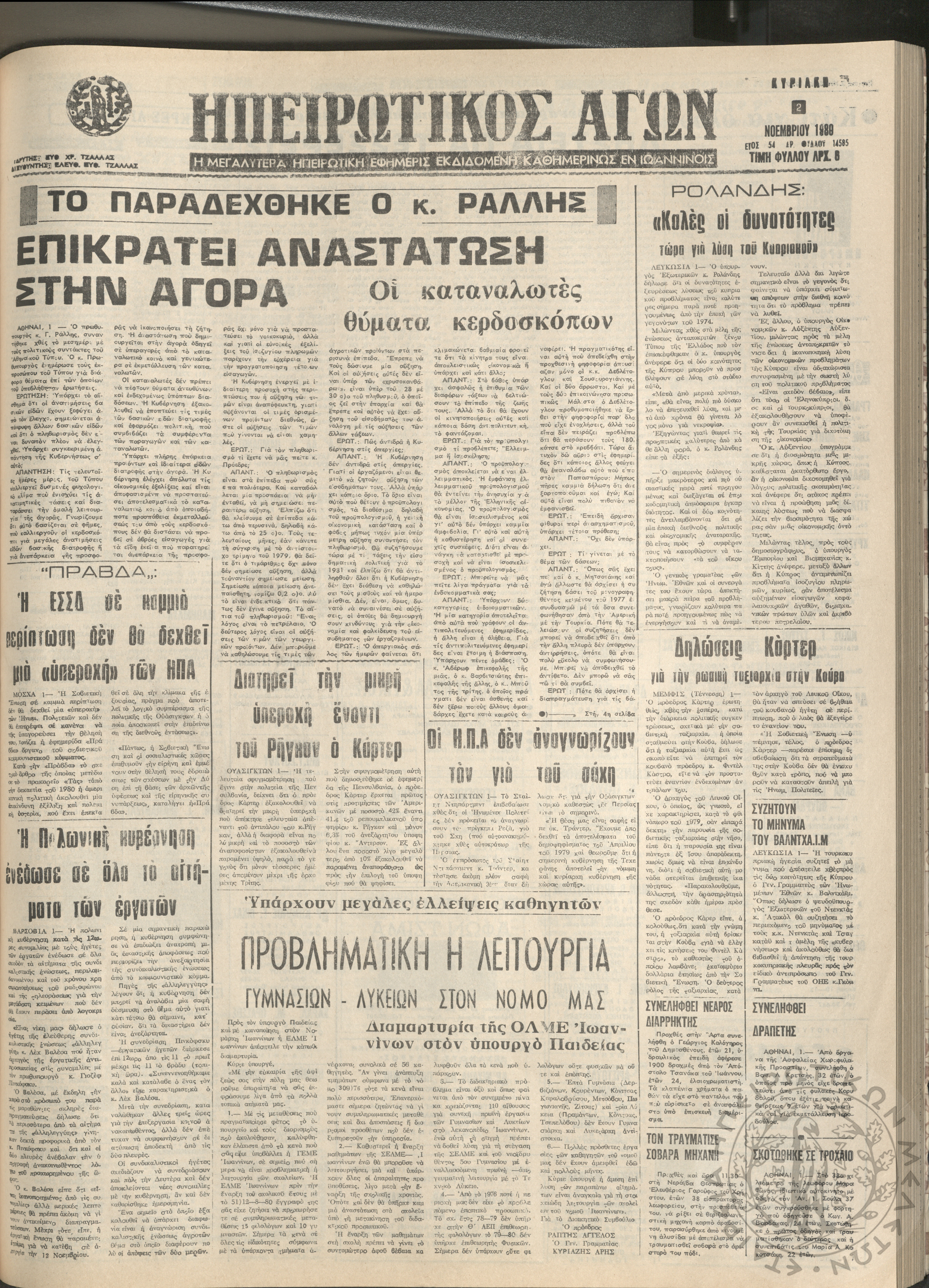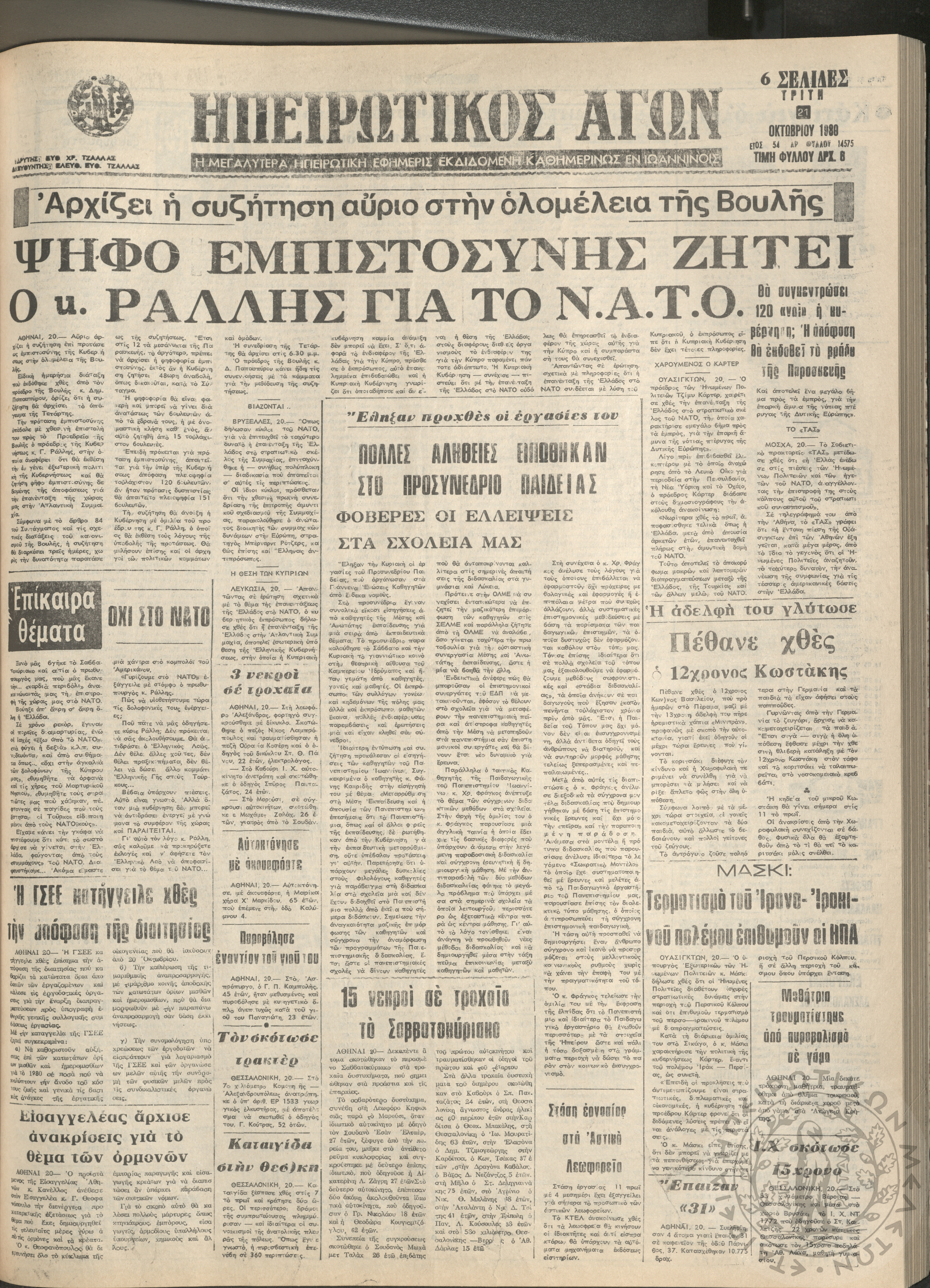 Ηπειρωτικός Αγών: η μεγαλυτέρα Ηπειρωτική εφημερίς εκδιδόμενη καθημερινώς εν Ιωαννίνοις, 1980, φ. 14580Έτος 54, φ. 14580...