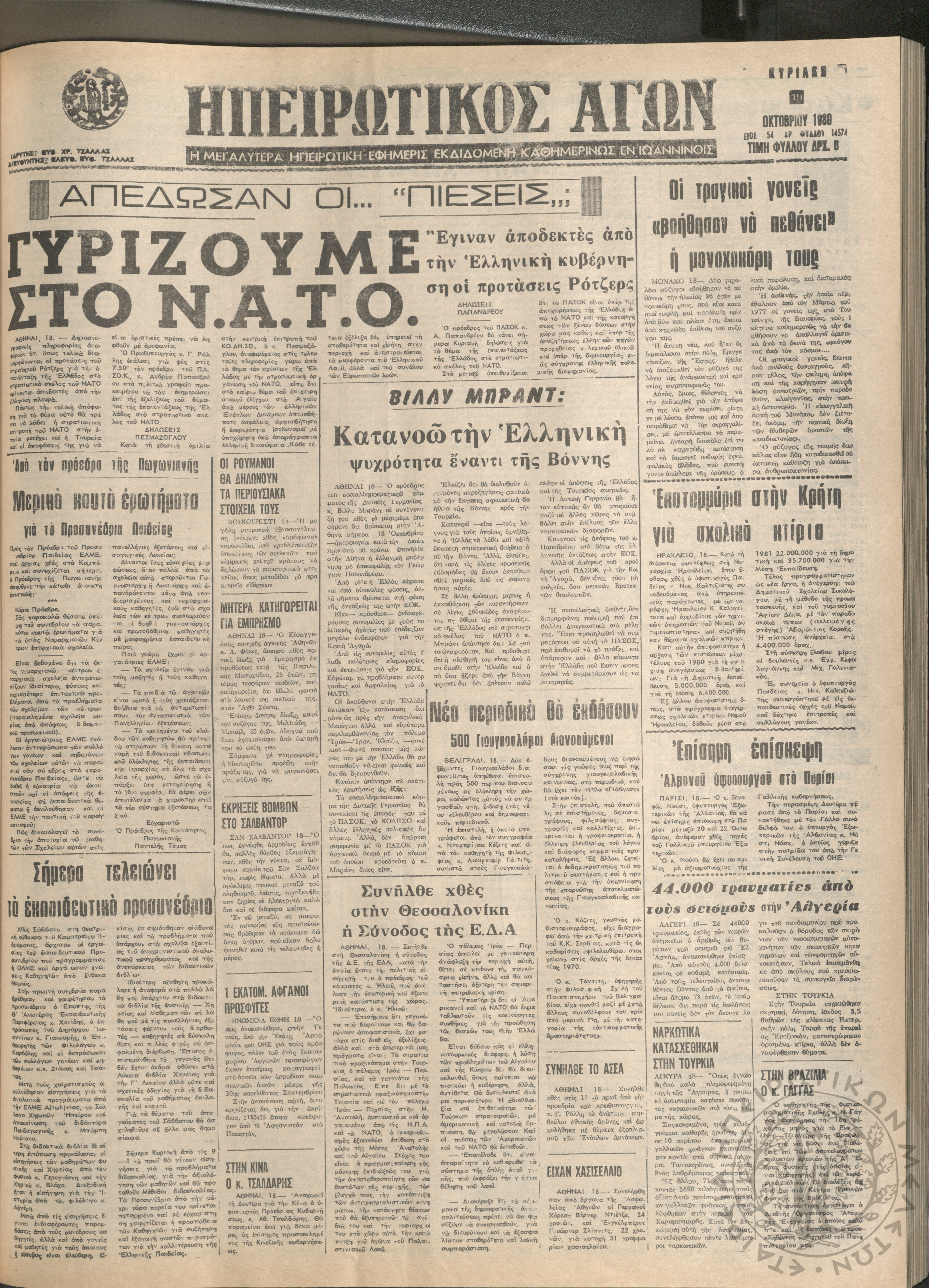 Ηπειρωτικός Αγών: η μεγαλυτέρα Ηπειρωτική εφημερίς εκδιδόμενη καθημερινώς εν Ιωαννίνοις, 1980, φ. 14569Έτος 54, φ. 14569...