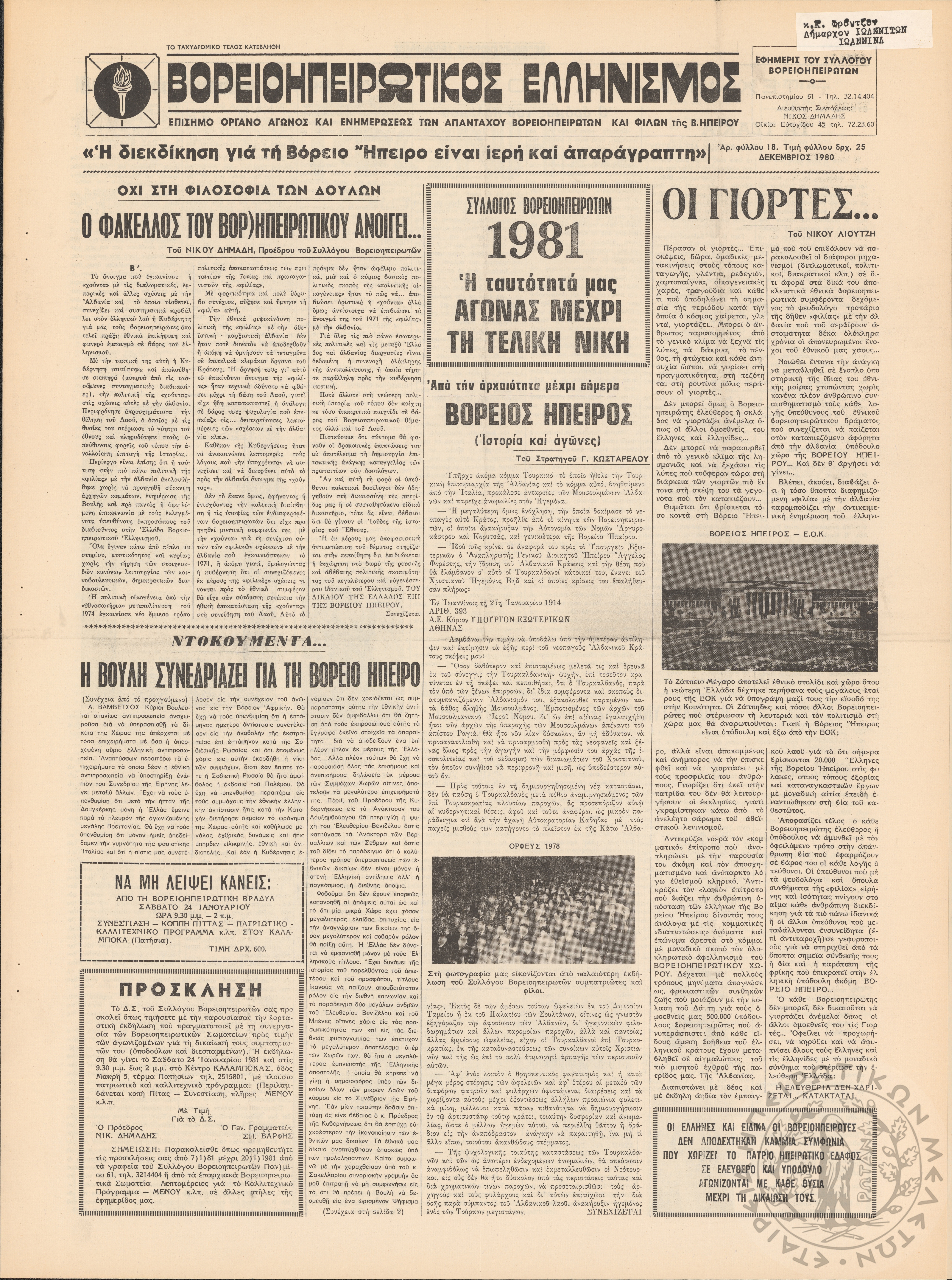 Βορειοηπειρωτικός Ελληνισμός: επίσημο όργανο αγώνος και αντιστάσεως των απανταχού Βορειοηπειρωτών και φίλων της Β. Ηπείρου, 1980, φ. 18...