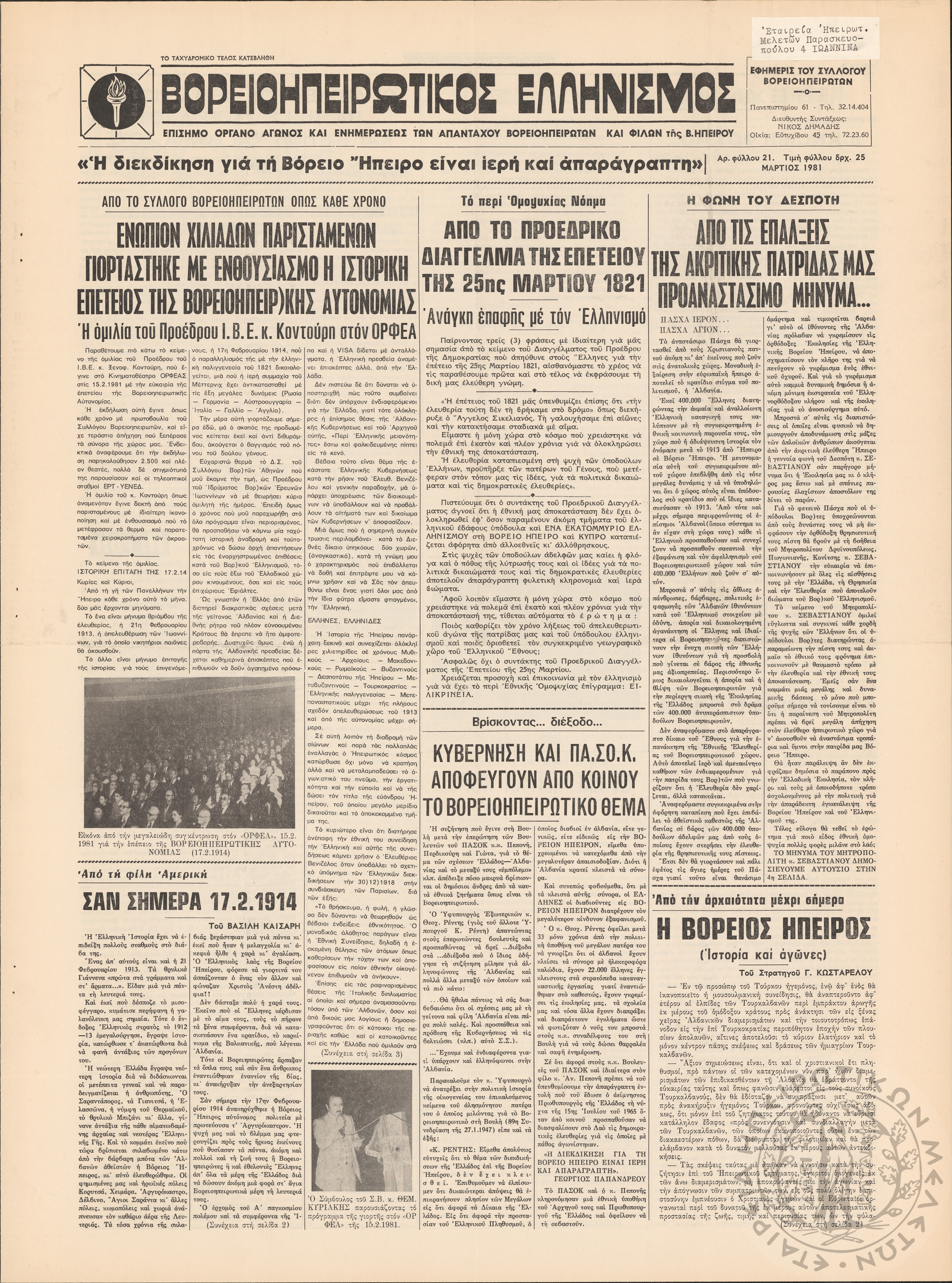 Βορειοηπειρωτικός Ελληνισμός: επίσημο όργανο αγώνος και αντιστάσεως των απανταχού Βορειοηπειρωτών και φίλων της Β. Ηπείρου, 1981, φ. 21...