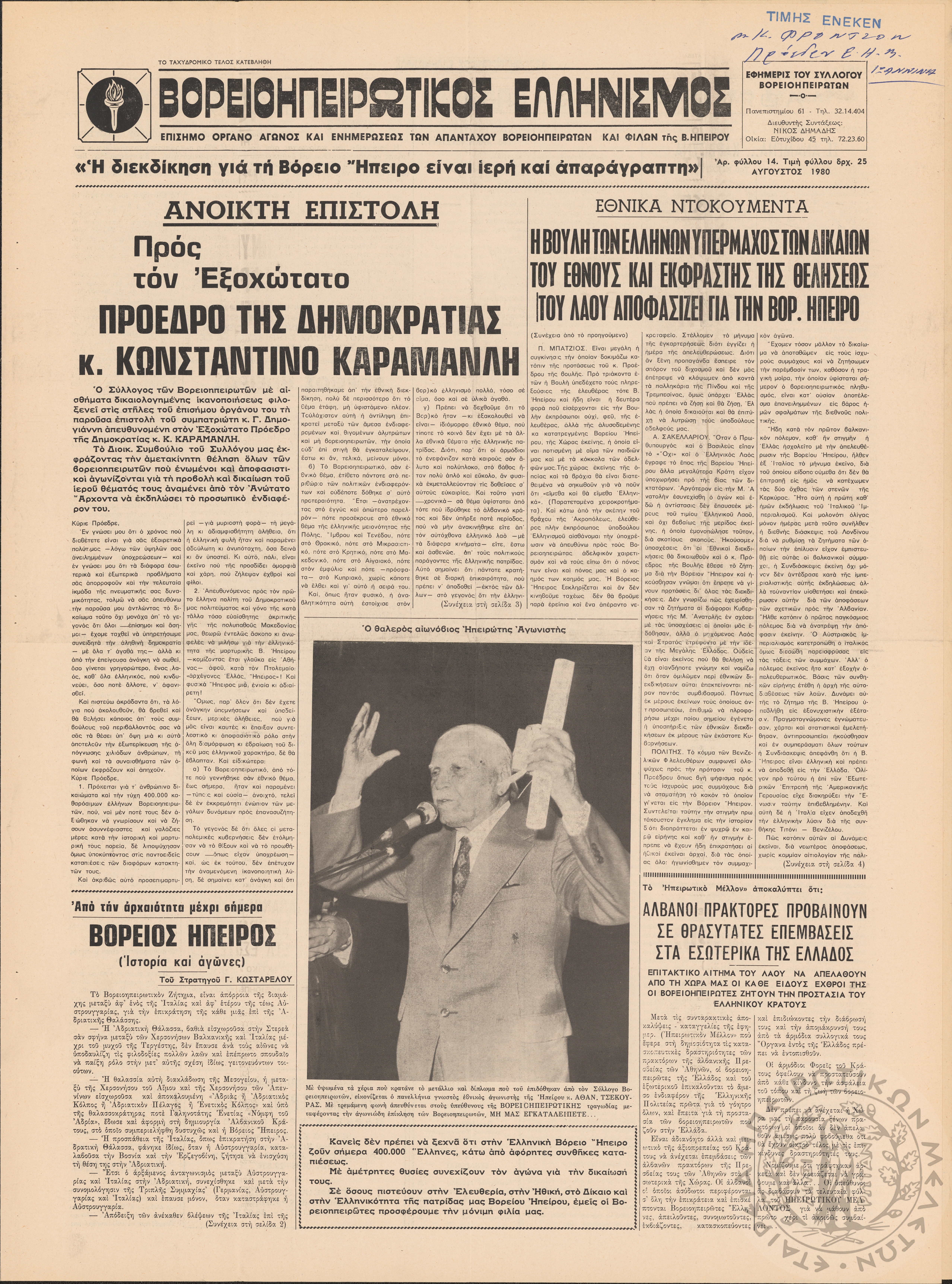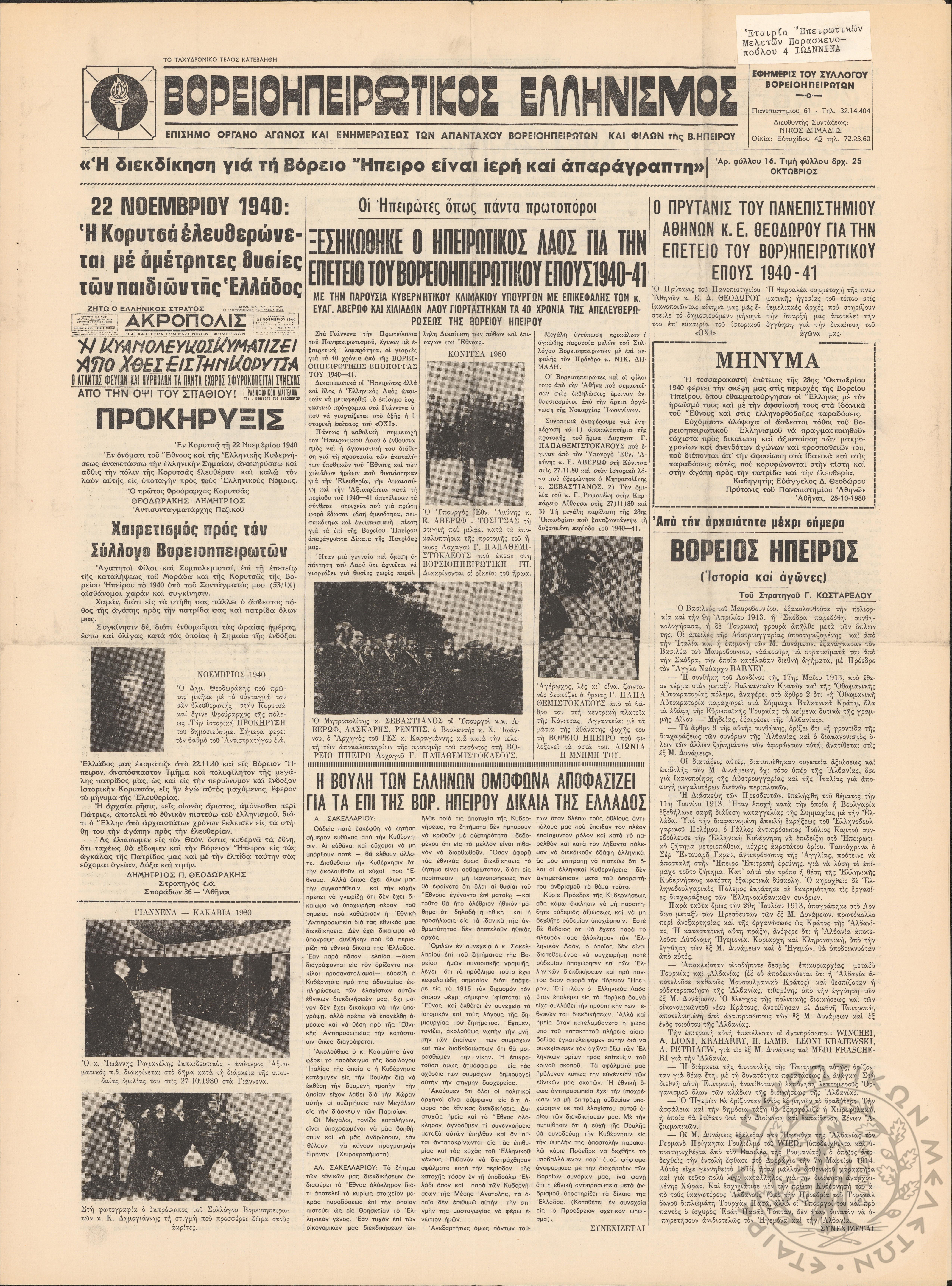 Βορειοηπειρωτικός Ελληνισμός: επίσημο όργανο αγώνος και αντιστάσεως των απανταχού Βορειοηπειρωτών και φίλων της Β. Ηπείρου, 1980, φ. 14...