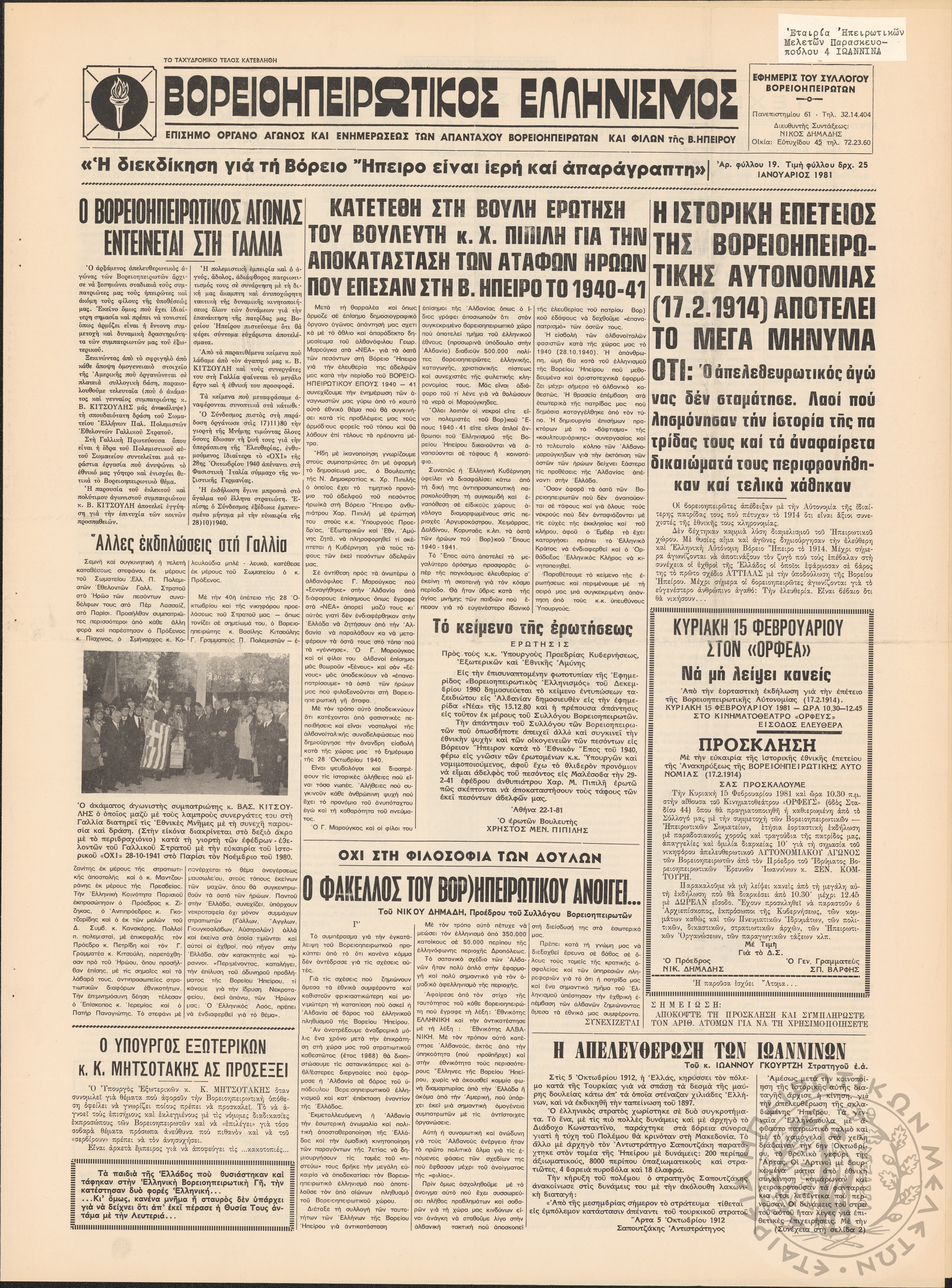 Βορειοηπειρωτικός Ελληνισμός: επίσημο όργανο αγώνος και αντιστάσεως των απανταχού Βορειοηπειρωτών και φίλων της Β. Ηπείρου, 1981, φ. 19...