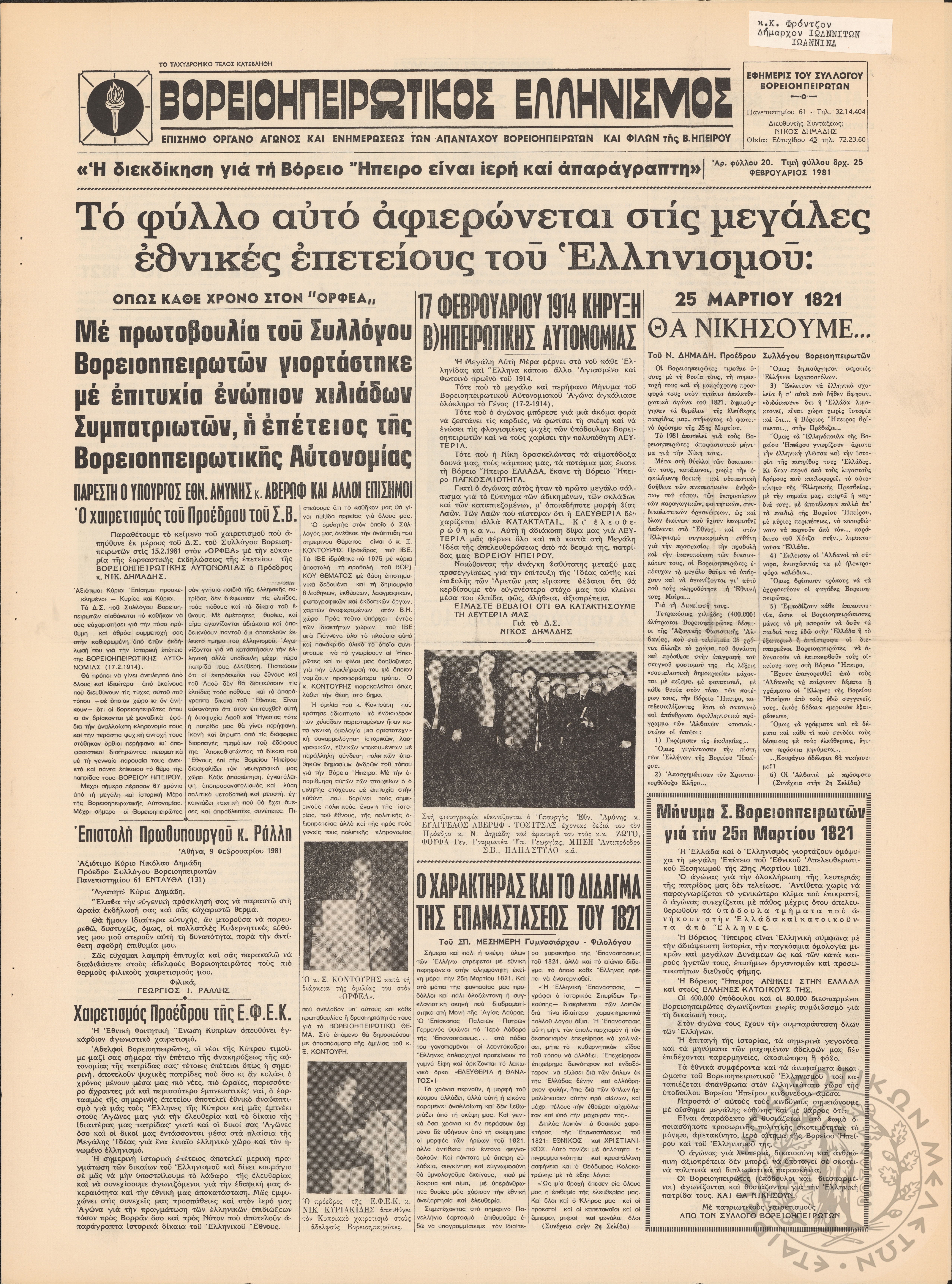 Βορειοηπειρωτικός Ελληνισμός: επίσημο όργανο αγώνος και αντιστάσεως των απανταχού Βορειοηπειρωτών και φίλων της Β. Ηπείρου, 1981, φ. 20...