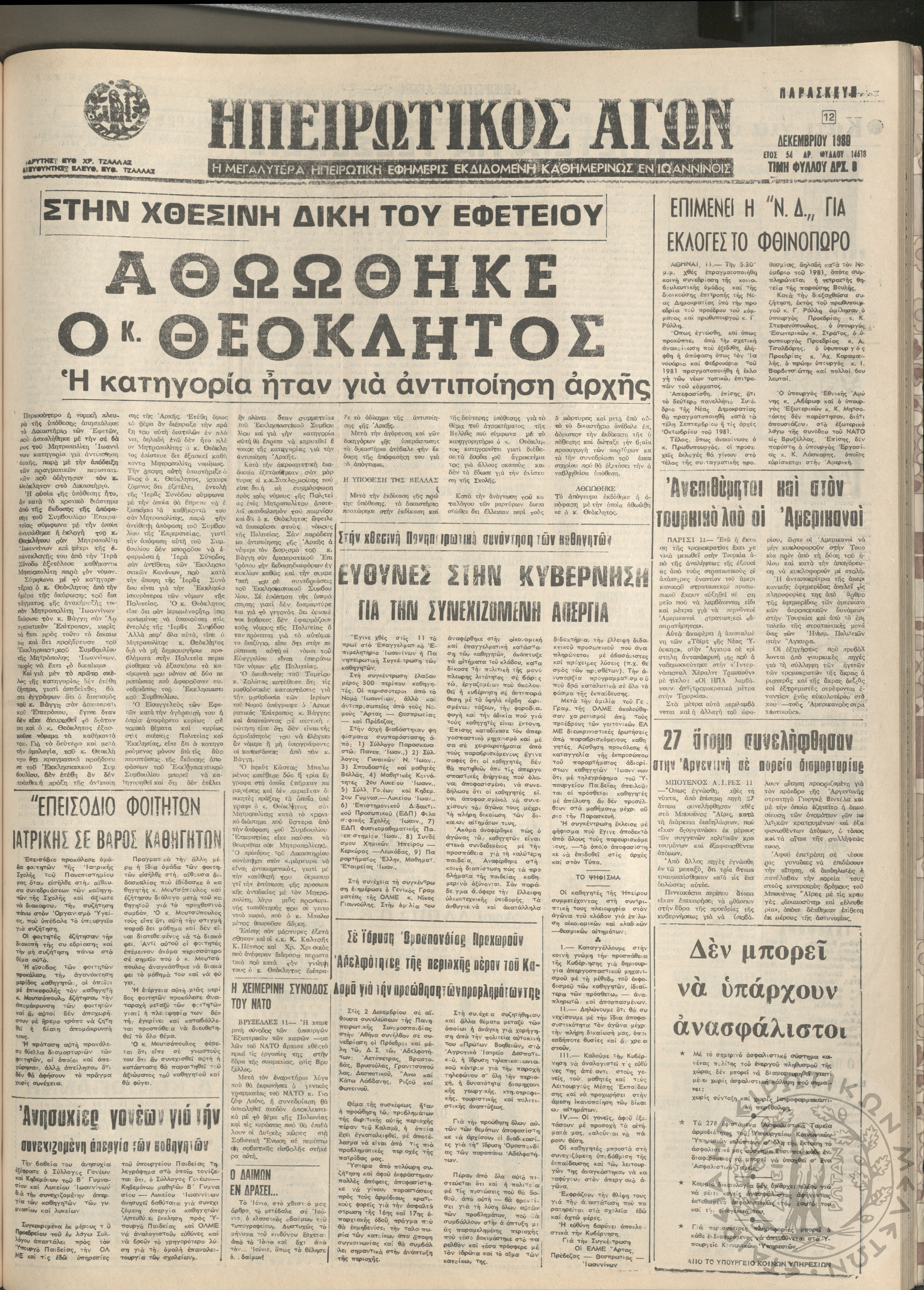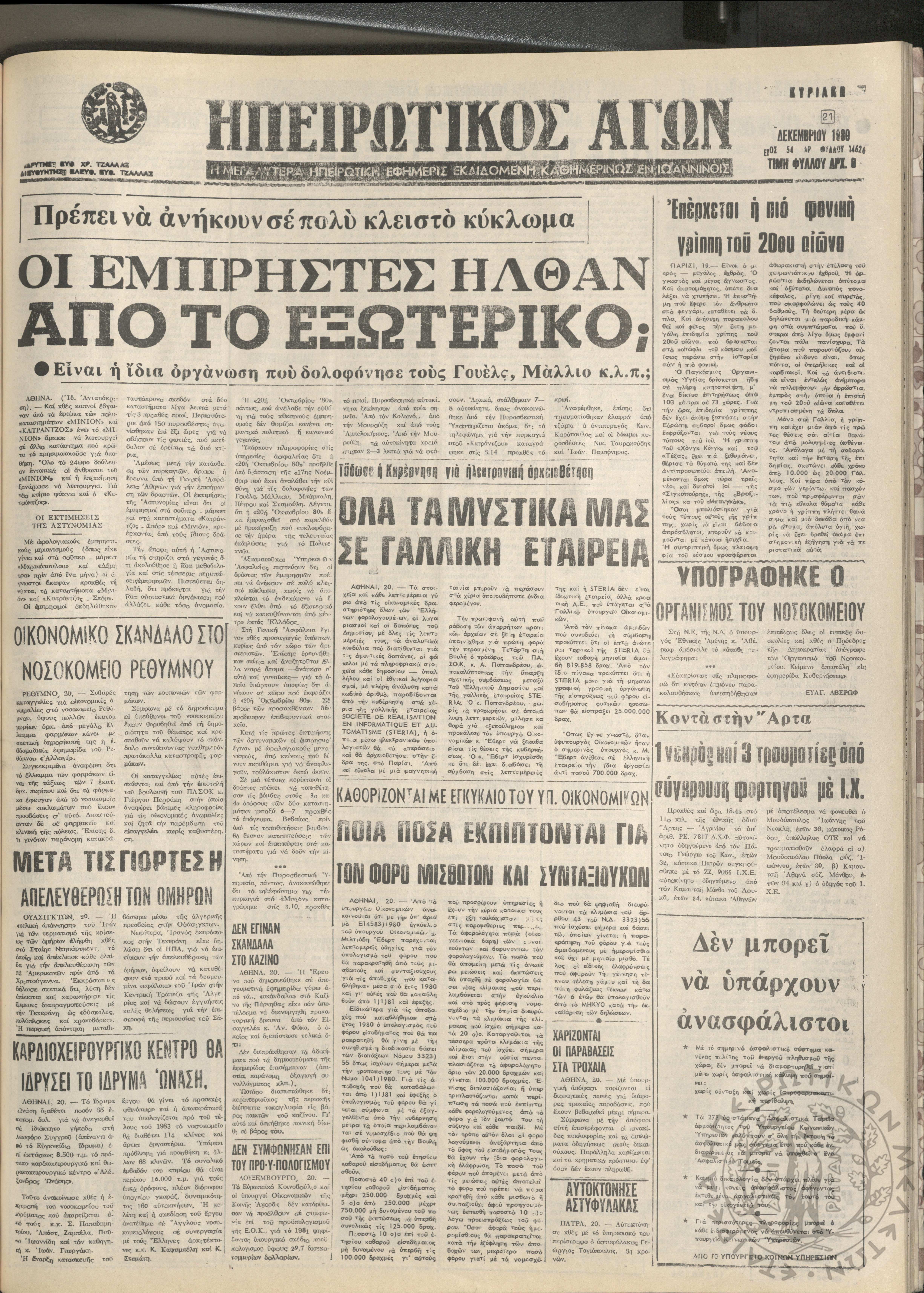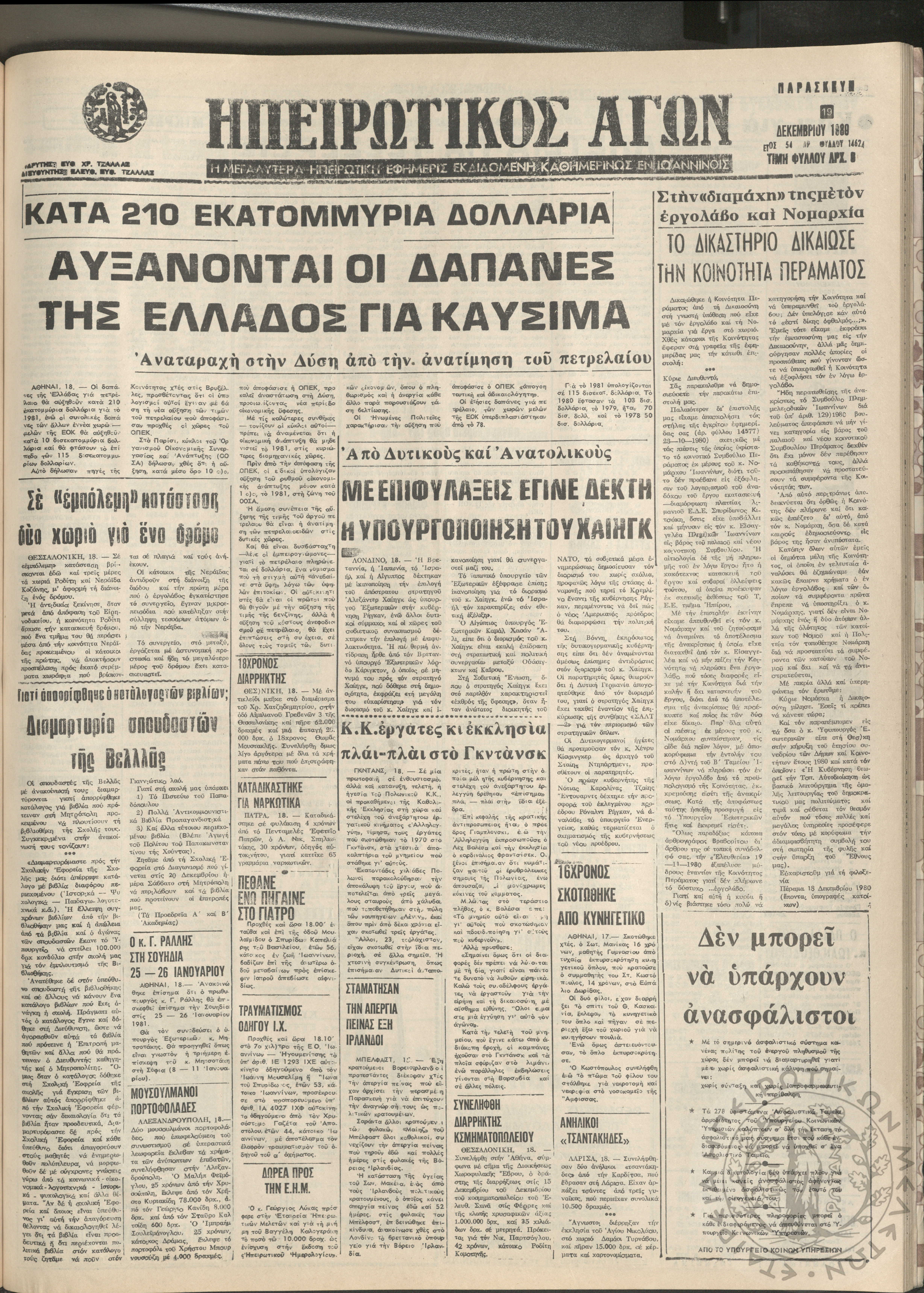 Ηπειρωτικός Αγών: η μεγαλυτέρα Ηπειρωτική εφημερίς εκδιδόμενη καθημερινώς εν Ιωαννίνοις, 1980, φ. 14619Έτος 54, φ. 14619...