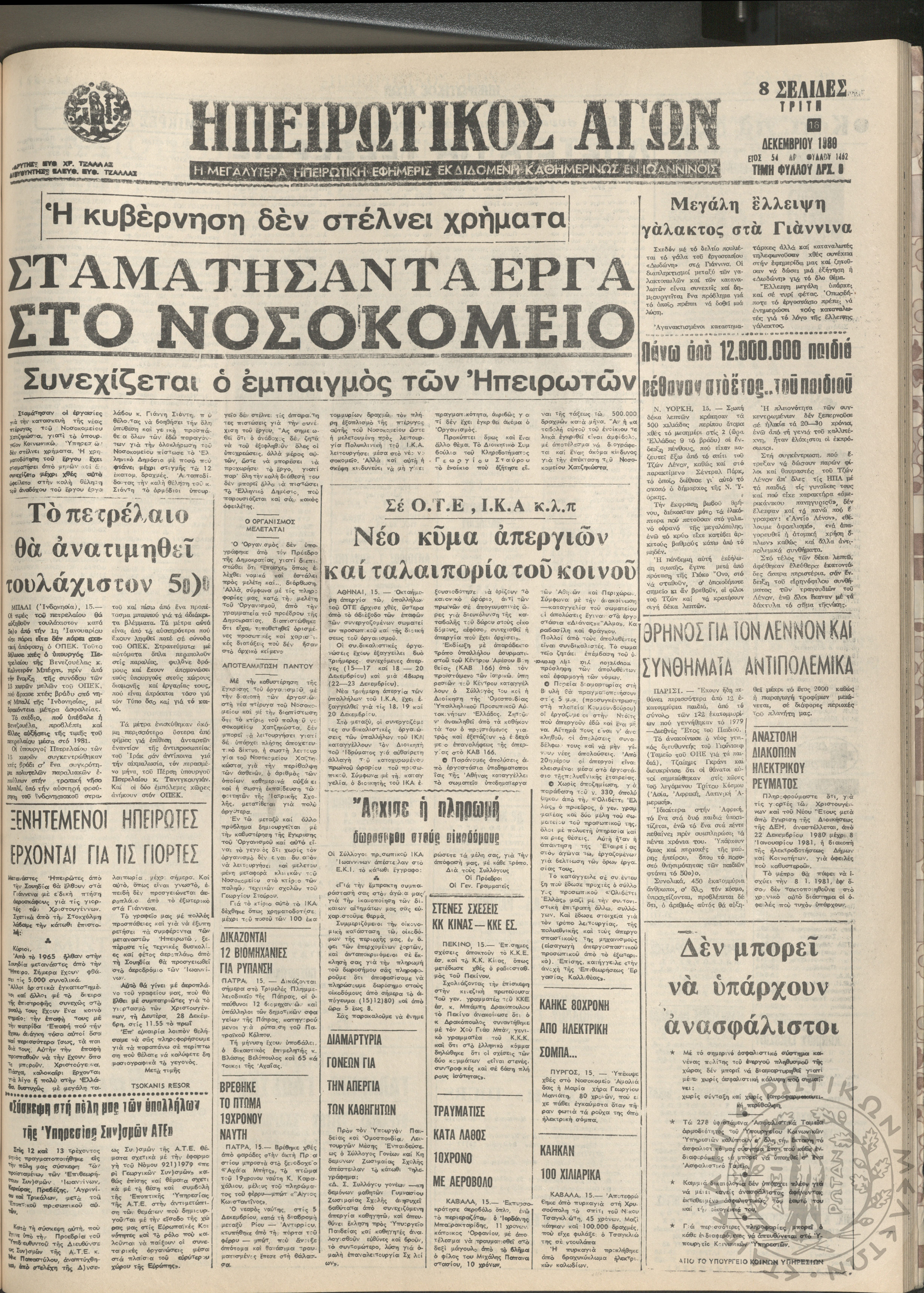 Ηπειρωτικός Αγών: η μεγαλυτέρα Ηπειρωτική εφημερίς εκδιδόμενη καθημερινώς εν Ιωαννίνοις, 1980, φ. 14631Έτος 54, φ. 14631...