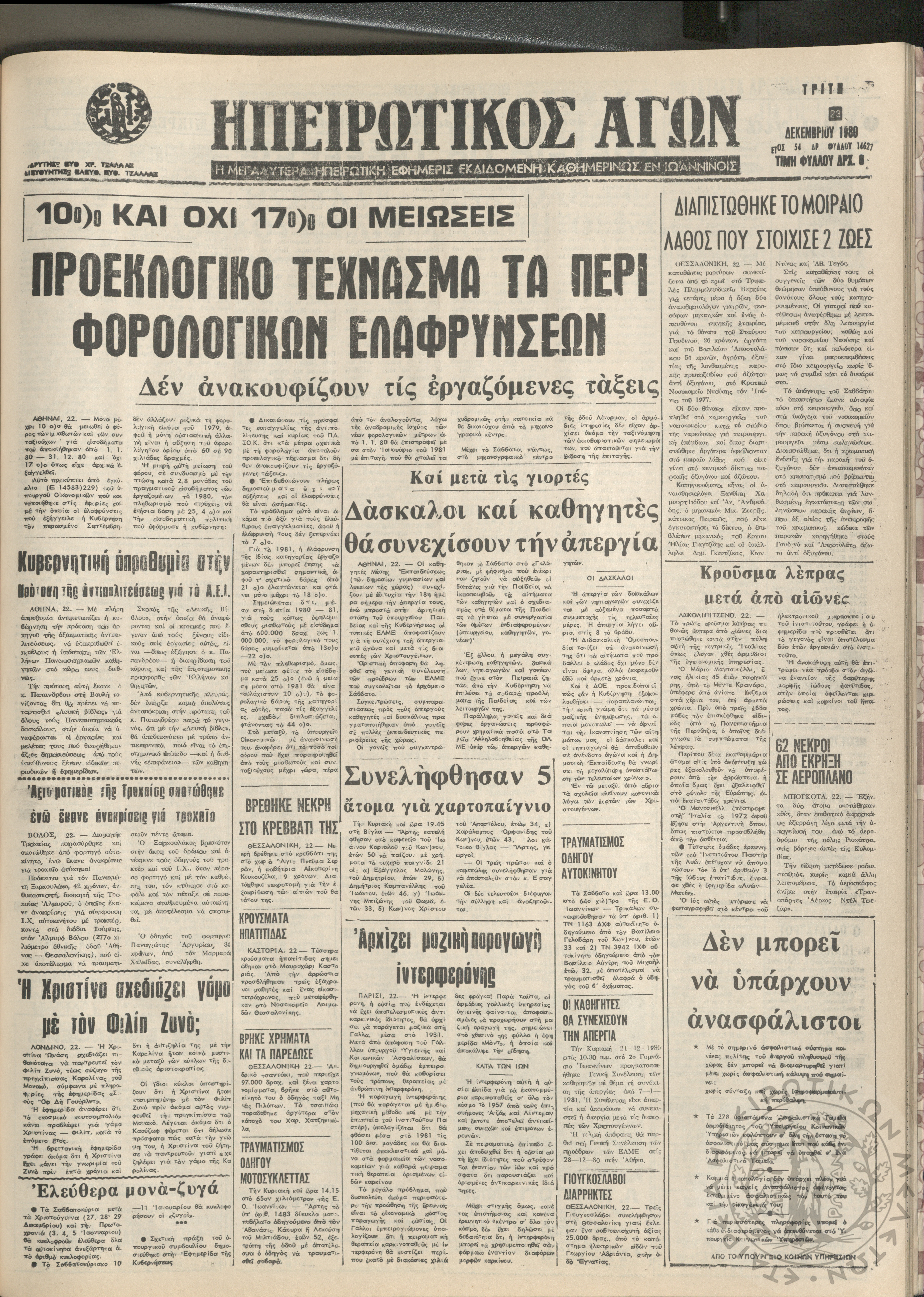 Ηπειρωτικός Αγών: η μεγαλυτέρα Ηπειρωτική εφημερίς εκδιδόμενη καθημερινώς εν Ιωαννίνοις, 1980, φ. 14623Έτος 54, φ. 14623...