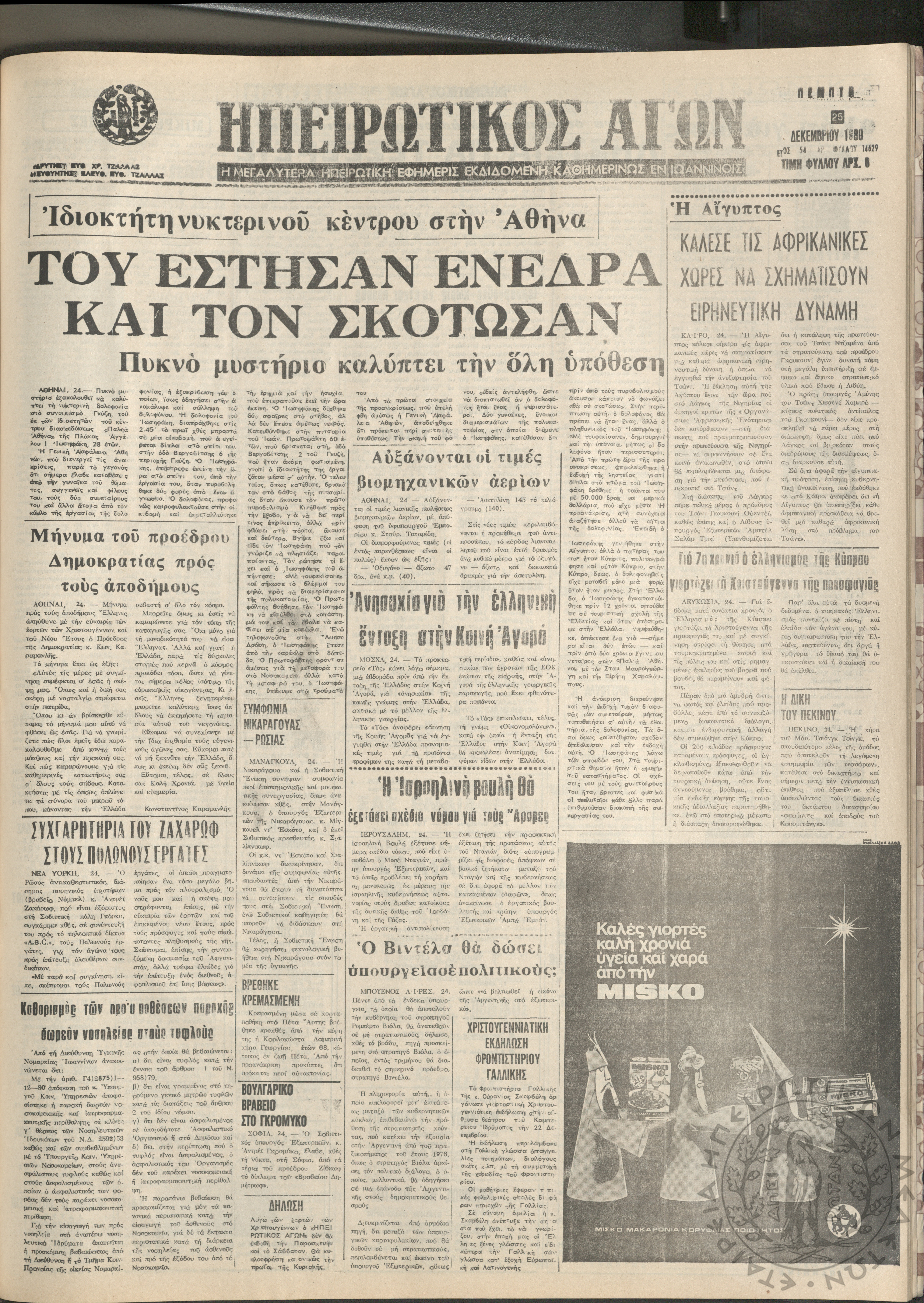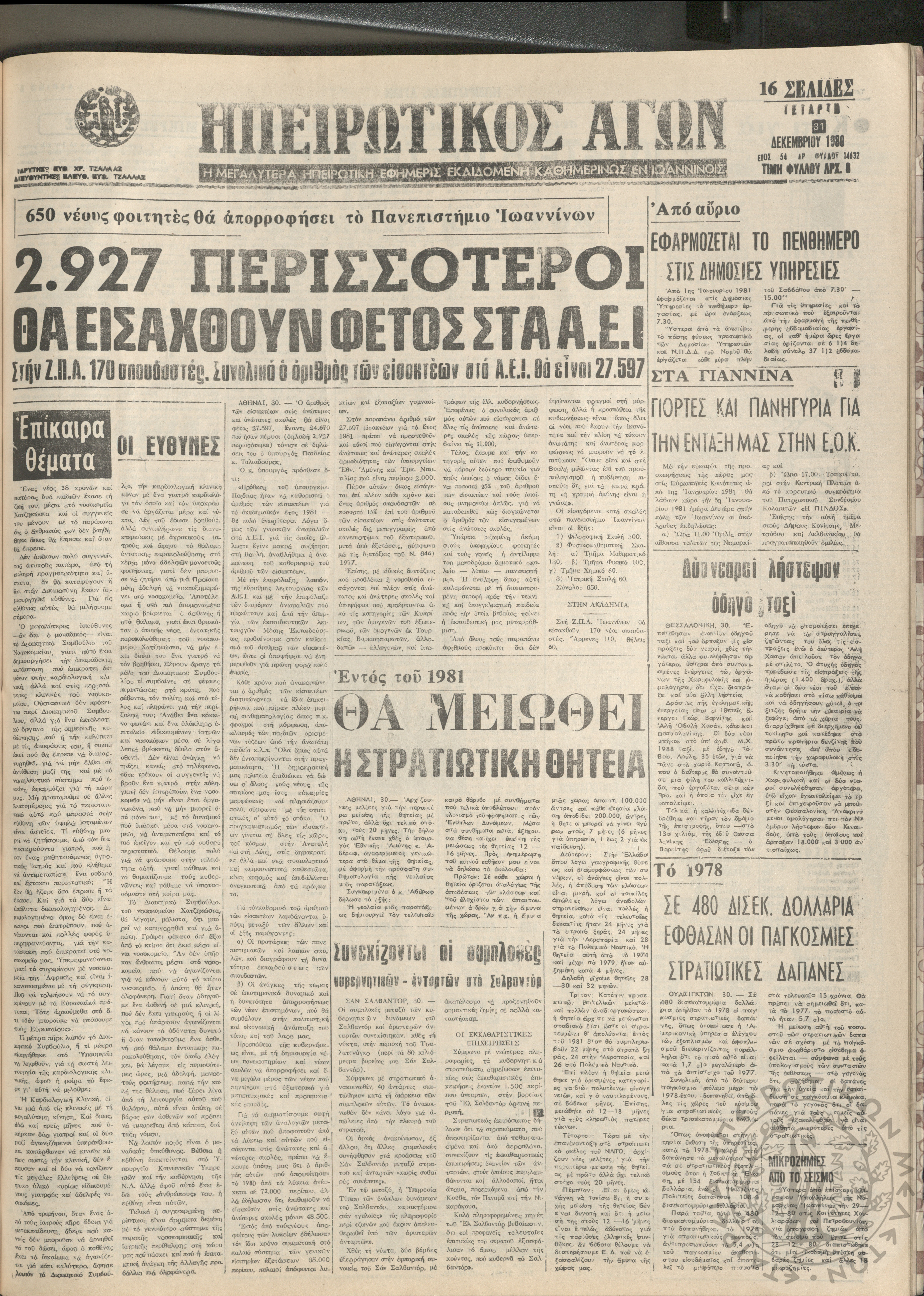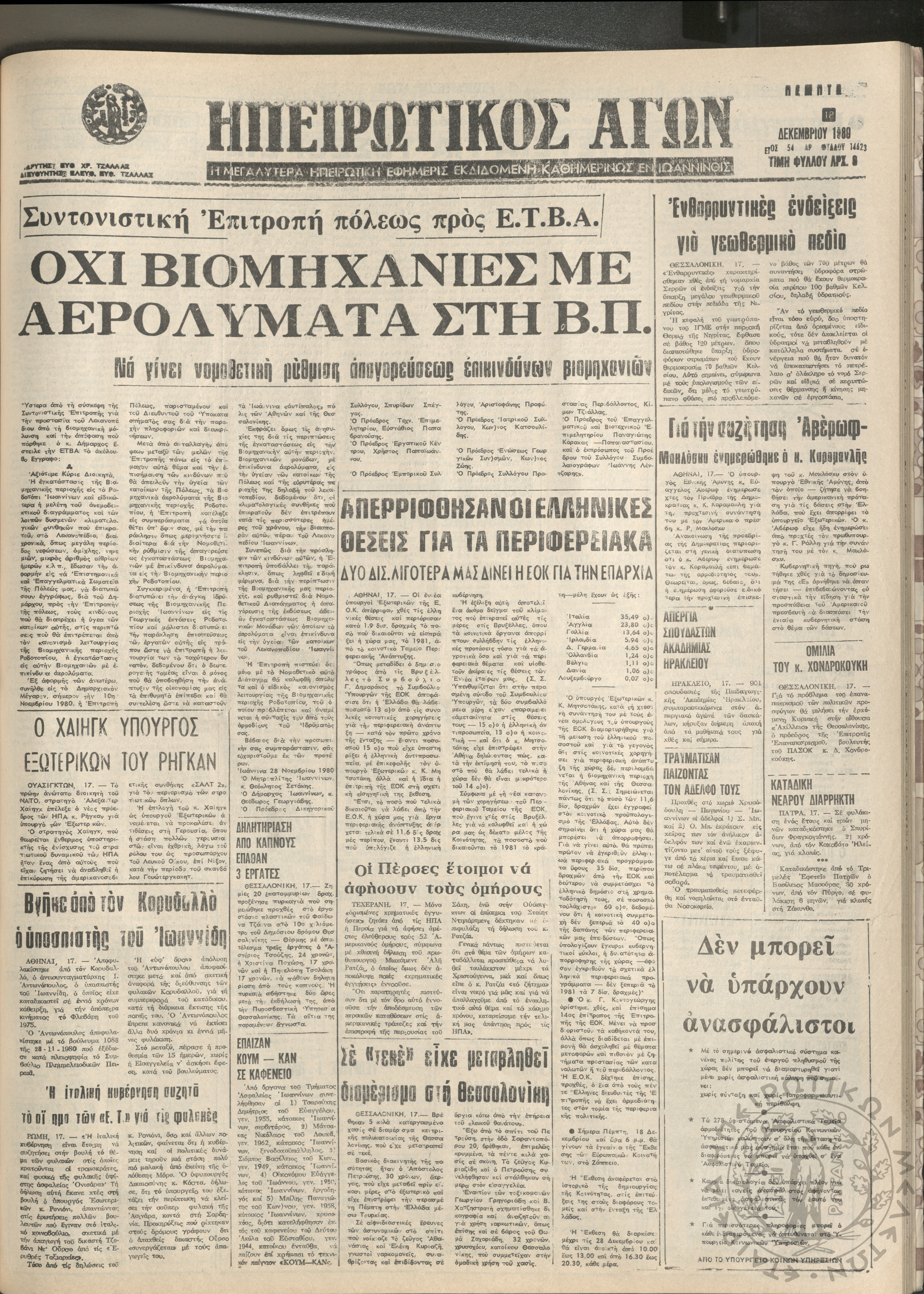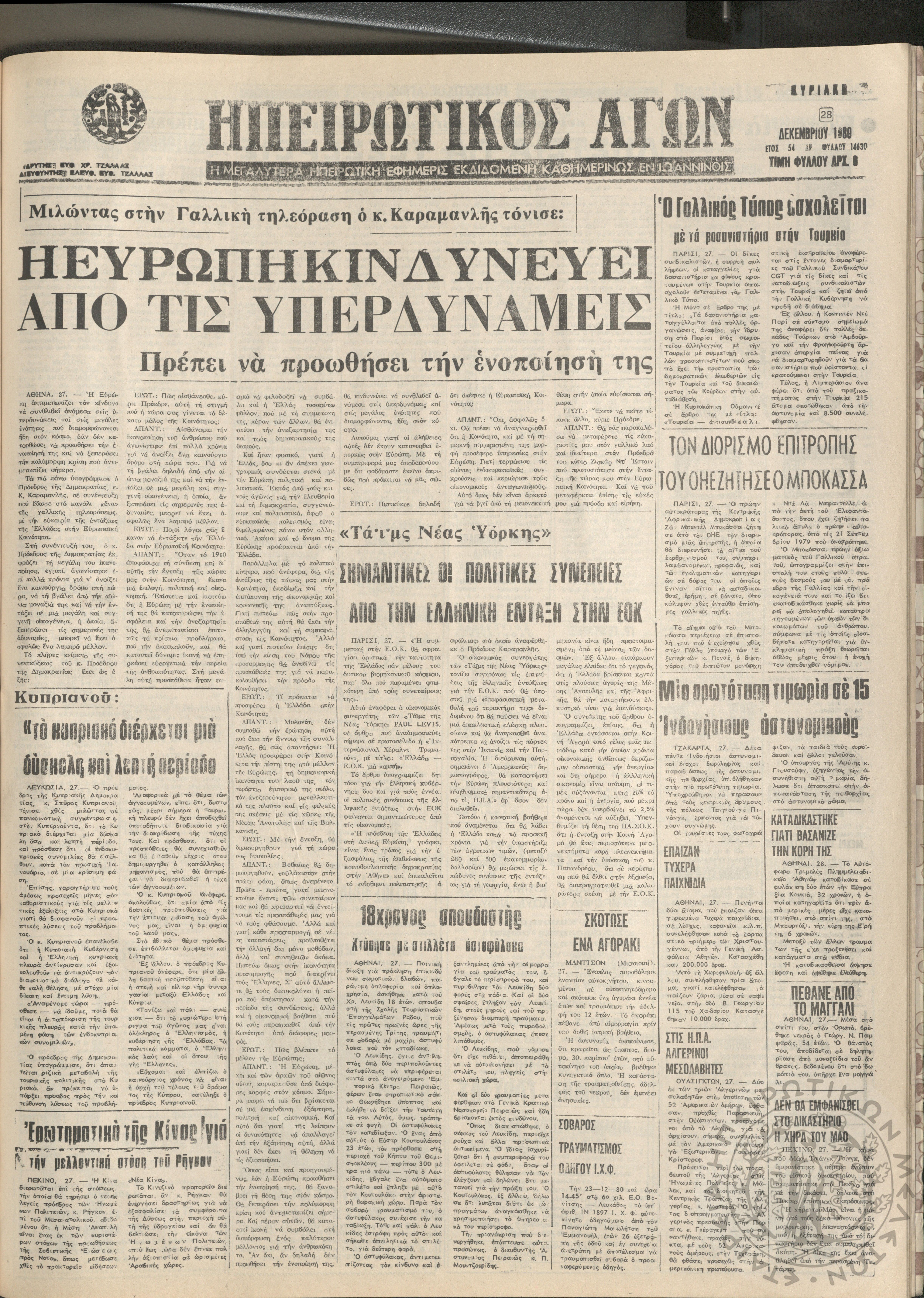 Ηπειρωτικός Αγών: η μεγαλυτέρα Ηπειρωτική εφημερίς εκδιδόμενη καθημερινώς εν Ιωαννίνοις, 1980, φ. 14630Έτος 54, φ. 14630...