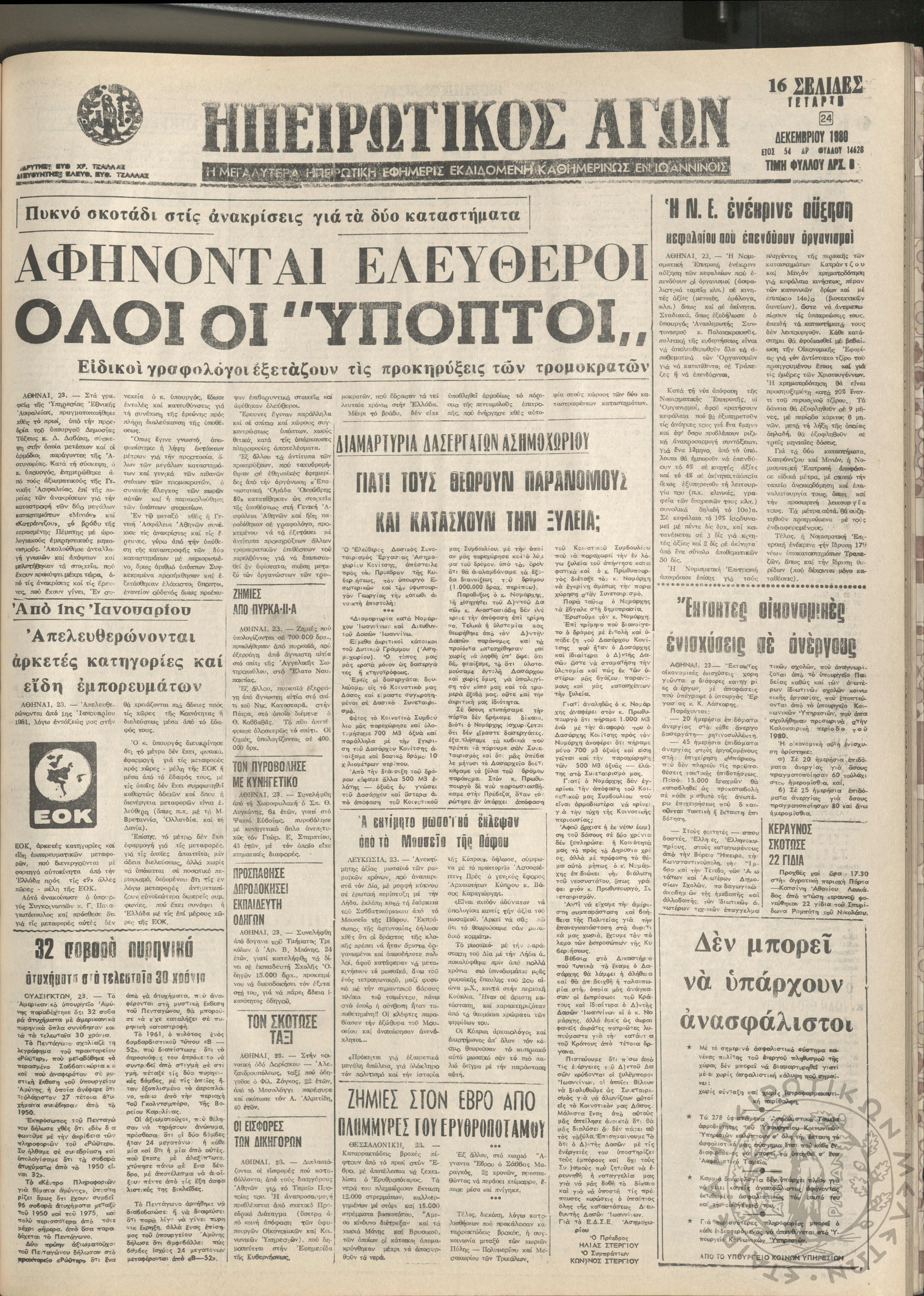 Ηπειρωτικός Αγών: η μεγαλυτέρα Ηπειρωτική εφημερίς εκδιδόμενη καθημερινώς εν Ιωαννίνοις, 1980, φ. 14624Έτος 54, φ. 14624...
