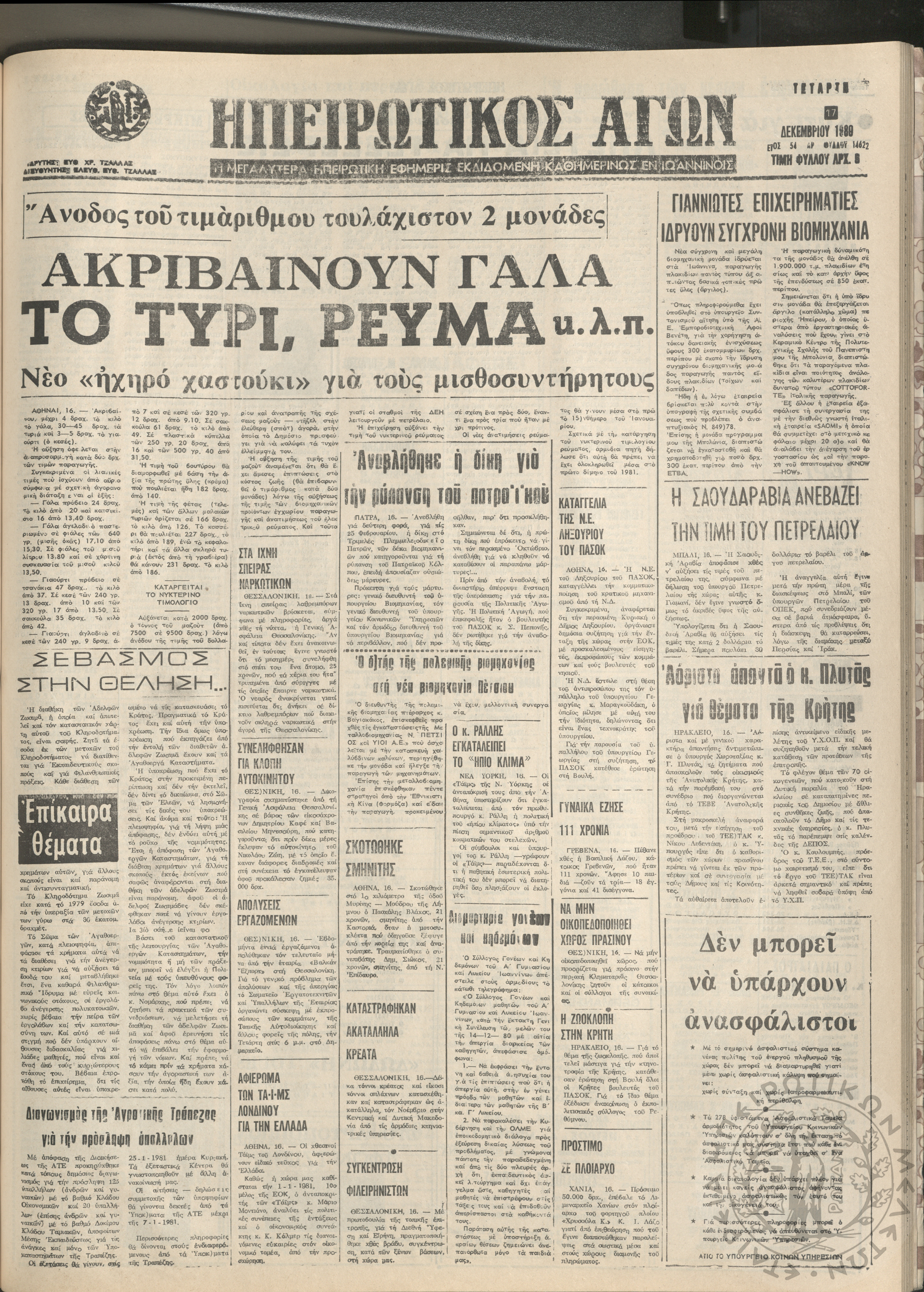 Ηπειρωτικός Αγών: η μεγαλυτέρα Ηπειρωτική εφημερίς εκδιδόμενη καθημερινώς εν Ιωαννίνοις, 1980, φ. 14617Έτος 54, φ. 14617...