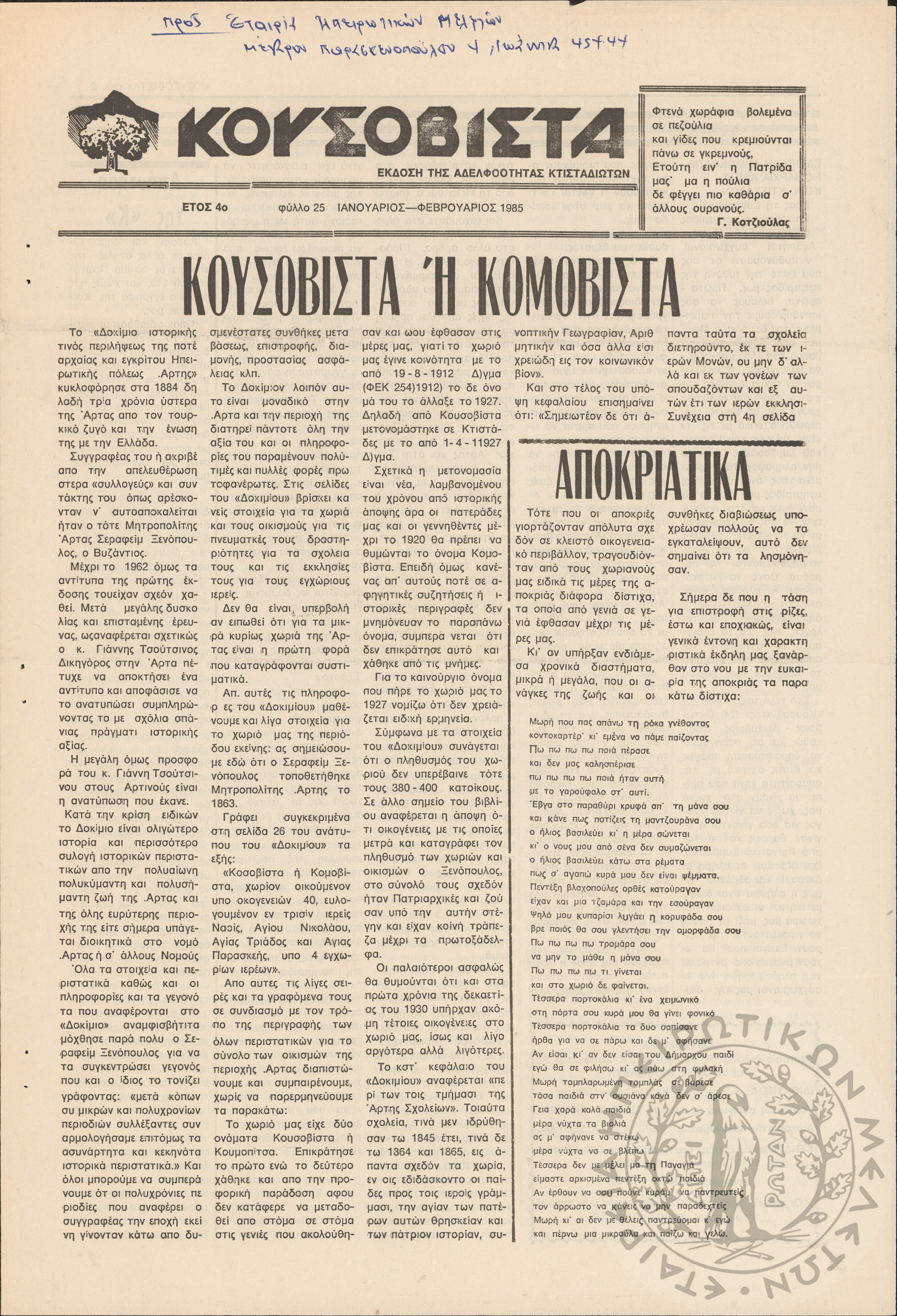 Κουσοβίστα: έκδοση της Αδελφότητας Κτισταδιωτών, 1985, φ. 25