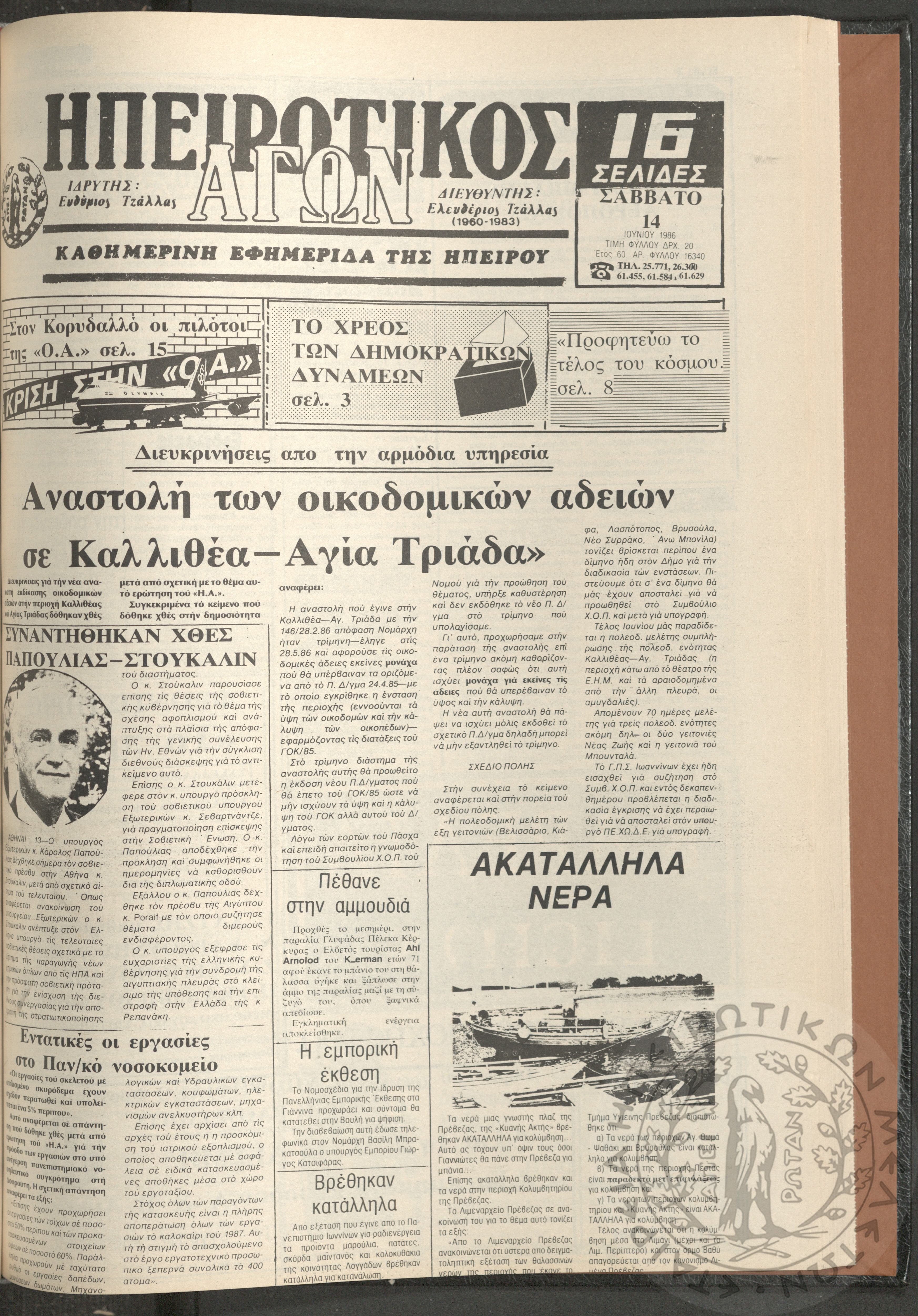 Ηπειρωτικός Αγών: καθημερινή εφημερίδα της Ηπείρου, 1986, φ. 16335