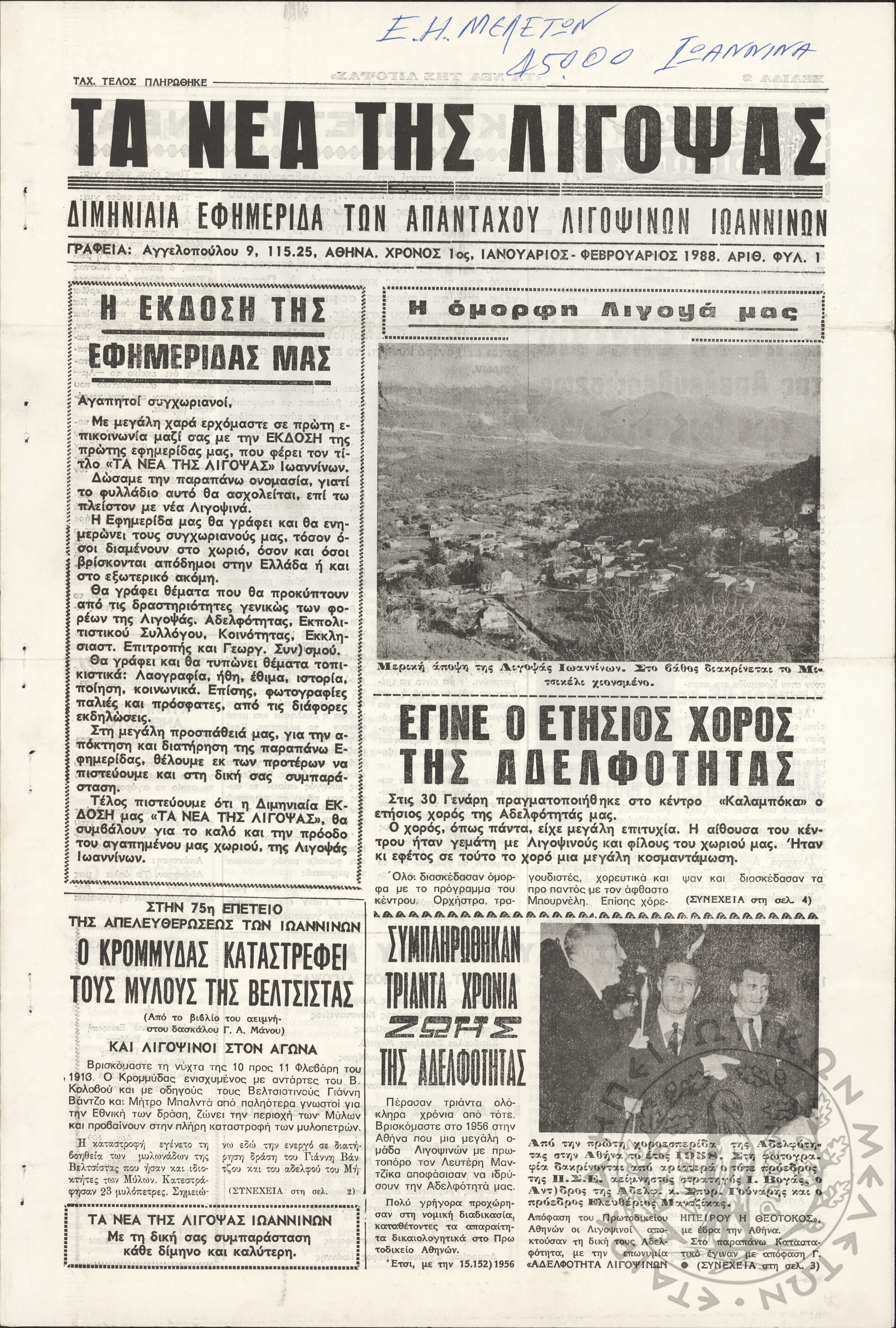Τα νέα της Λιγοψάς: διμηνιαία εφημερίδα των απανταχού Λιγοψινών Ιωαννίνων, 1988, φ. 1Έτος 1ο, αρ. φ. 1...