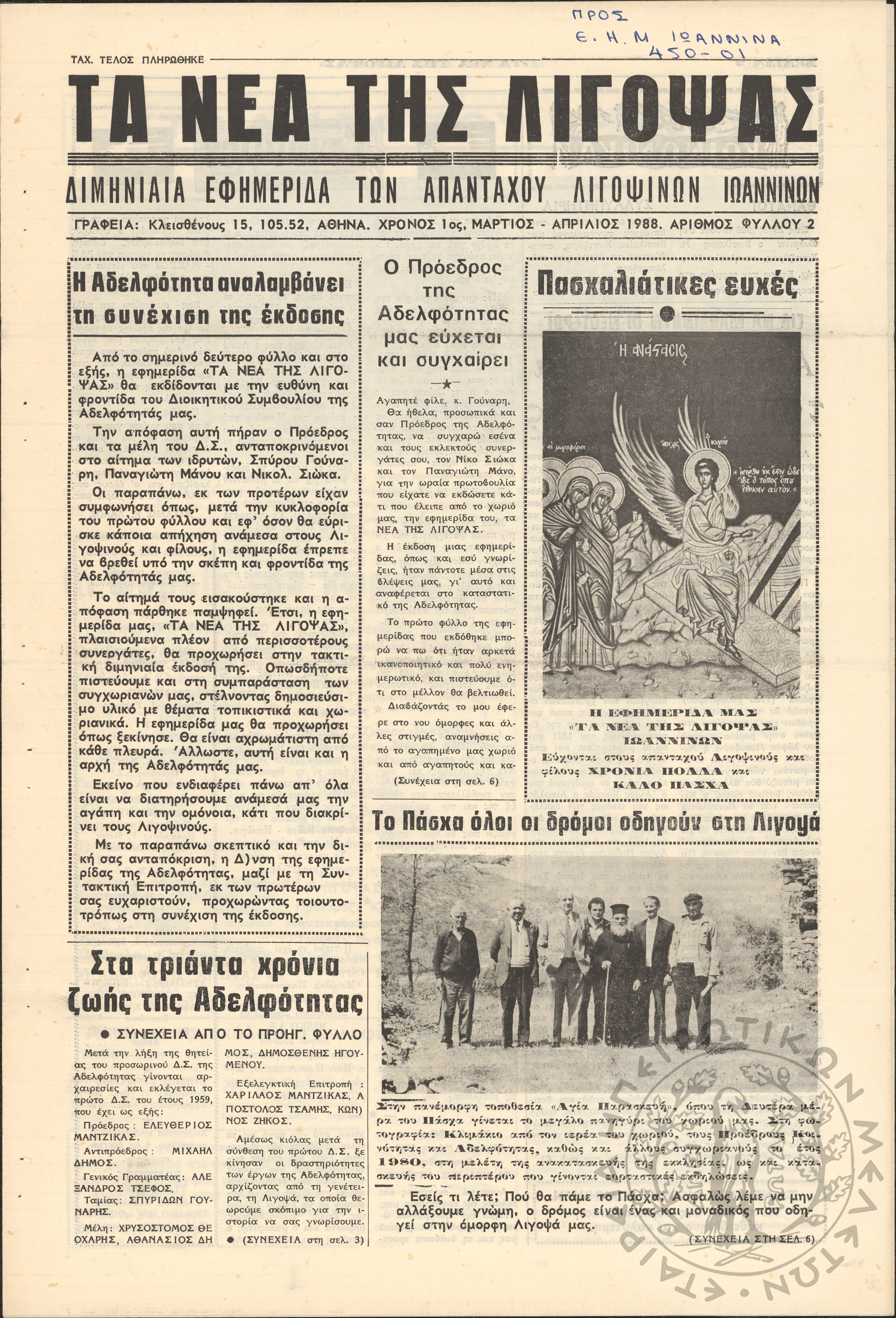 Τα νέα της Λιγοψάς: διμηνιαία εφημερίδα των απανταχού Λιγοψινών Ιωαννίνων, 1988, φ. 2Έτος 1ο, αρ. φ. 2...