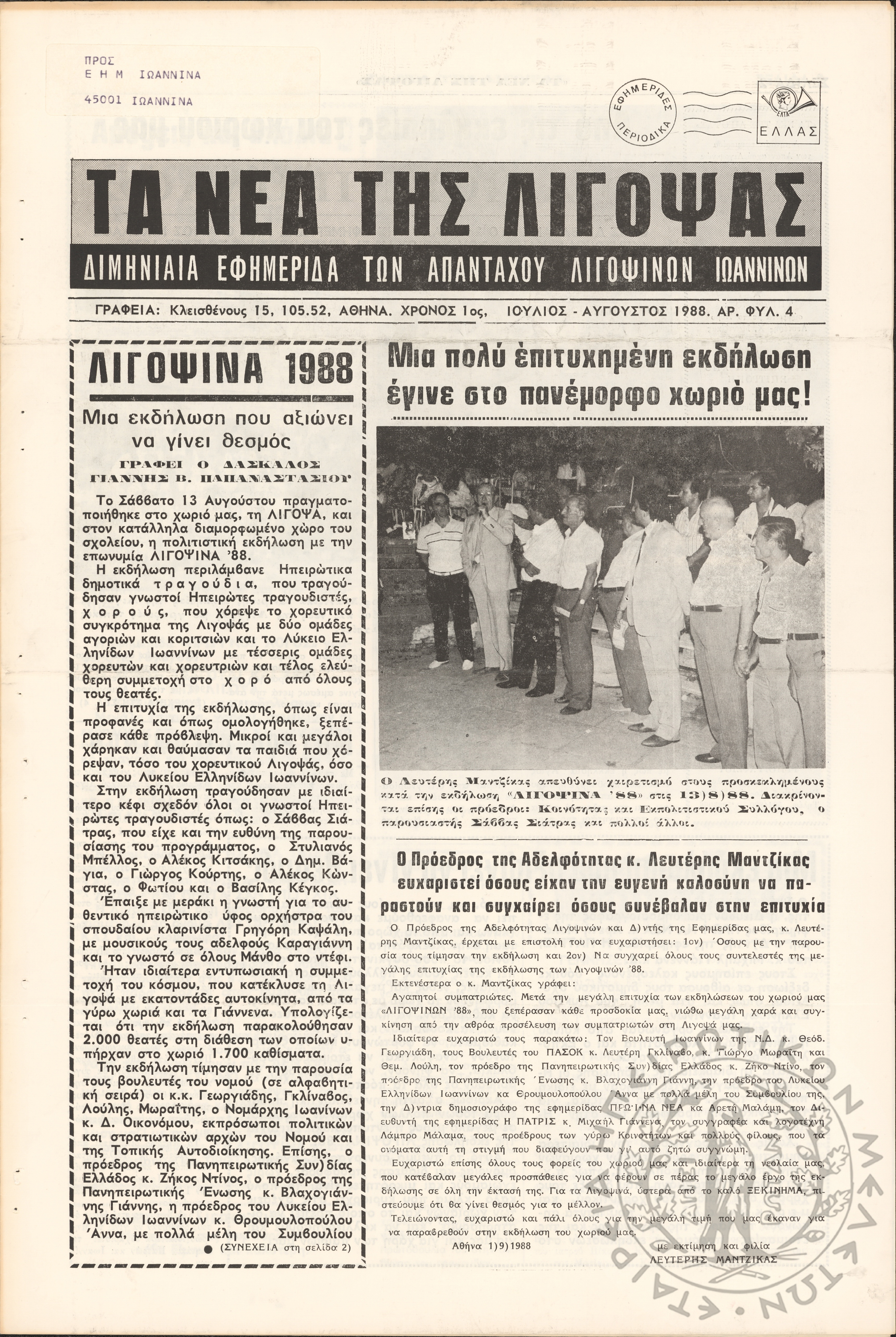 Τα νέα της Λιγοψάς: διμηνιαία εφημερίδα των απανταχού Λιγοψινών Ιωαννίνων, 1988, φ. 4Έτος 1ο, αρ. φ. 4...
