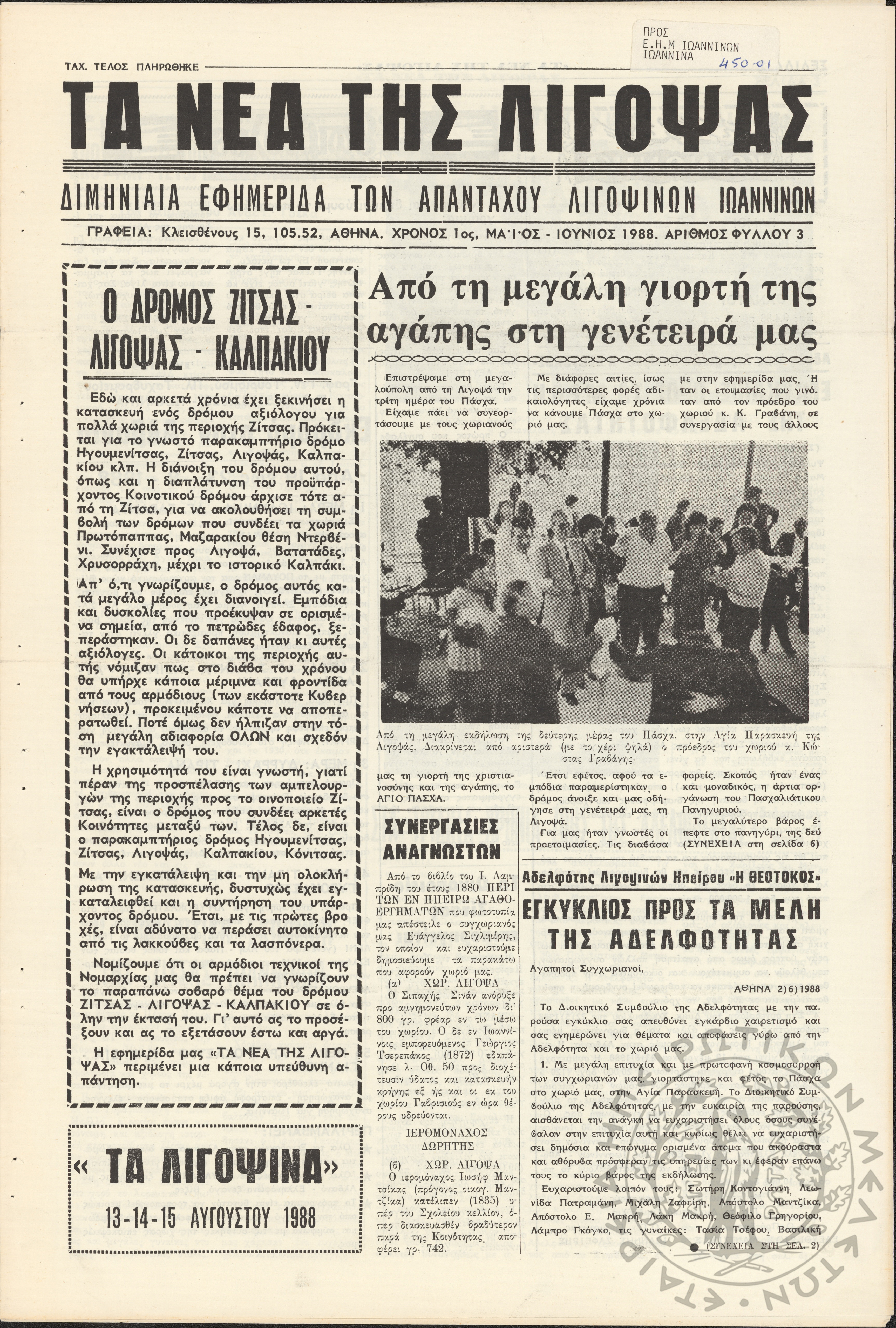Τα νέα της Λιγοψάς: διμηνιαία εφημερίδα των απανταχού Λιγοψινών Ιωαννίνων, 1988, φ. 3Έτος 1ο, αρ. φ. 3...