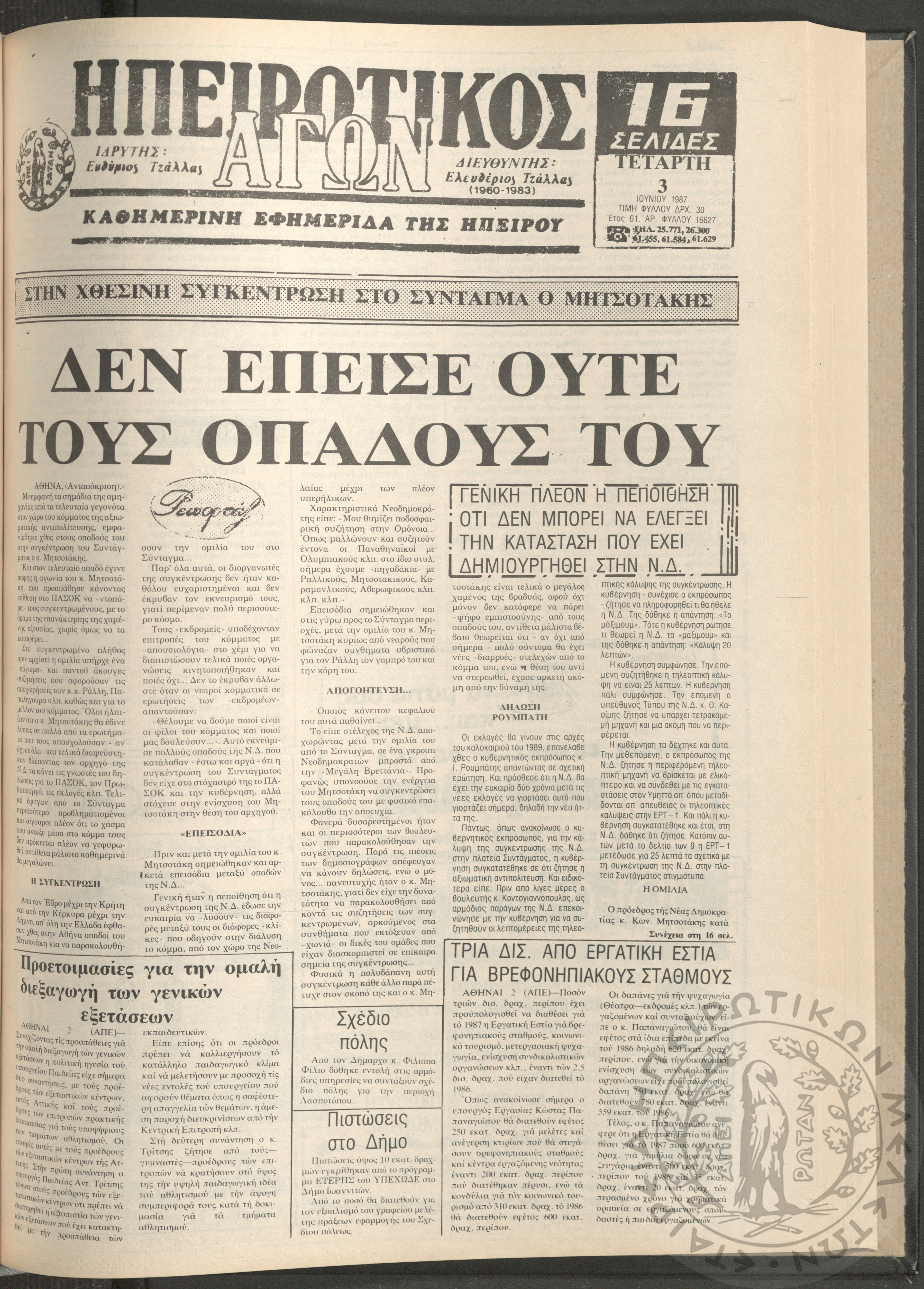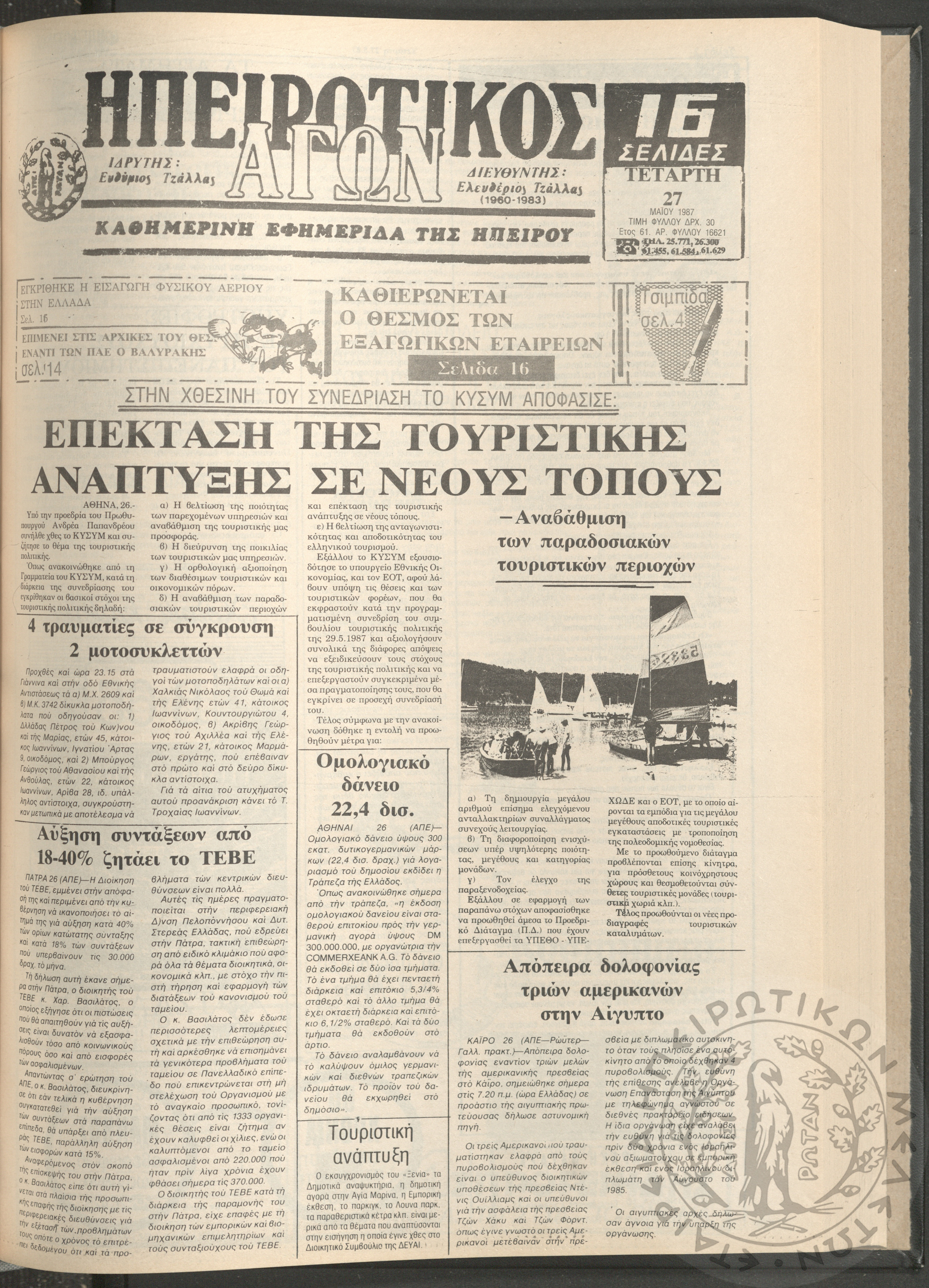 Ηπειρωτικός Αγών: καθημερινή εφημερίδα της Ηπείρου, 1987, φ. 16627