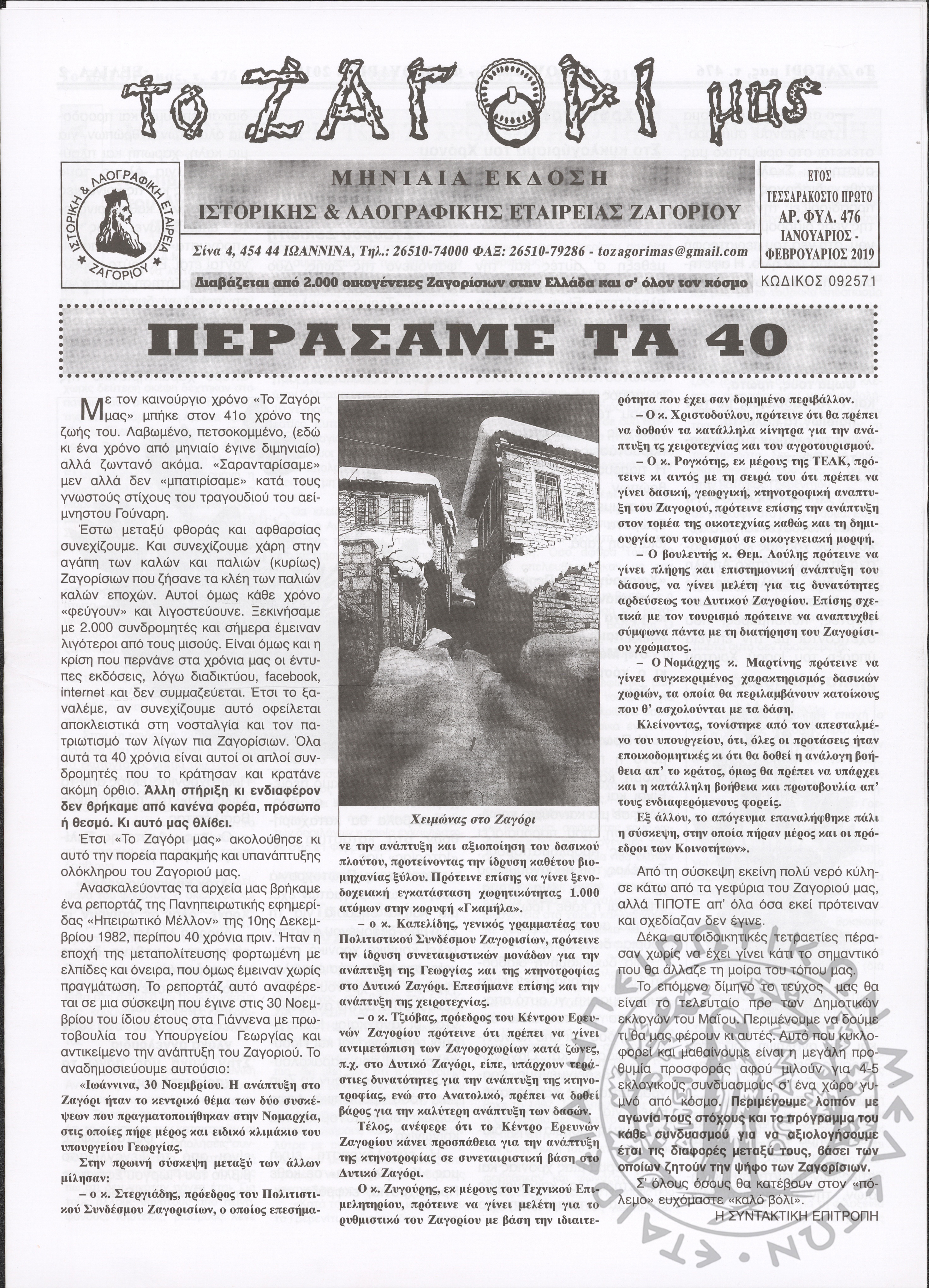 Το Ζαγόρι μας: μηνιαία έκδοση Ιστορικής και Λαογραφικής Εταιρείας Ζαγορίου (φ. 476)Έτος 41o, φ. 476...