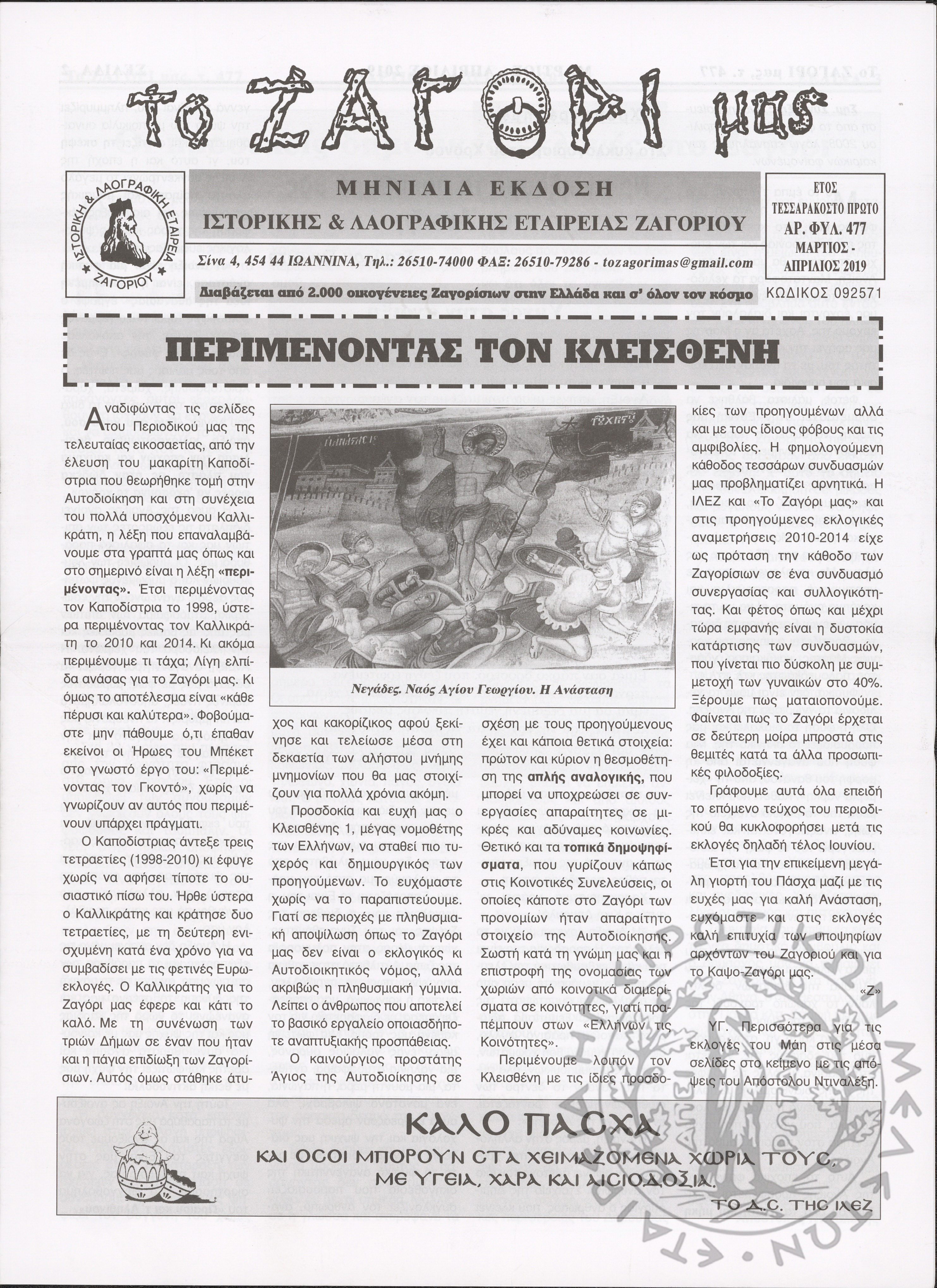 Το Ζαγόρι μας: μηνιαία έκδοση Ιστορικής και Λαογραφικής Εταιρείας Ζαγορίου (φ. 477)Έτος 41o, φ. 477...