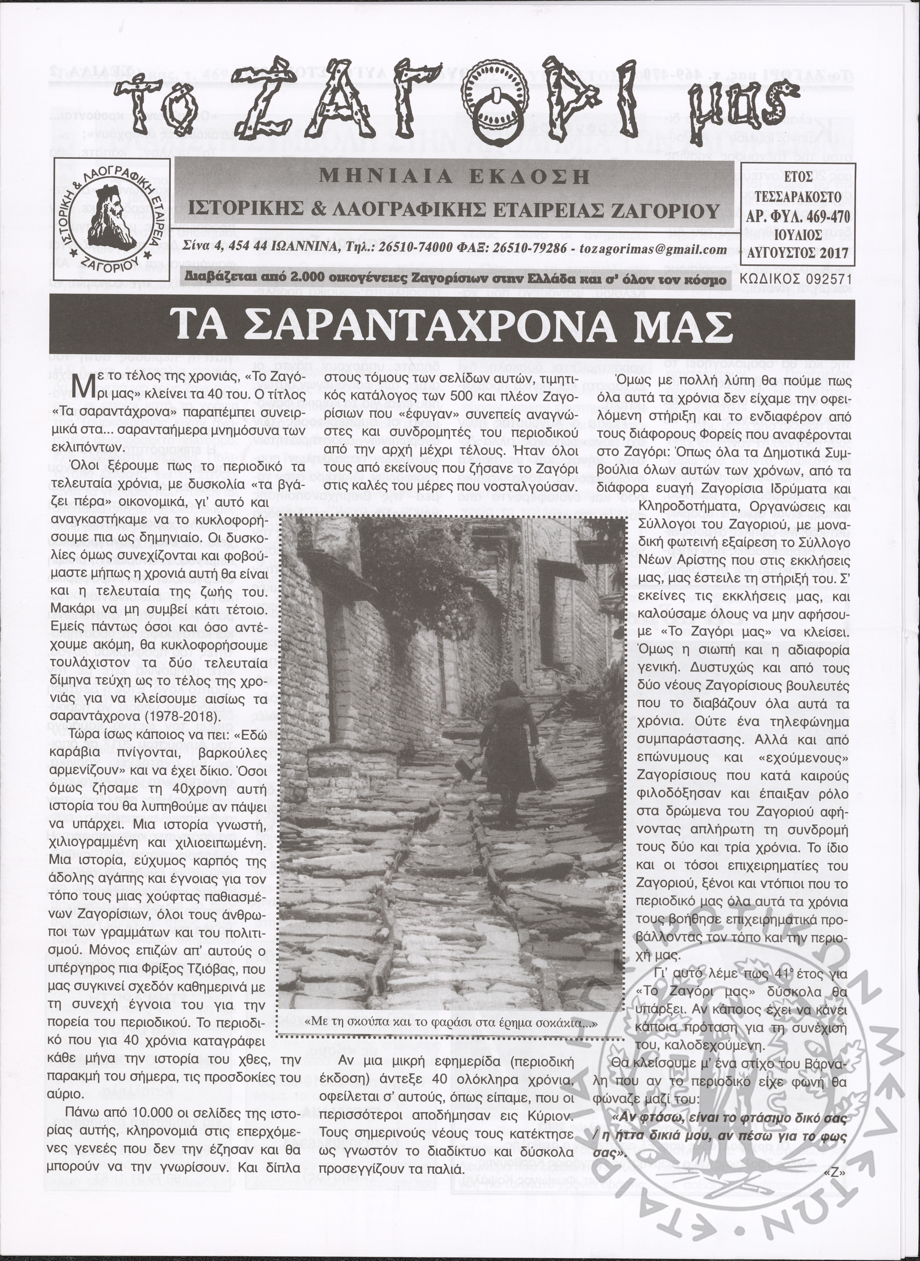 Το Ζαγόρι μας: μηνιαία έκδοση Ιστορικής και Λαογραφικής Εταιρείας Ζαγορίου (φ. 469-470)Έτος 40o, φ. 469-470...