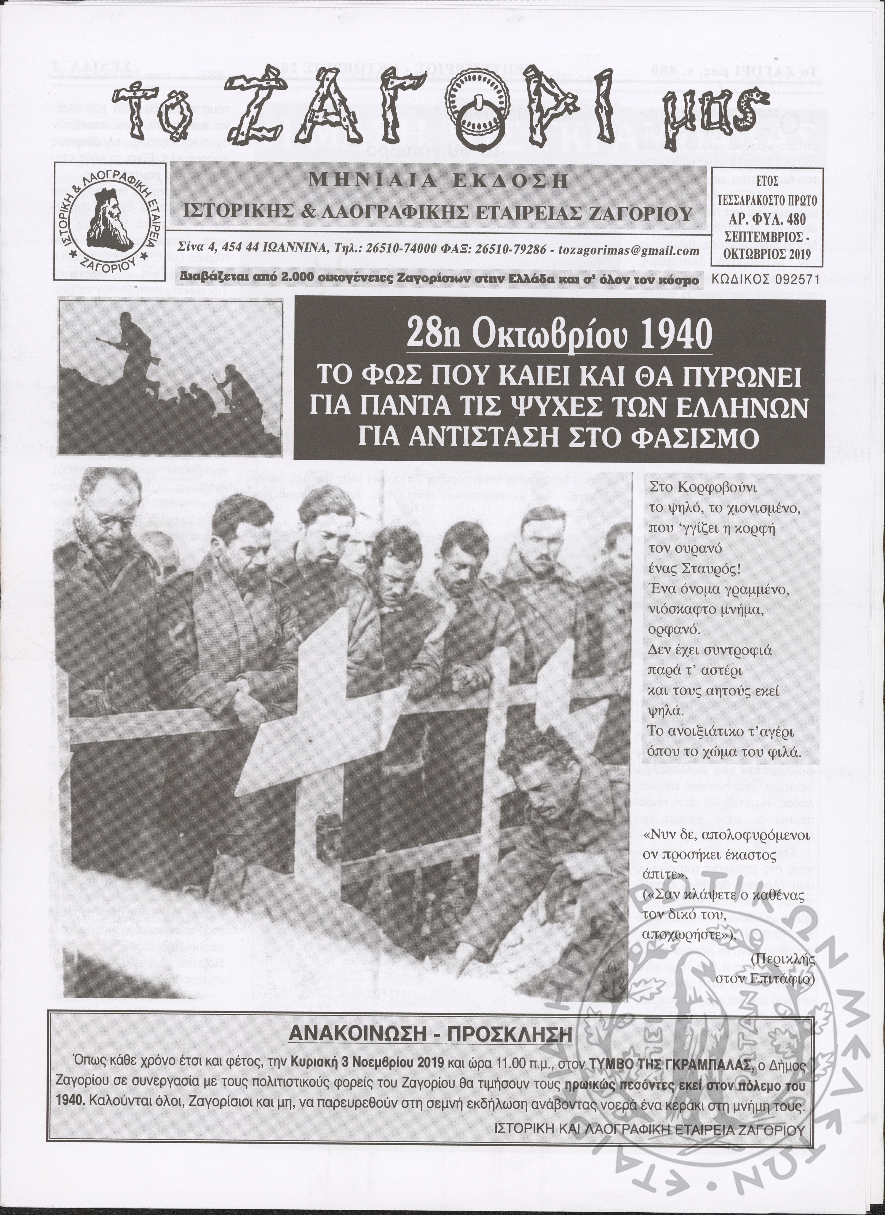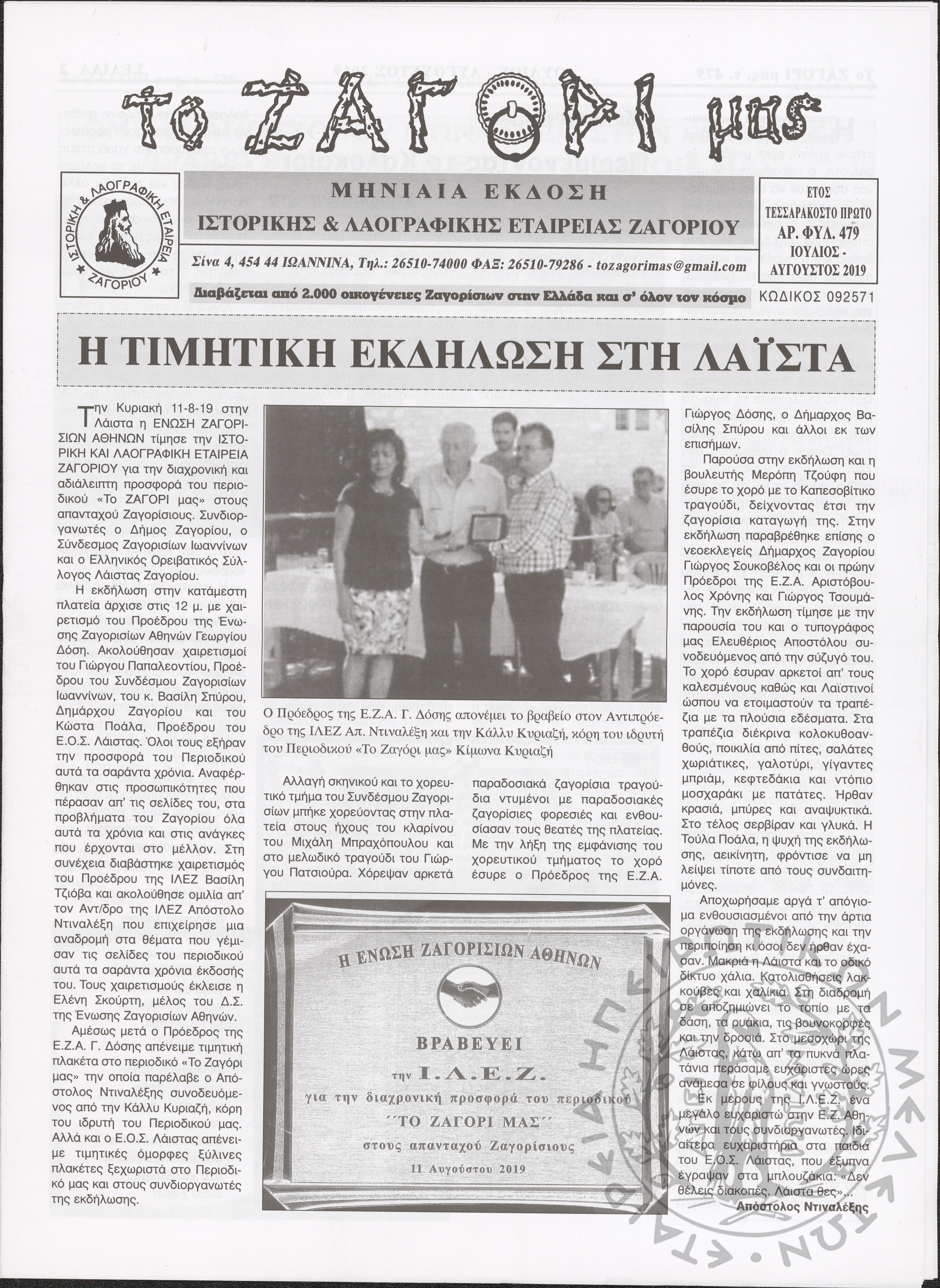 Το Ζαγόρι μας: μηνιαία έκδοση Ιστορικής και Λαογραφικής Εταιρείας Ζαγορίου (φ. 479)Έτος 41o, φ. 479...