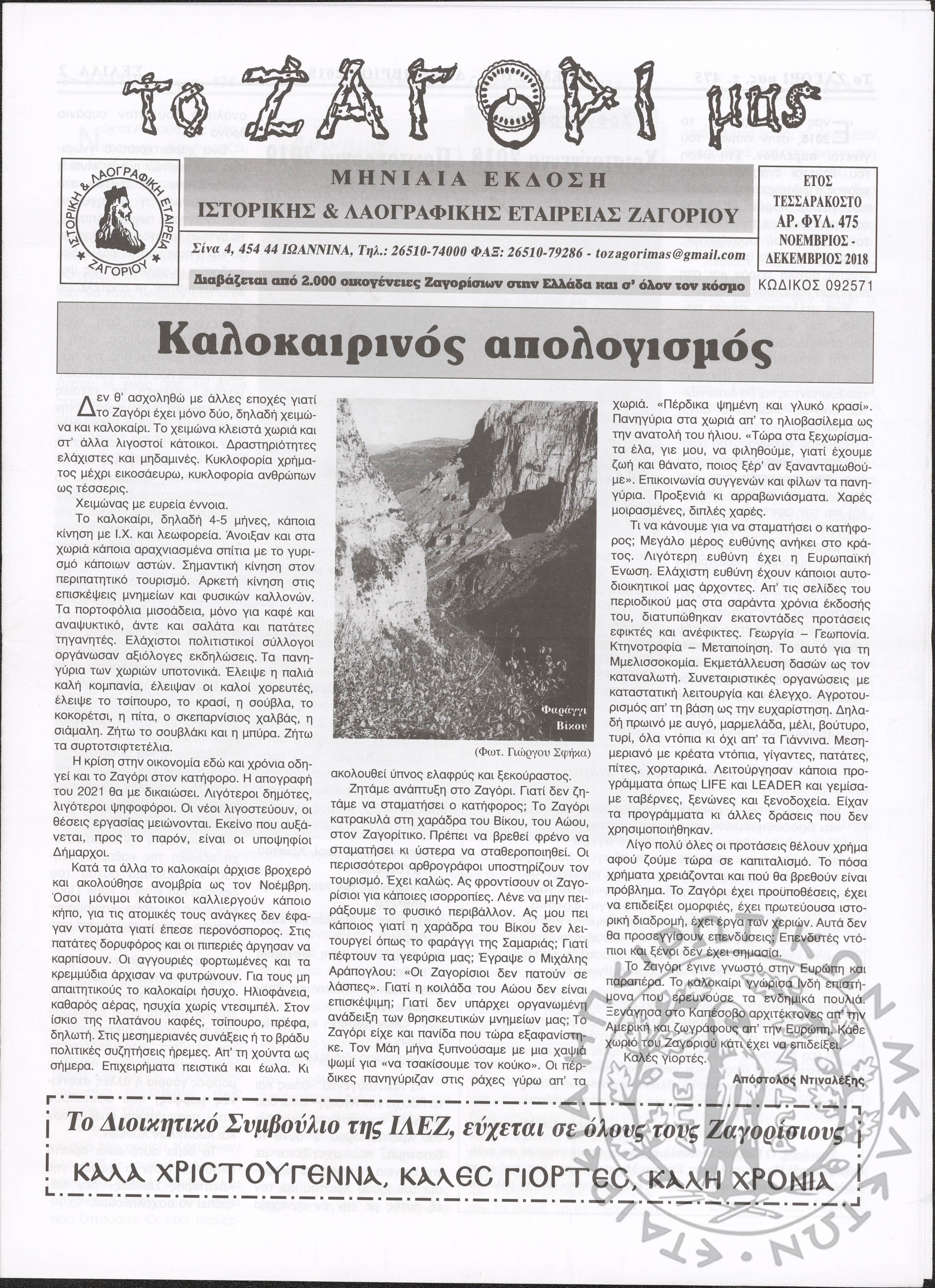 Το Ζαγόρι μας: μηνιαία έκδοση Ιστορικής και Λαογραφικής Εταιρείας Ζαγορίου (φ. 475)Έτος 40o, φ. 475...