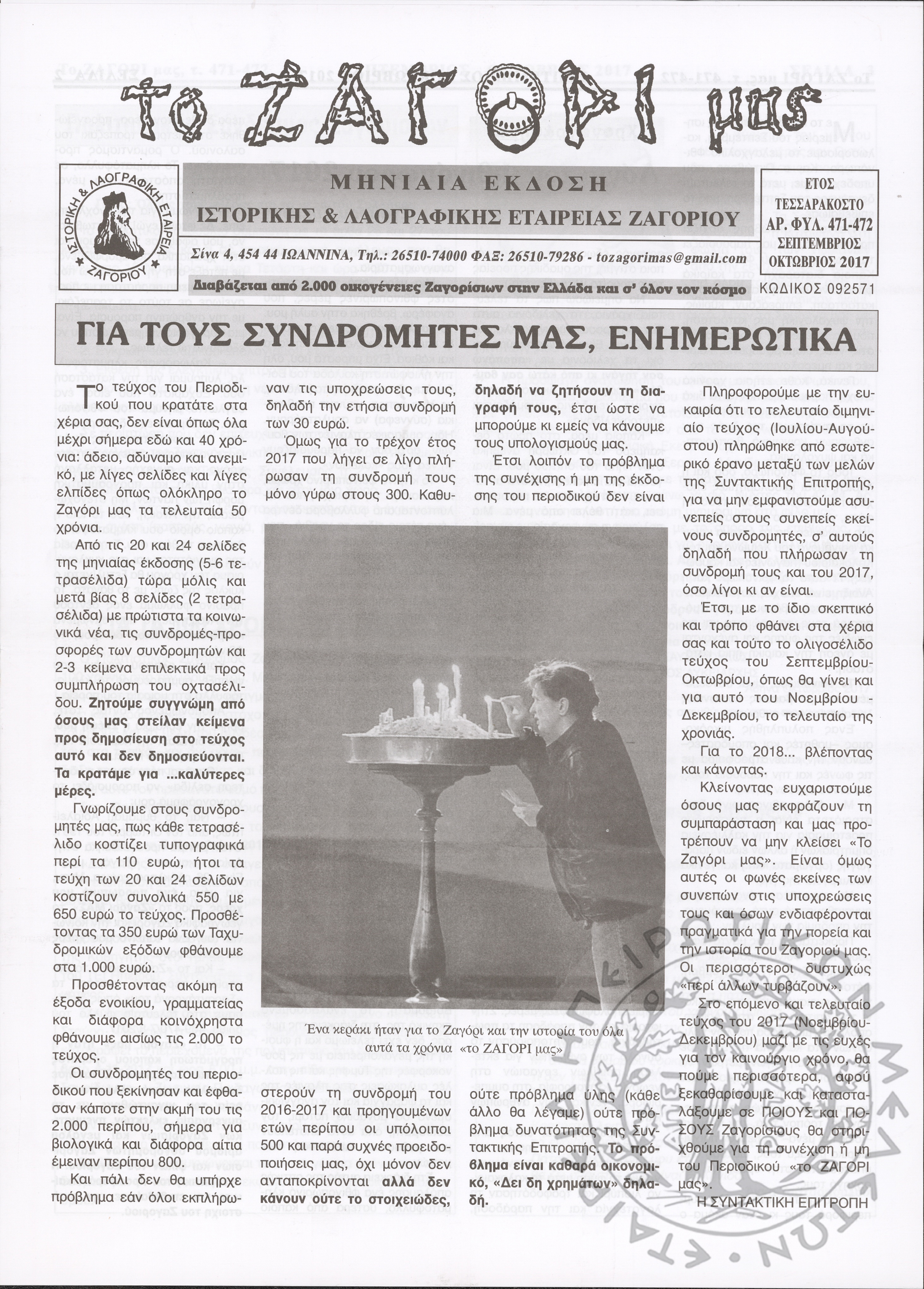 Το Ζαγόρι μας: μηνιαία έκδοση Ιστορικής και Λαογραφικής Εταιρείας Ζαγορίου (φ. 472)Έτος 40o, φ. 472...